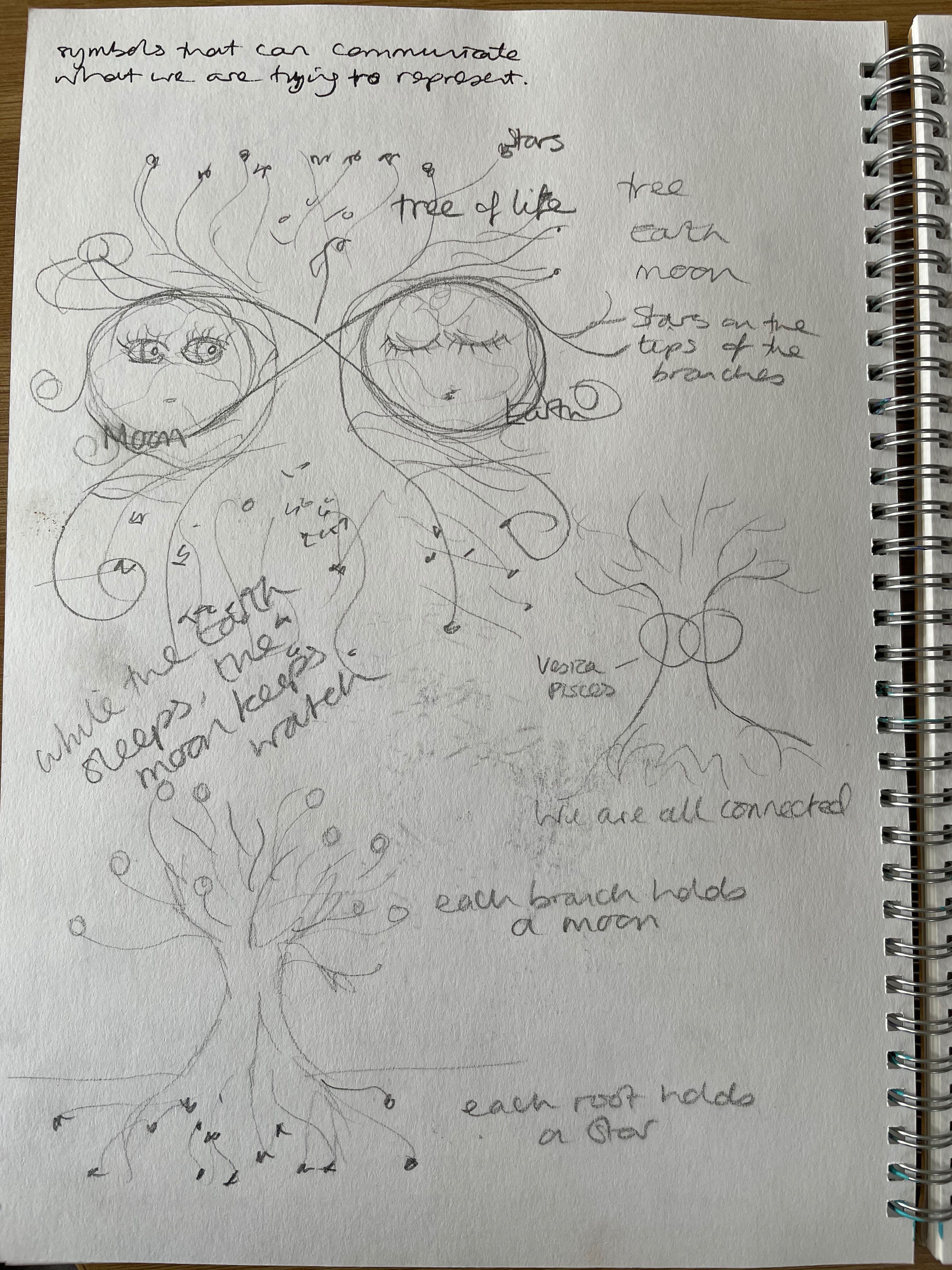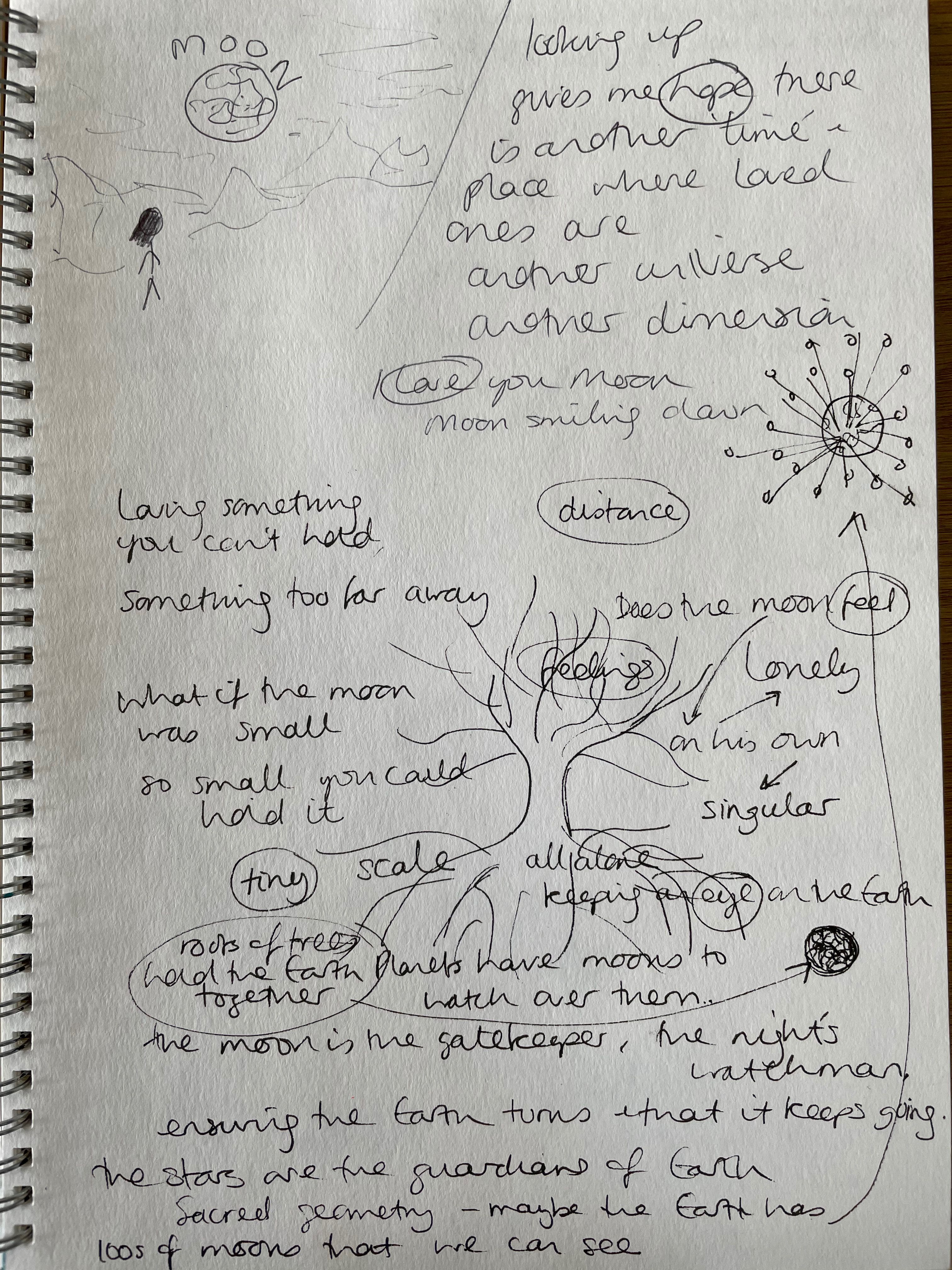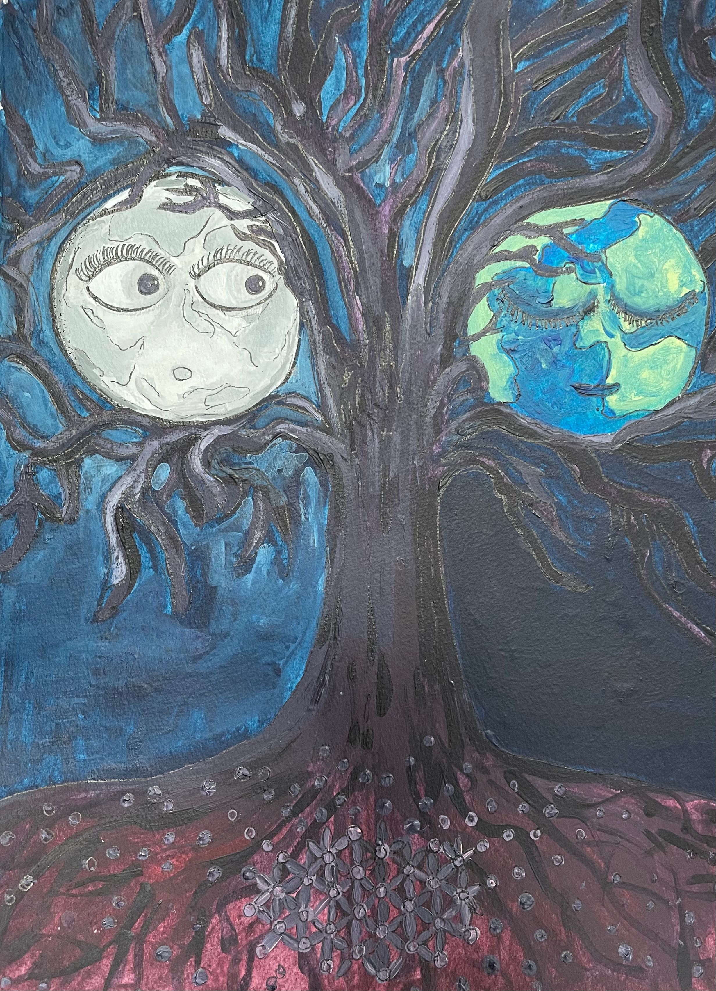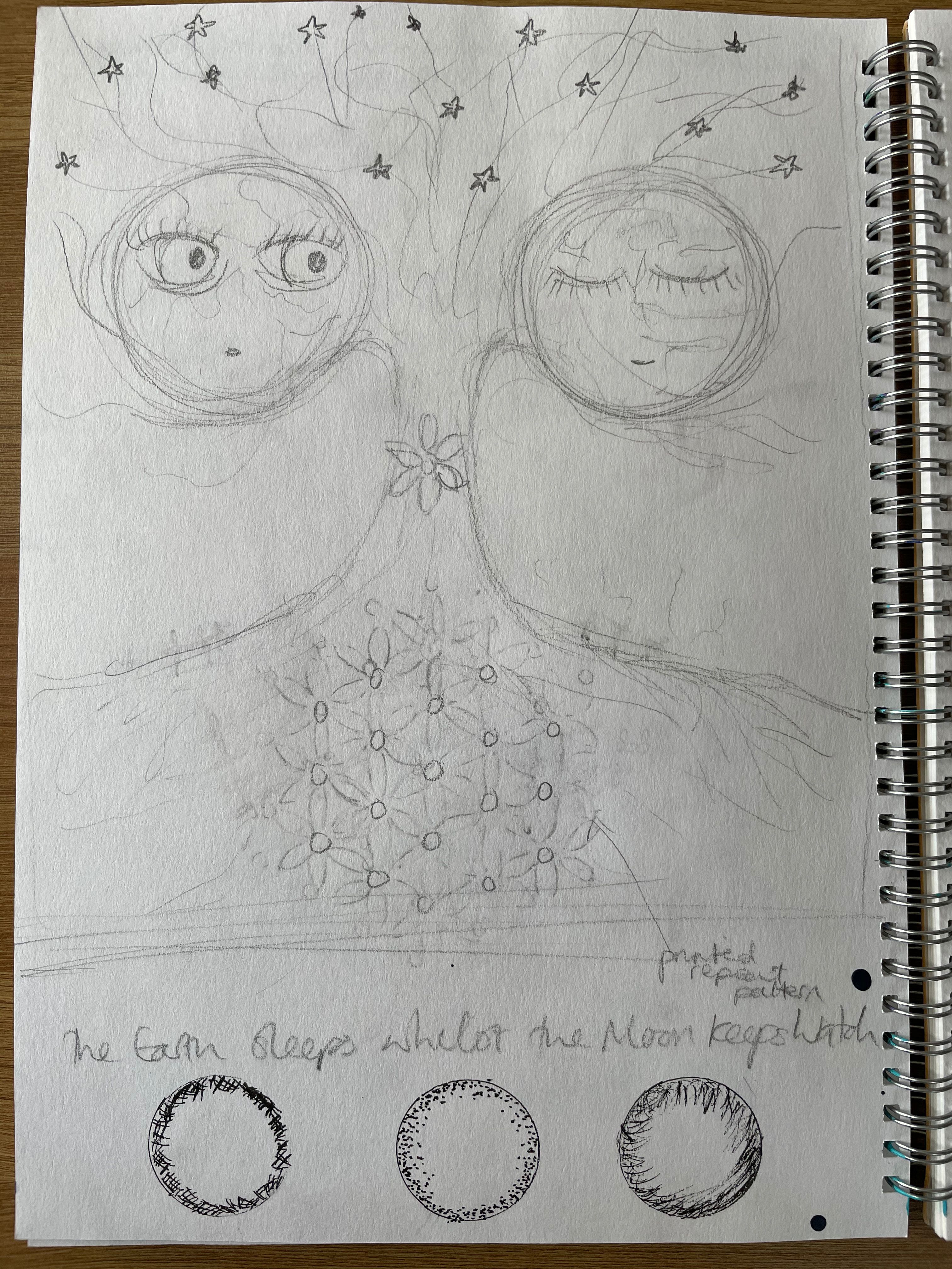 For this illustration I started thinking about the moon as I've spent a lot of time recently looking up at the moon & imagining another time & place where departed loved ones might be... another universe, another dimension. I look up at the moon & it gives me hope; the moon smiles down on us. This developed into an idea that the moon watches over us, like a nights watchman, he stays awake whilst we sleep, keeping an eye on the Earth. I imagined the universe as a gigantic Tree of Life, holding the Earth and moon; intertwined, we are all connected.