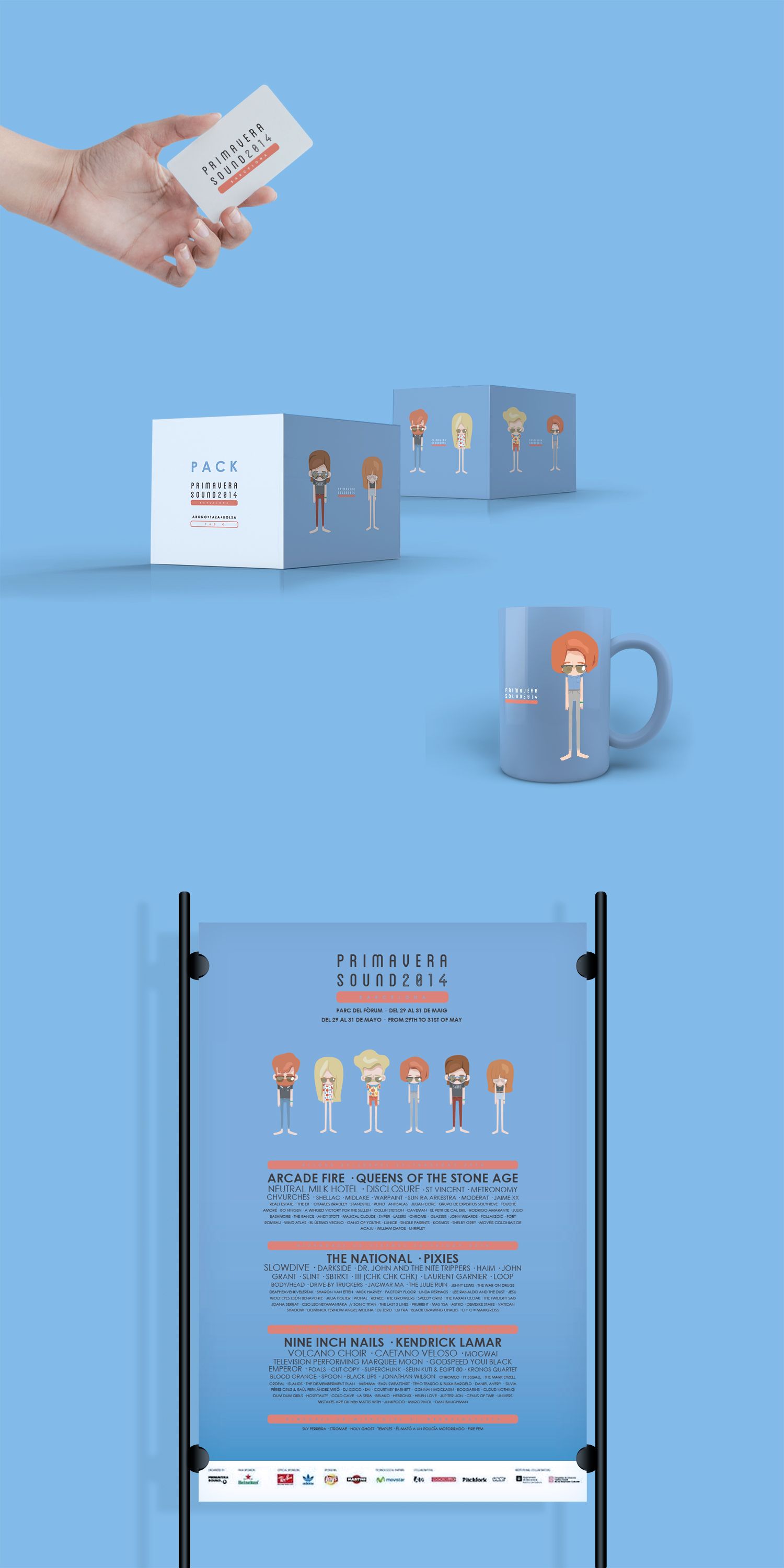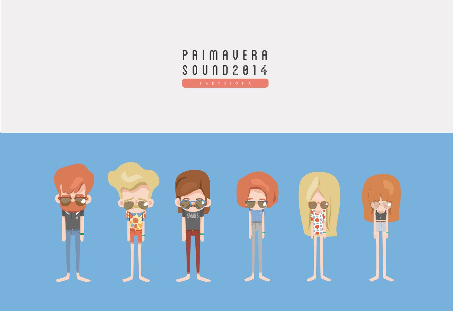 El Primavera Sound es un festival de música independiente que se celebra en Barcelona desde el 2001 al que asisten miles de personas de todas las partes del mundo. Es un festival que busca la calidad y apuesta tanto por artistas consagrados como por artistas noveles. Mediante estos personajes quiero representar el público asistente a este evento. Suele tener una estética bastante definida que he querido plasmar en ellos, alternativos, actuales y con pasión por la música. El color escogido para el fondo es un azul intenso del cielo, ya que los conciertos son al aire libre y empiezan por la tarde.