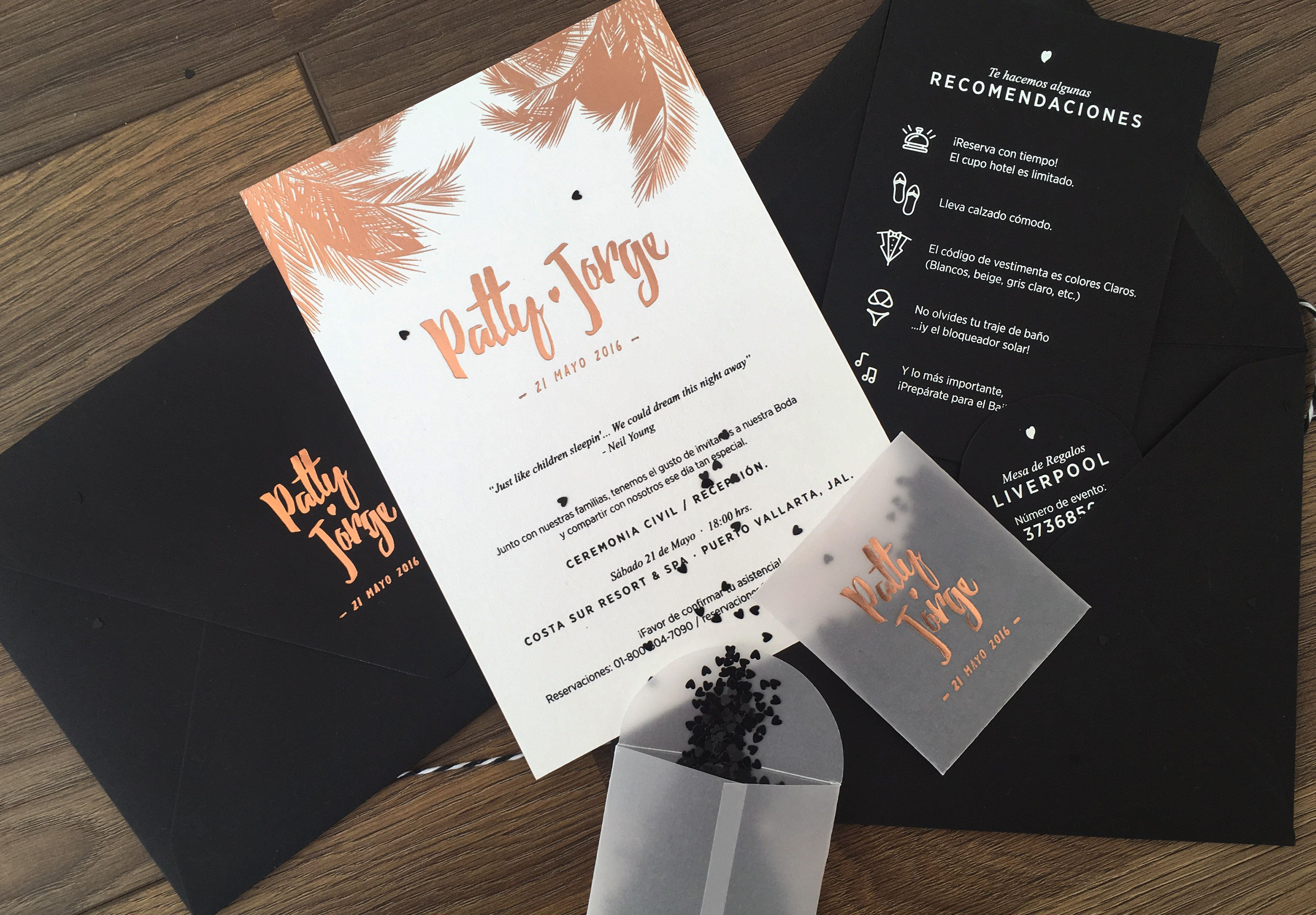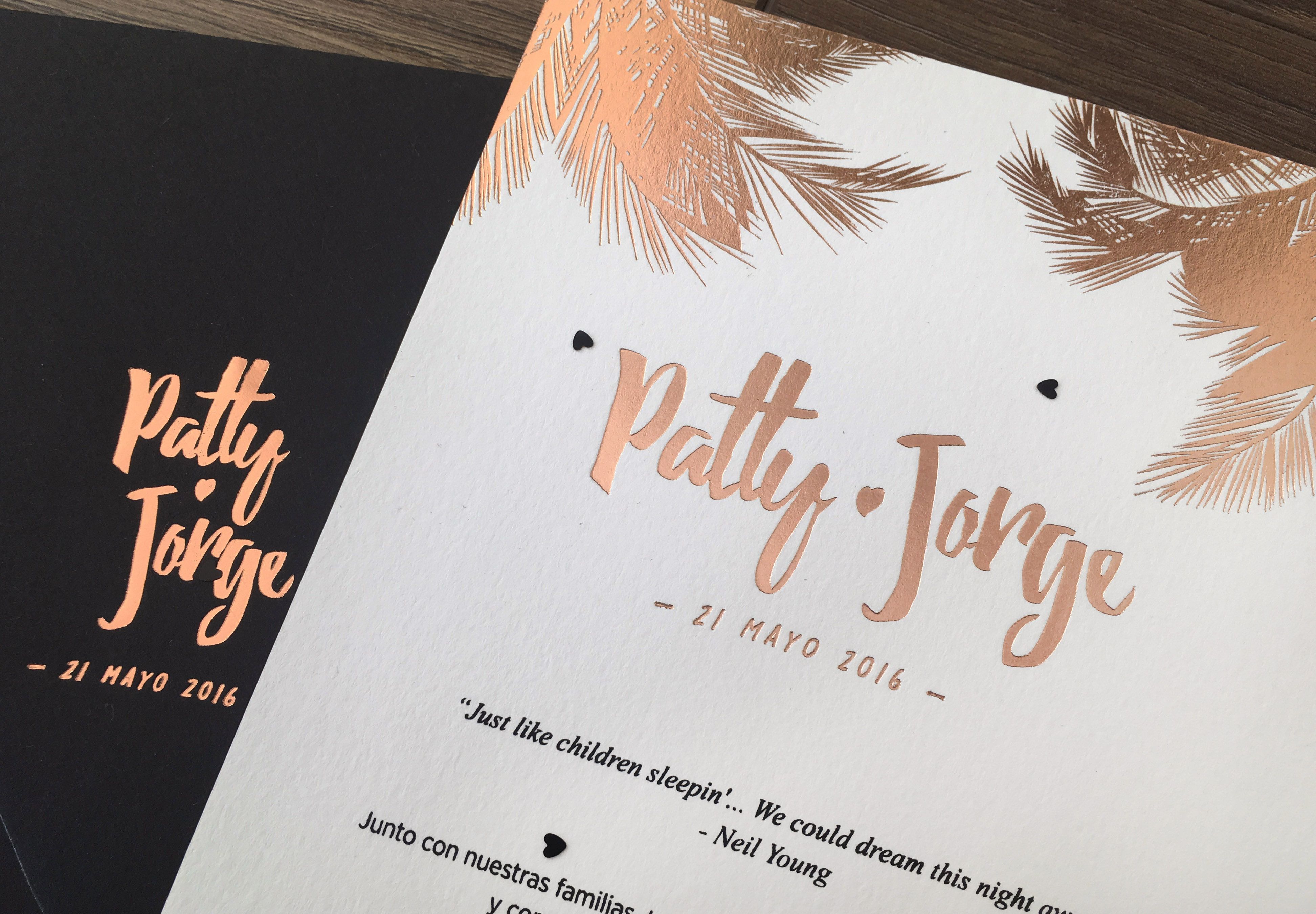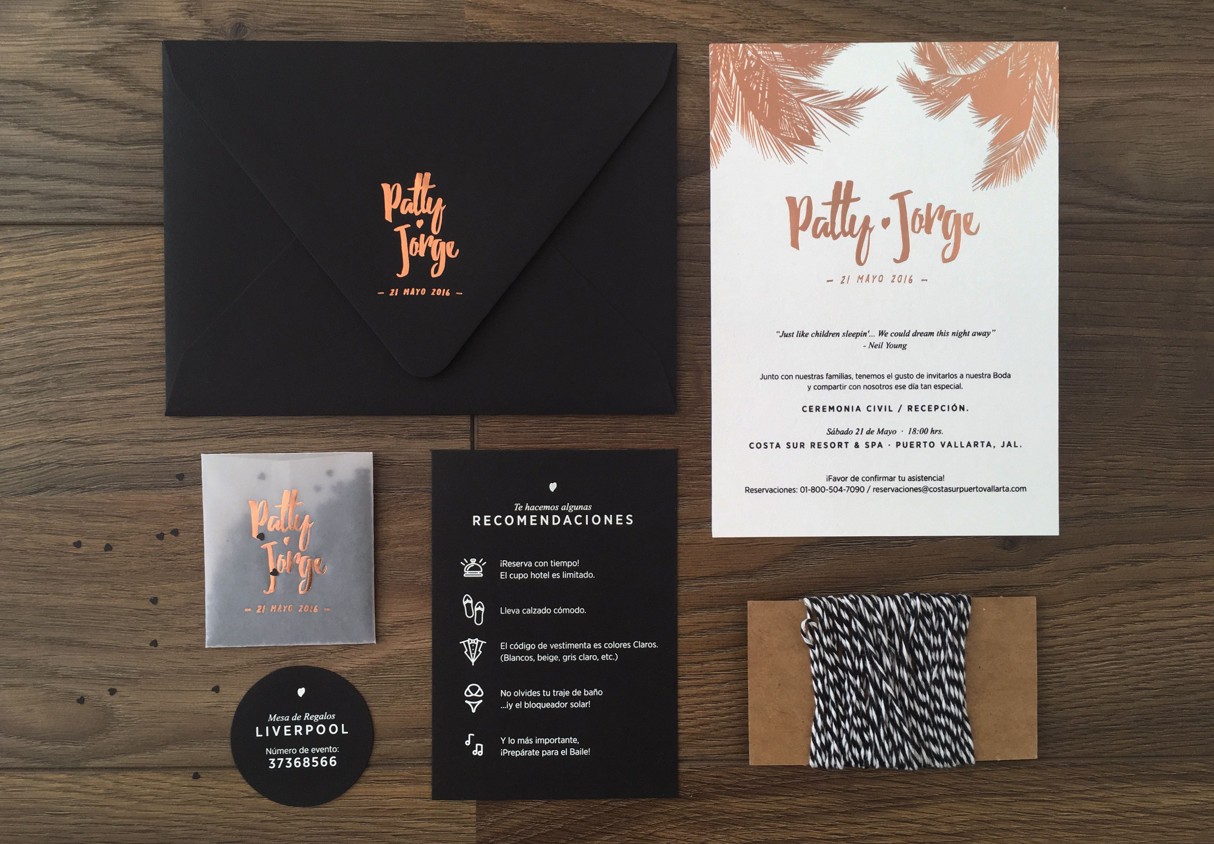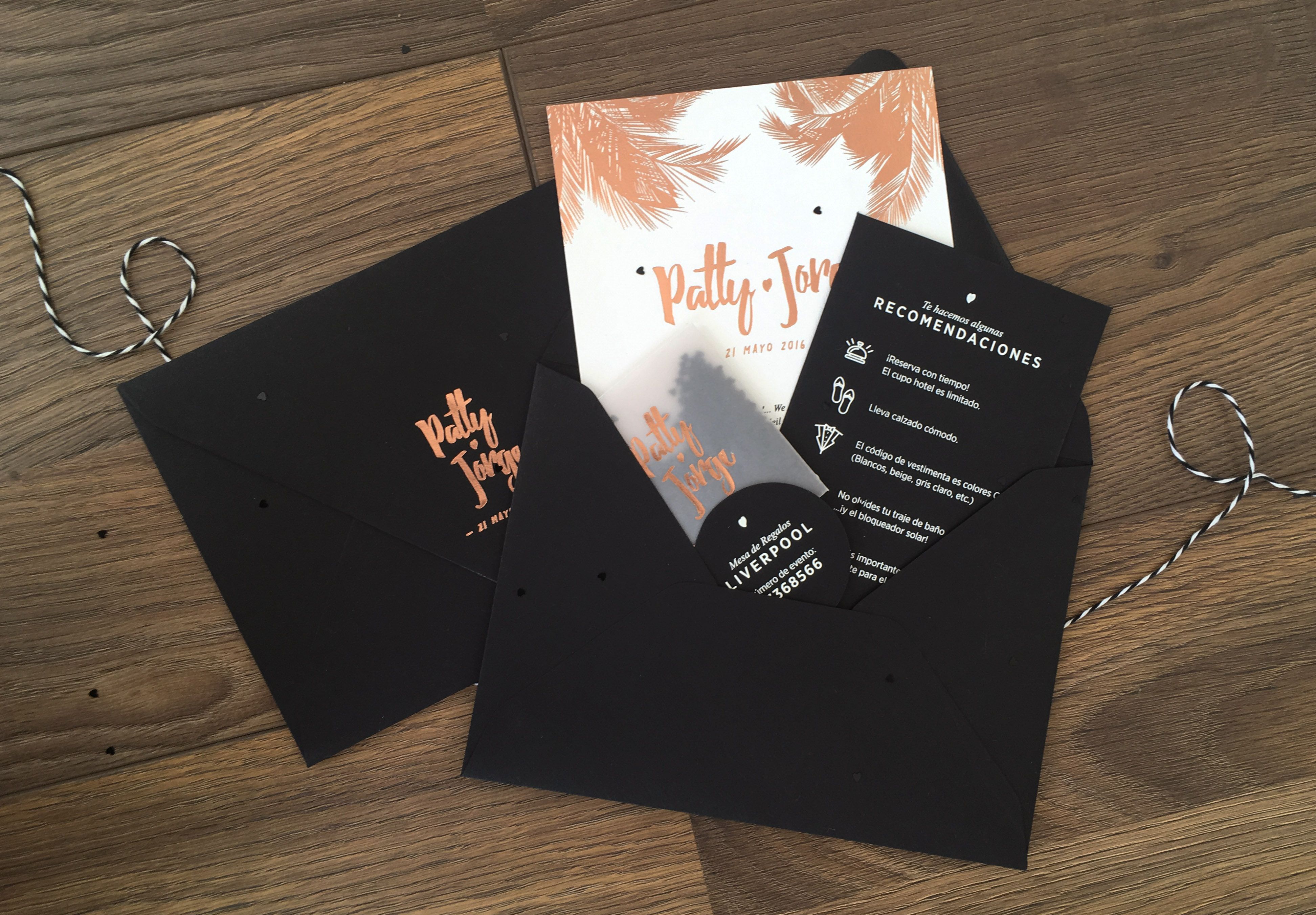 Patty y Jorge son unos novios poco convencionales que festejaron su boda en la playa, para ello nos solicitaron unas invitaciones unas invitaciones fuera de los estereotipos tradicionales.