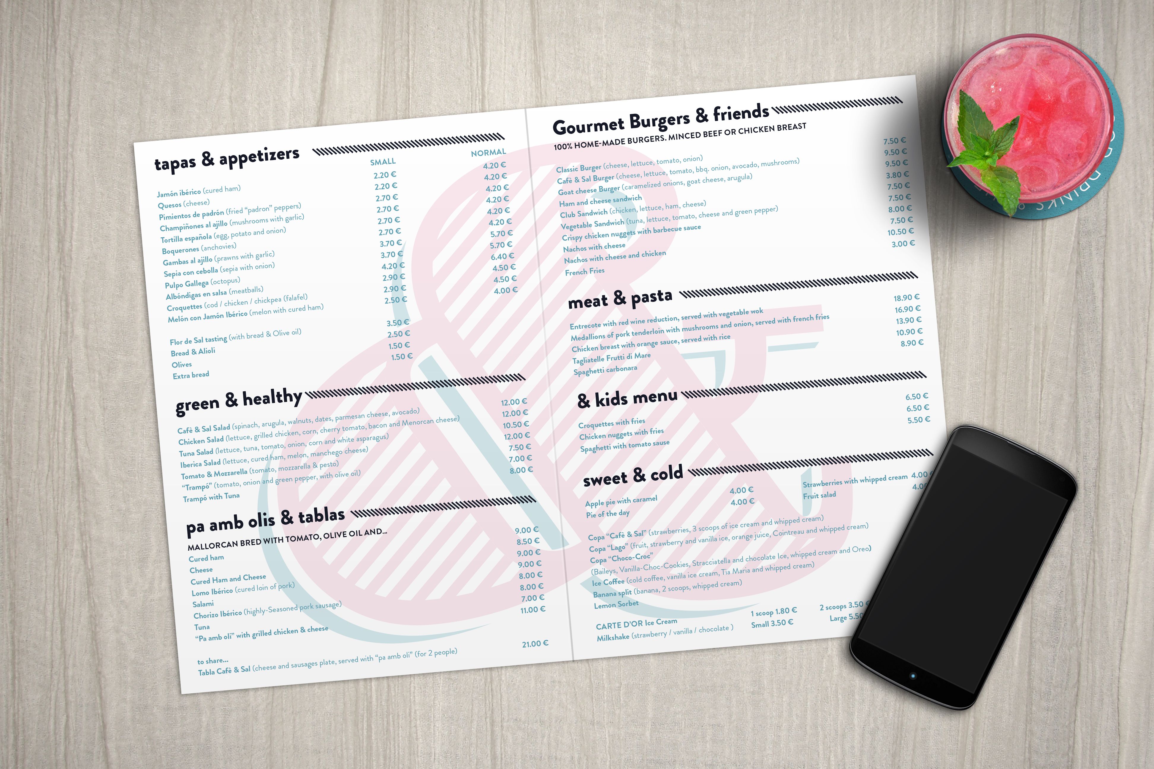 «Y», o en este caso «&» es la conjunción más usada en la lengua coloquial. El uso de esta conjunción copulativa se mantiene en la lengua popular de las narraciones y como recurso expresivo intensificador. Todos sabemos que después de una «&» siempre encontramos alguna cosa más, y esto es precisamente lo que ofrece Cafè &Sal.