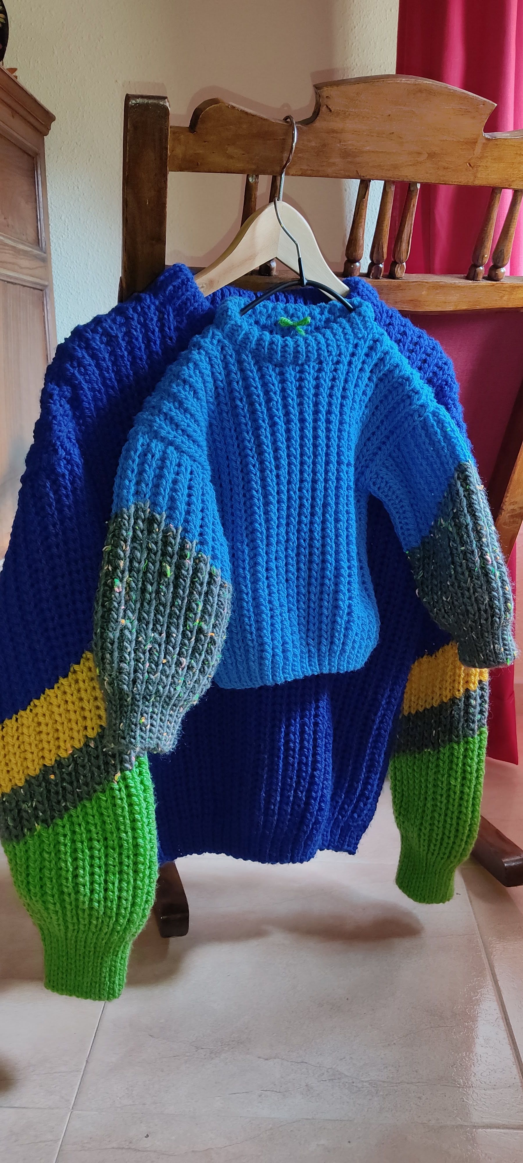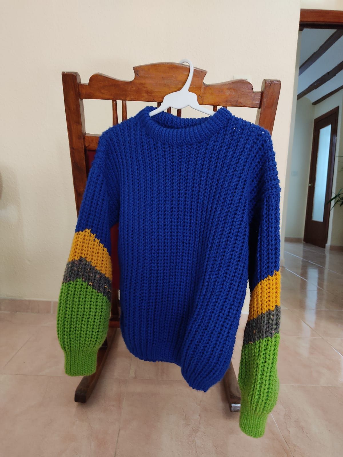 @lopezmarianne954 Hola utilicé 6 azules, 1 verde, media de amarillo y media de gris, mis ovillos son de 100gr=165m y utilicé una aguja de 7mm