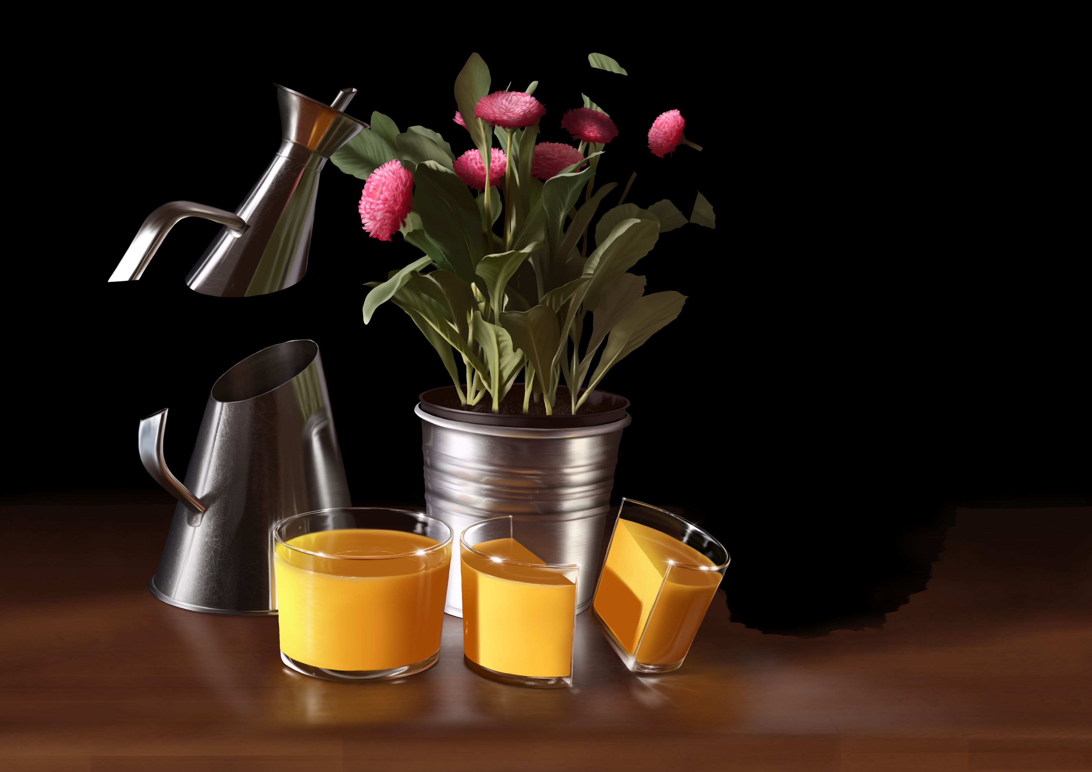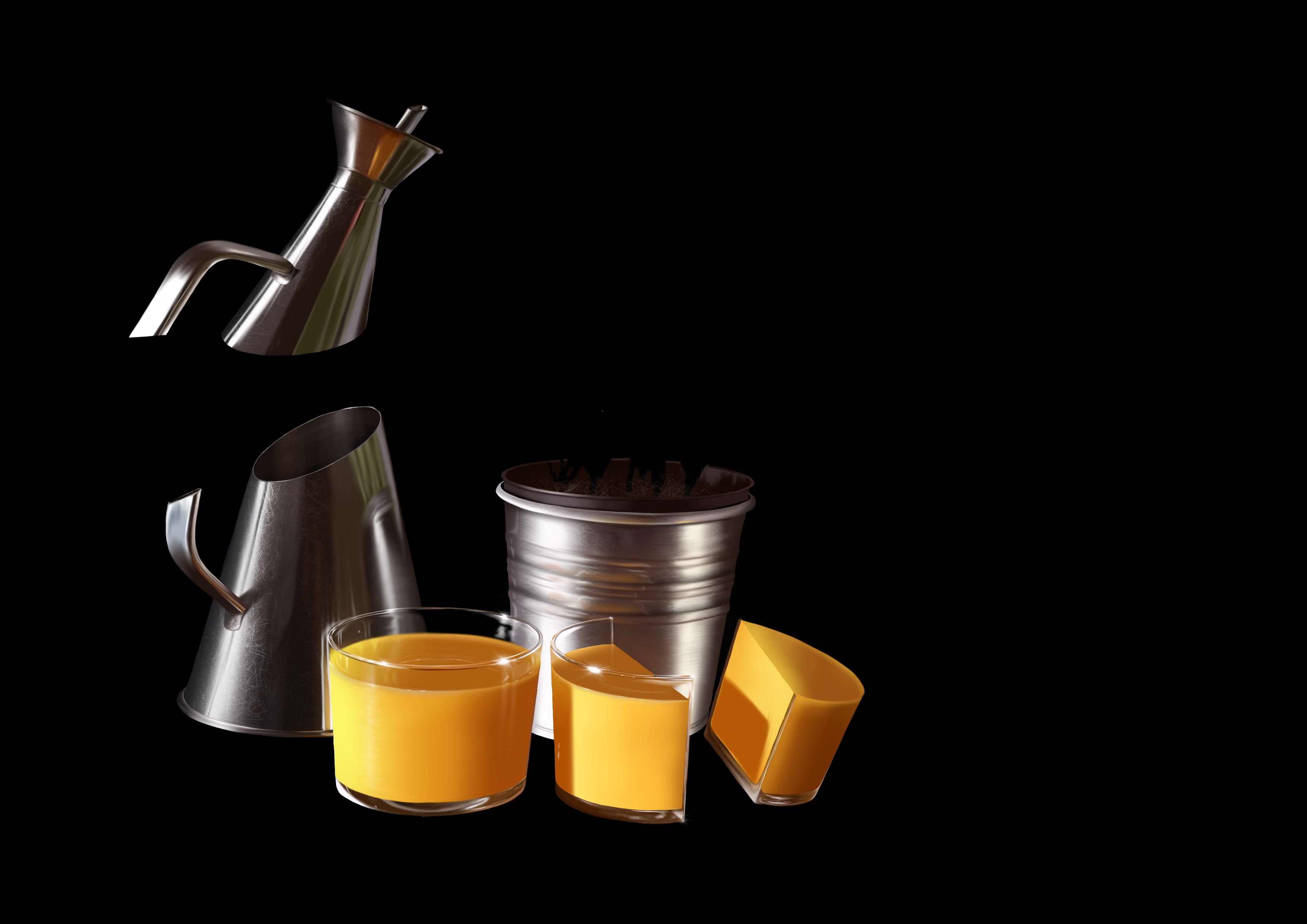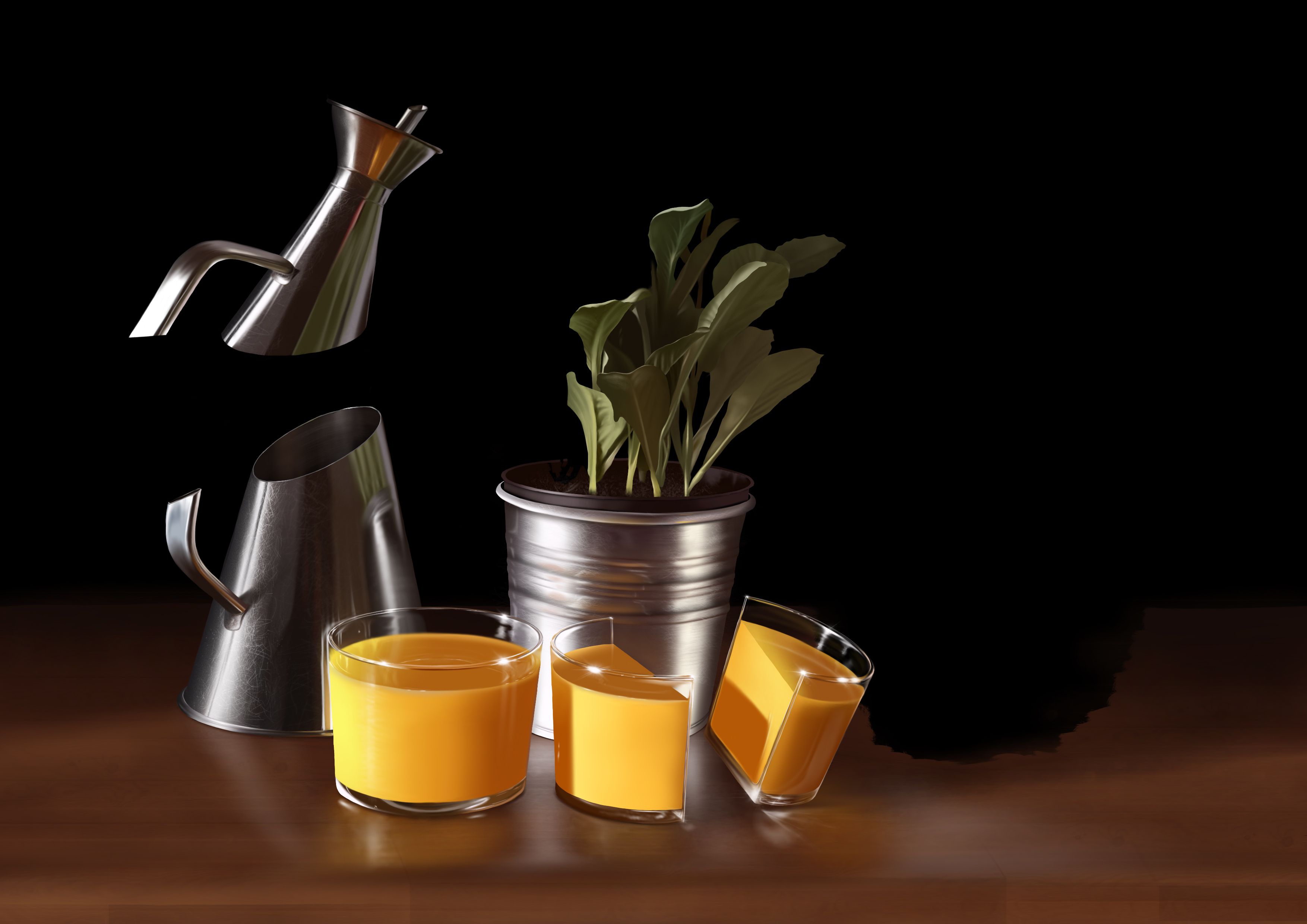 Ha sido muy divertido imaginar como serían los elementos cortados. (sobre todo el vaso con zumo de naranja!, el corte ha sido tan rápido que el zumo aun conserva su forma!!)