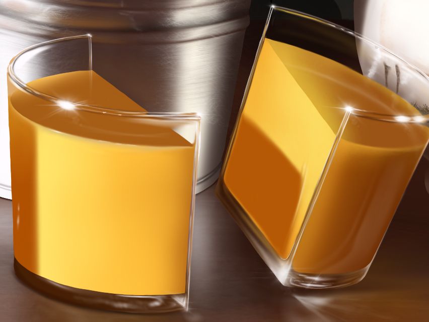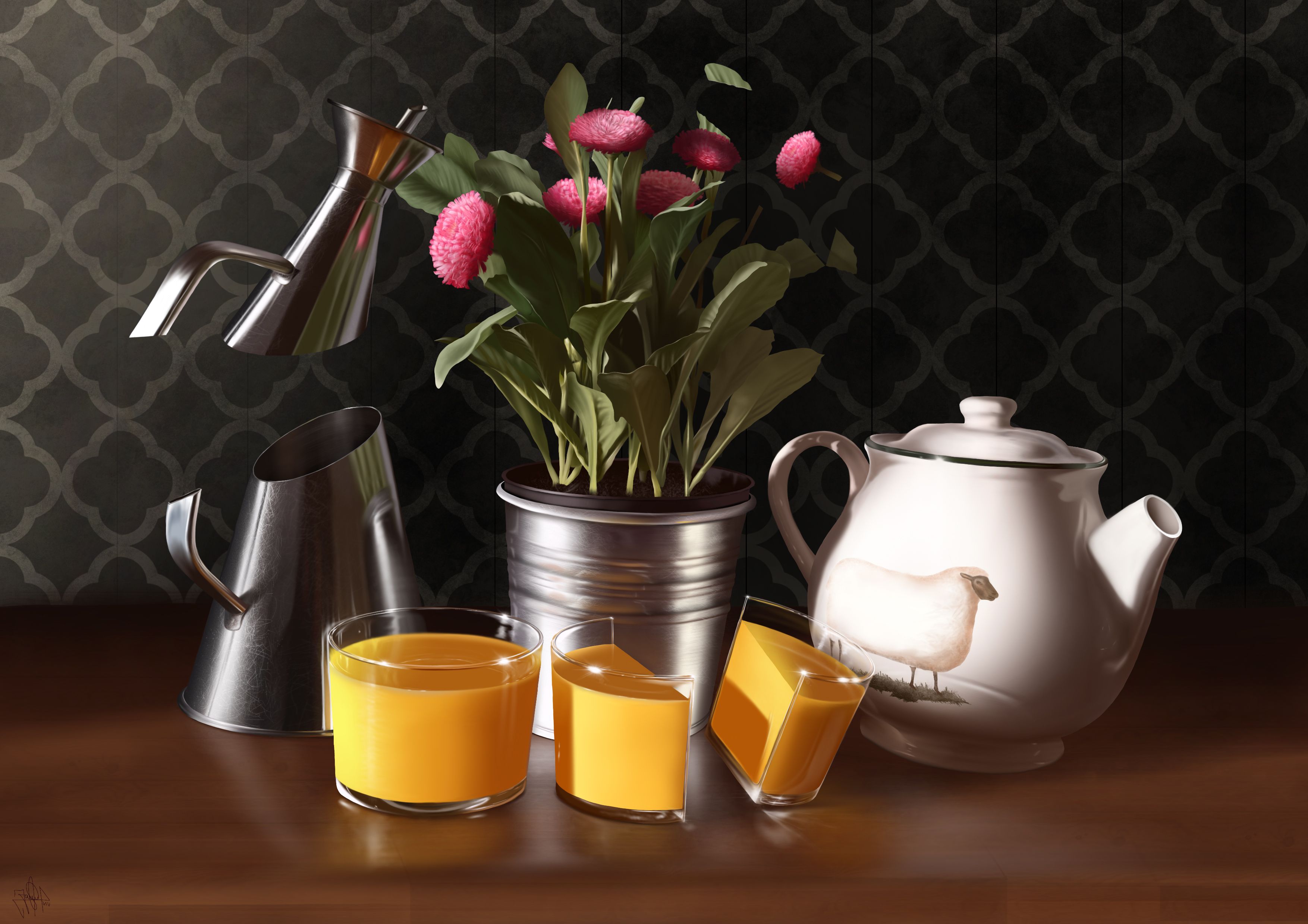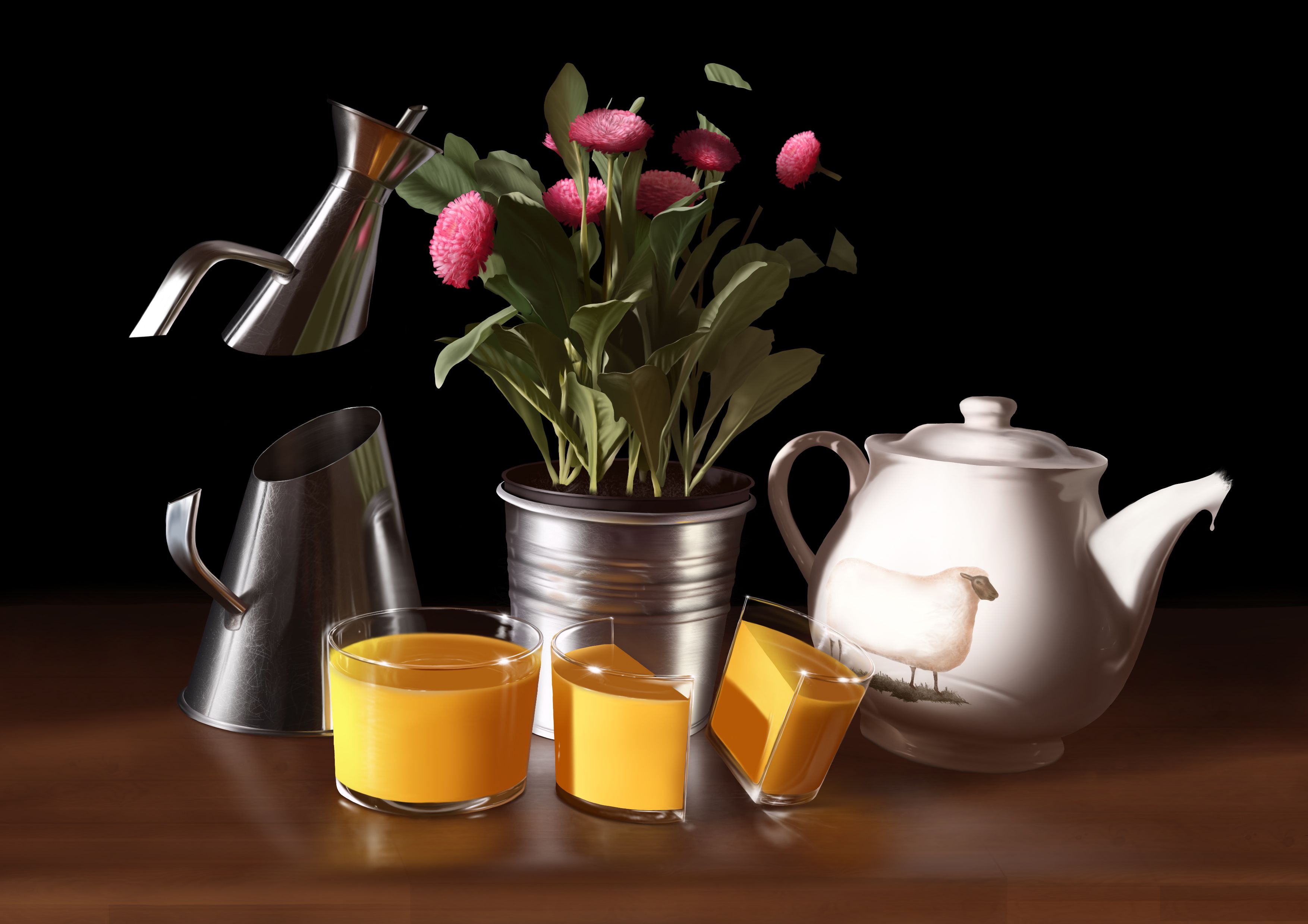 Ha sido muy divertido imaginar como serían los elementos cortados. (sobre todo el vaso con zumo de naranja!, el corte ha sido tan rápido que el zumo aun conserva su forma!!)