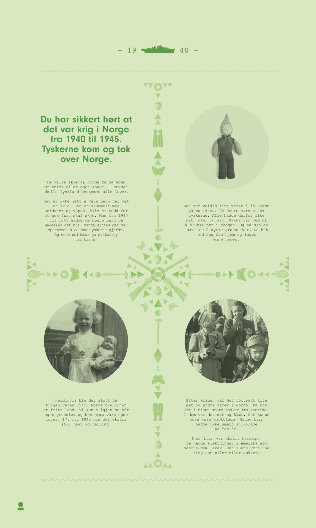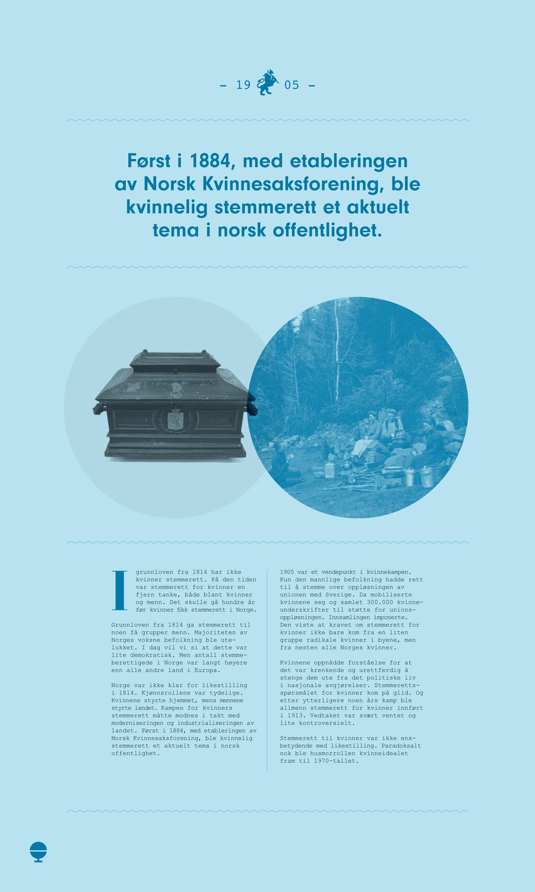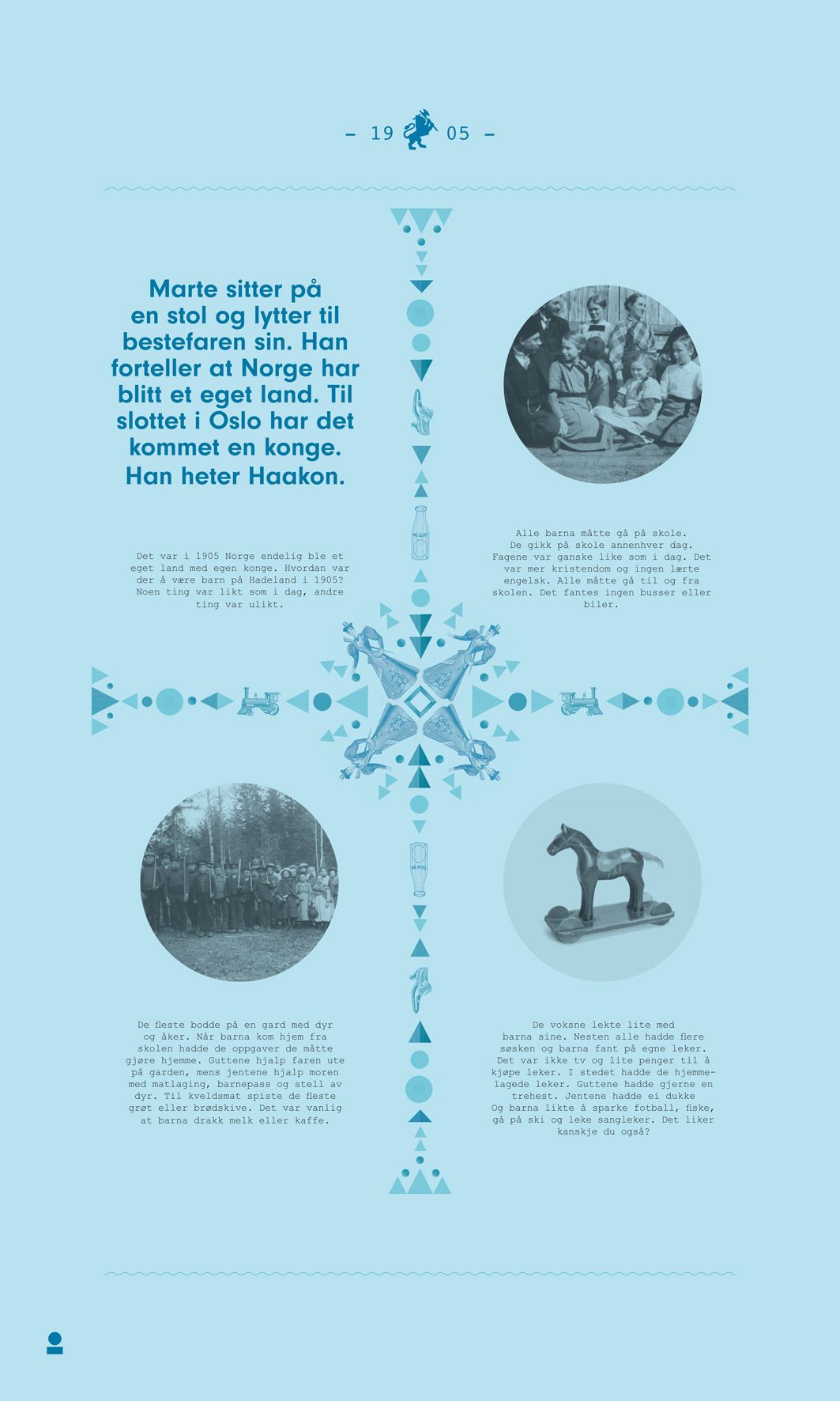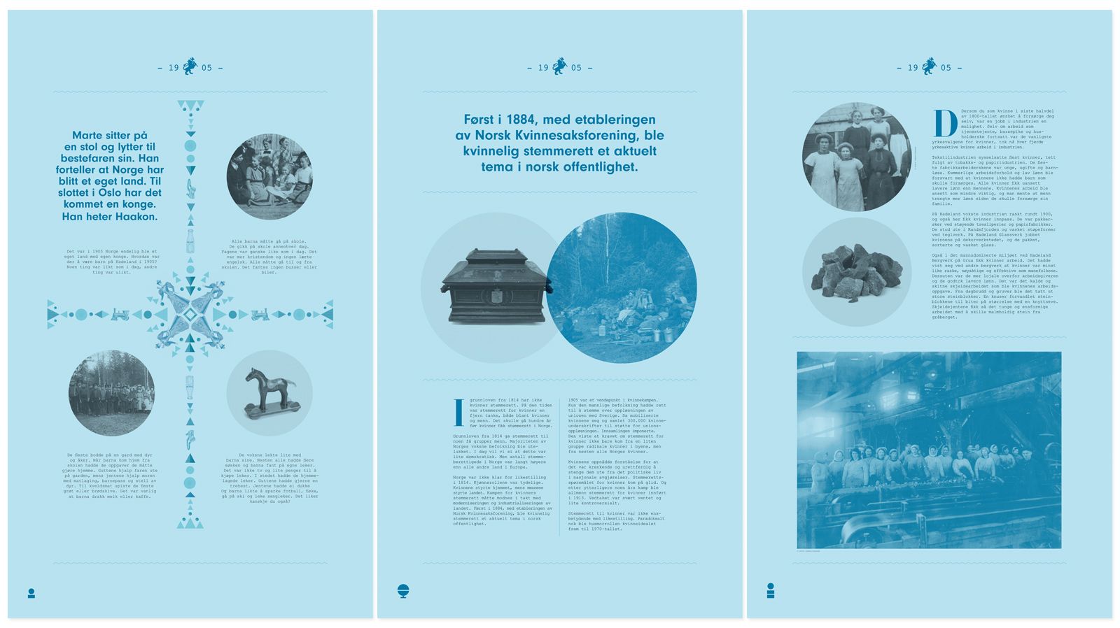y crear esta exposición para el Museo Lands y el Museo Folclórico de Hadeland. La exposición se dividió en cuatro salas que representan cada una una década: 1814, 1905, 1940 y 2014.