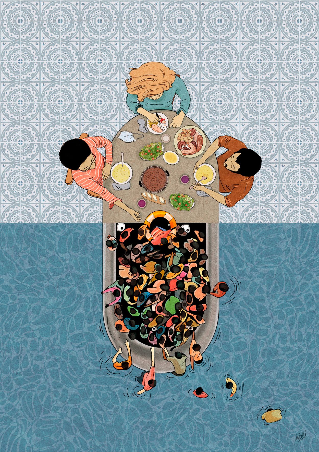 Dos tercios de los beneficios obtenidos con la venta de esta lámina iran destinados a Zaporeak. Zaporeak es una asociación sin ánimo de lucro que ofrece comida digna a las personas refugiadas que llegan a Europa.