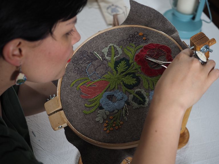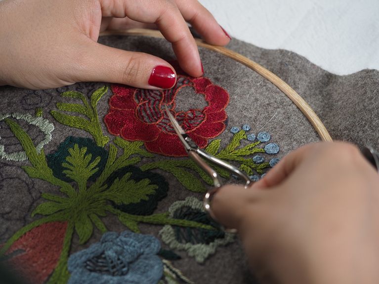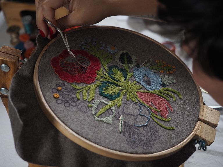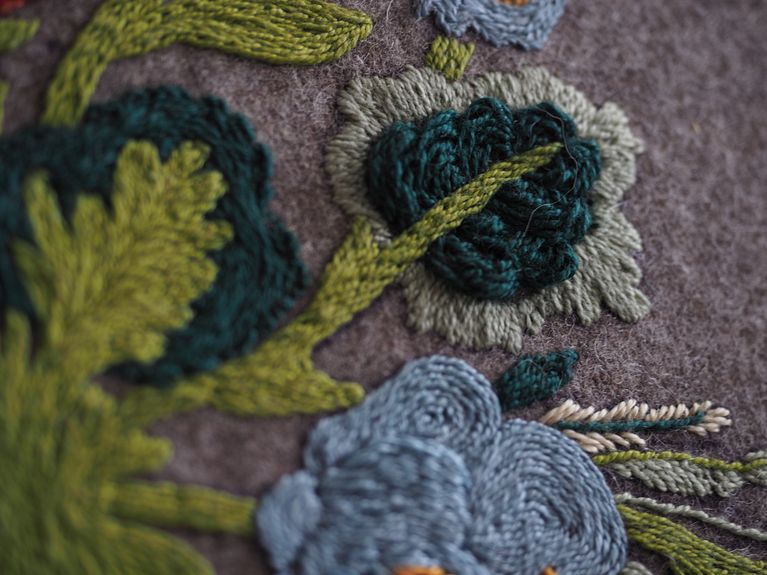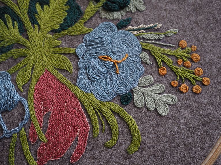 El paño de lana es tan difícil de trabajar que a media filmación tuve que corregir un montón de errores. En las fotos de proceso de Hechizo de Primavera, el proyecto final que diseñé para mi curso de laboratorio de paso atrás, estoy rebordando toda la parte de la corona de la rosa principal.