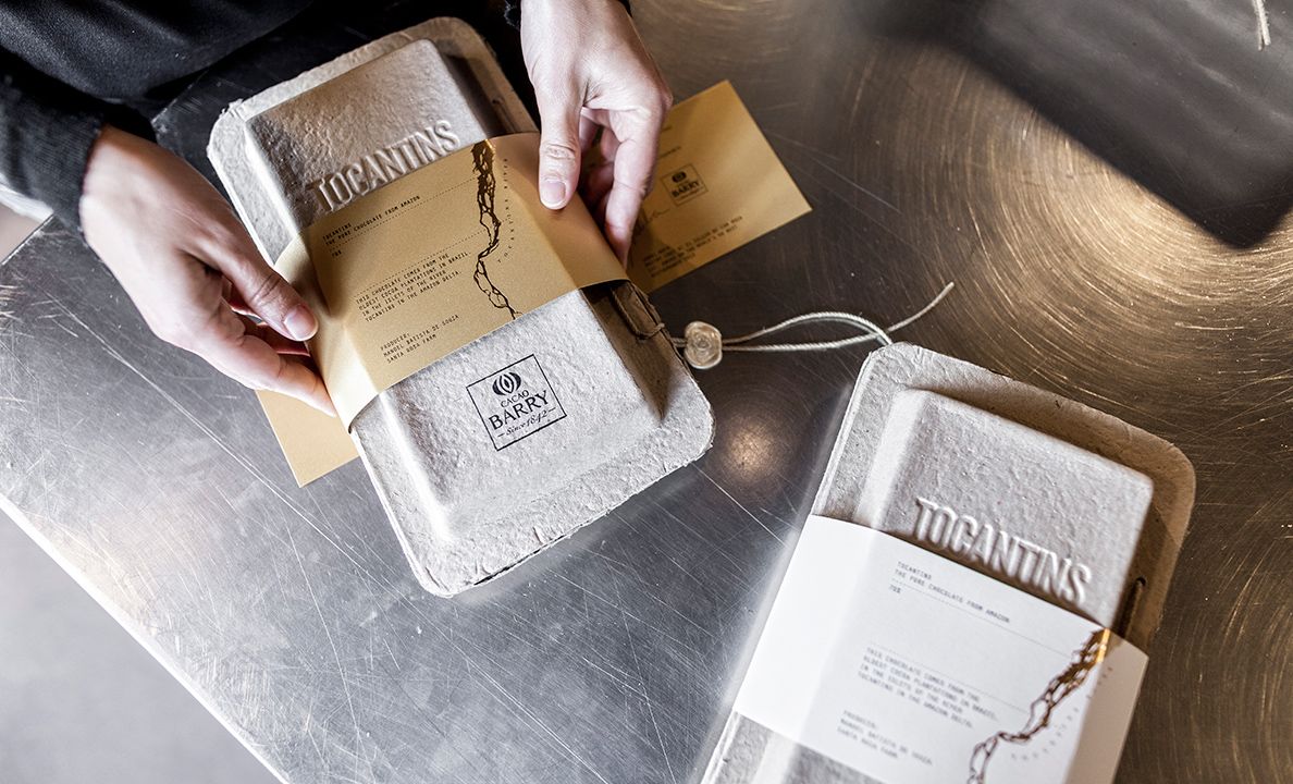 Tocantins es un chocolate que proviene de unas pequeñas plantaciones de cacao en el delta del Amazonas. La producción es limitada y reservada exclusivamente a los “World’s 50 Best Restaurants”. El packaging para la presentación es de pasta de papel cerrado con cordel y lacre, evocando a un orígen remoto, la faja le aporta exclusividad.