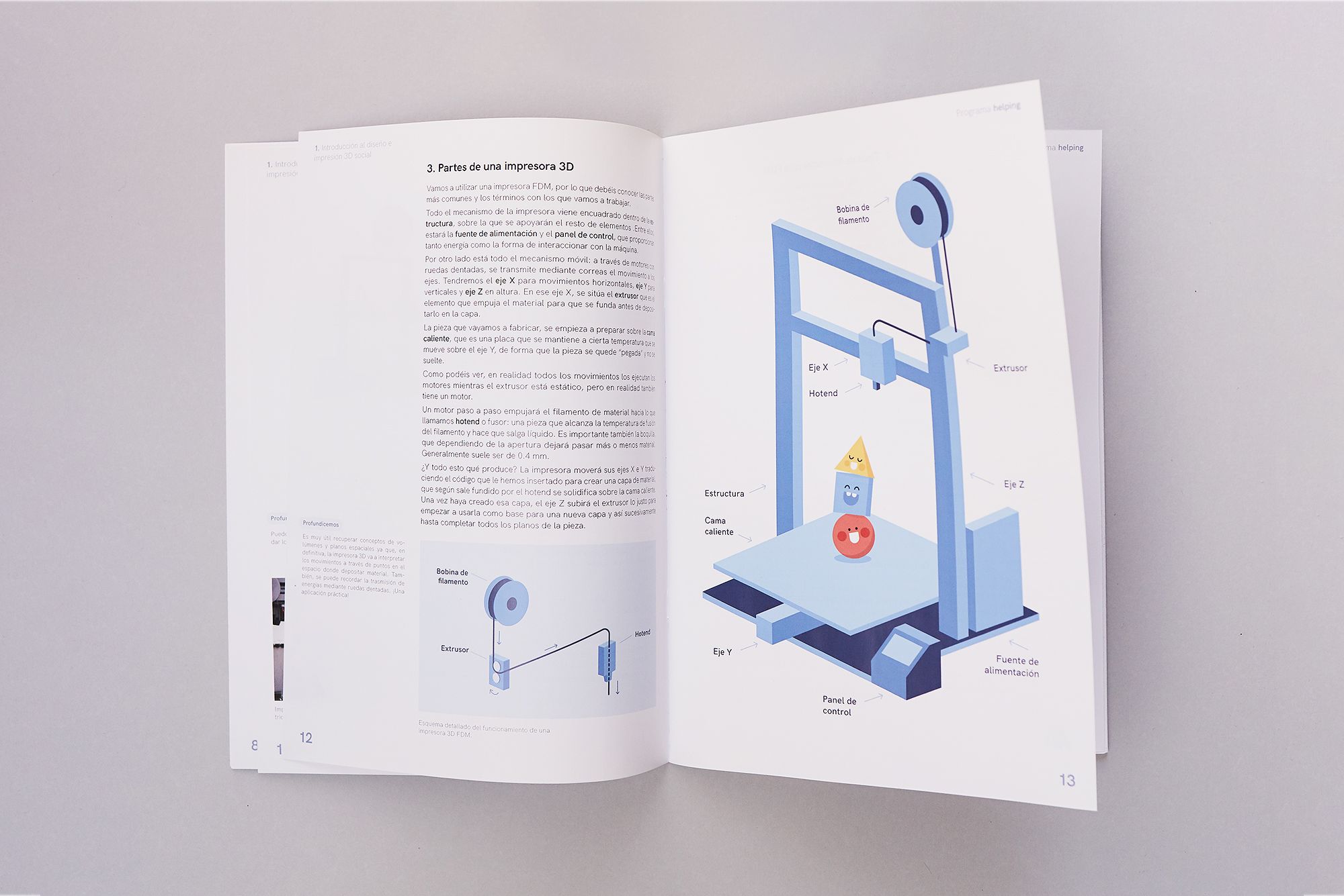 A set of two books commissioned by Ayúdame3D, the student and teacher guide, designed to turn a complex subject into a breeze. Full of illustrations and infographics to make the information as visual as possible, laid out in a flexible grid system to fit the needs of the two books.