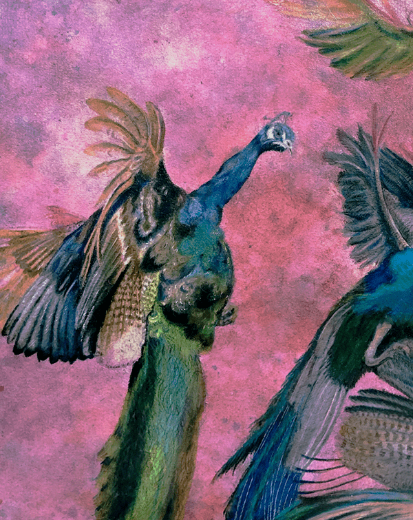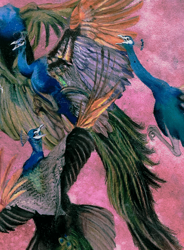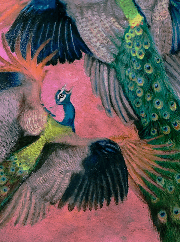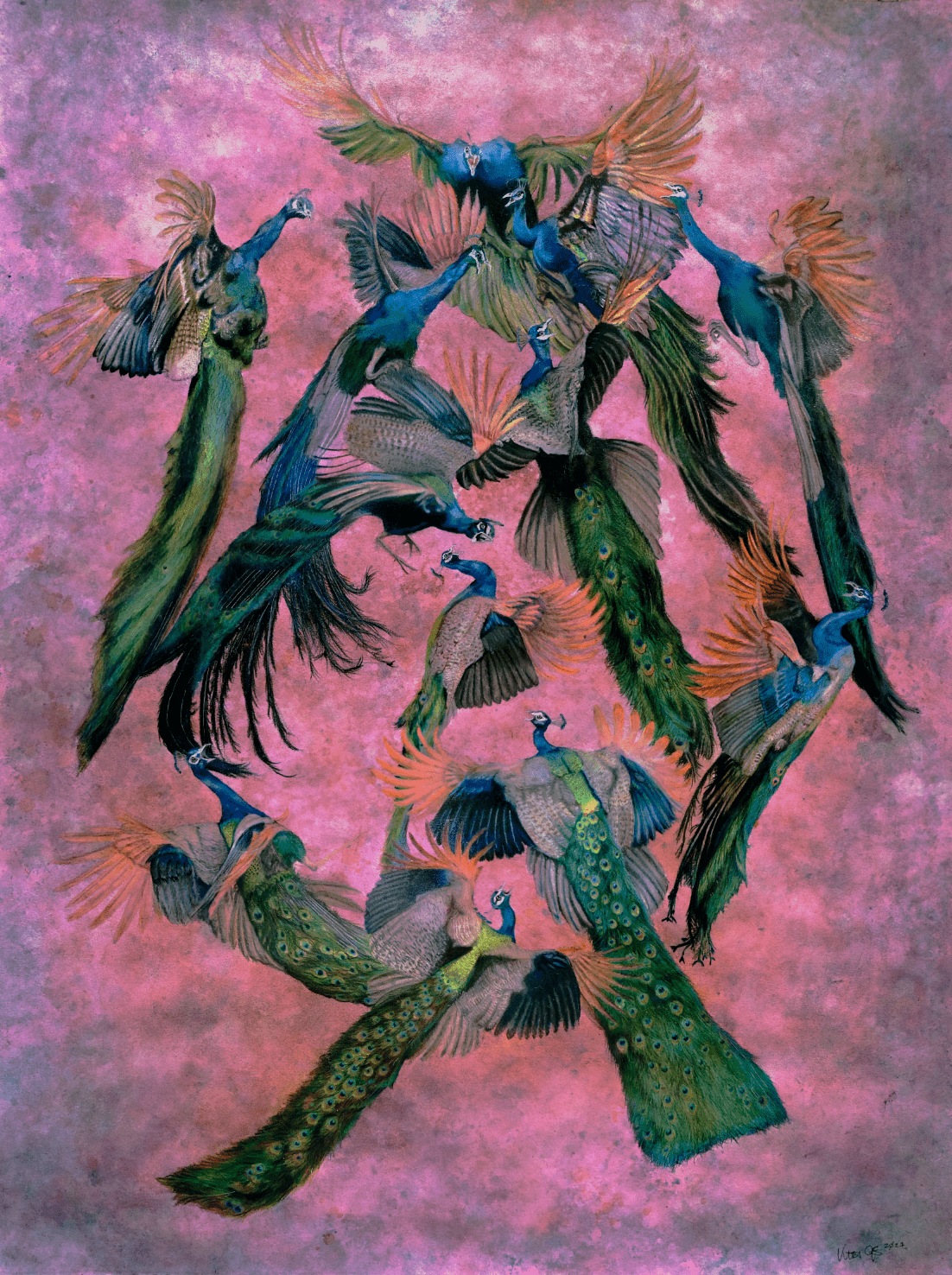 This 30"x40" Prismacolor colored pencil and Dr Ph Martin Watercolor drawing on Arches paper features a dozen peacocks fighting in midair.