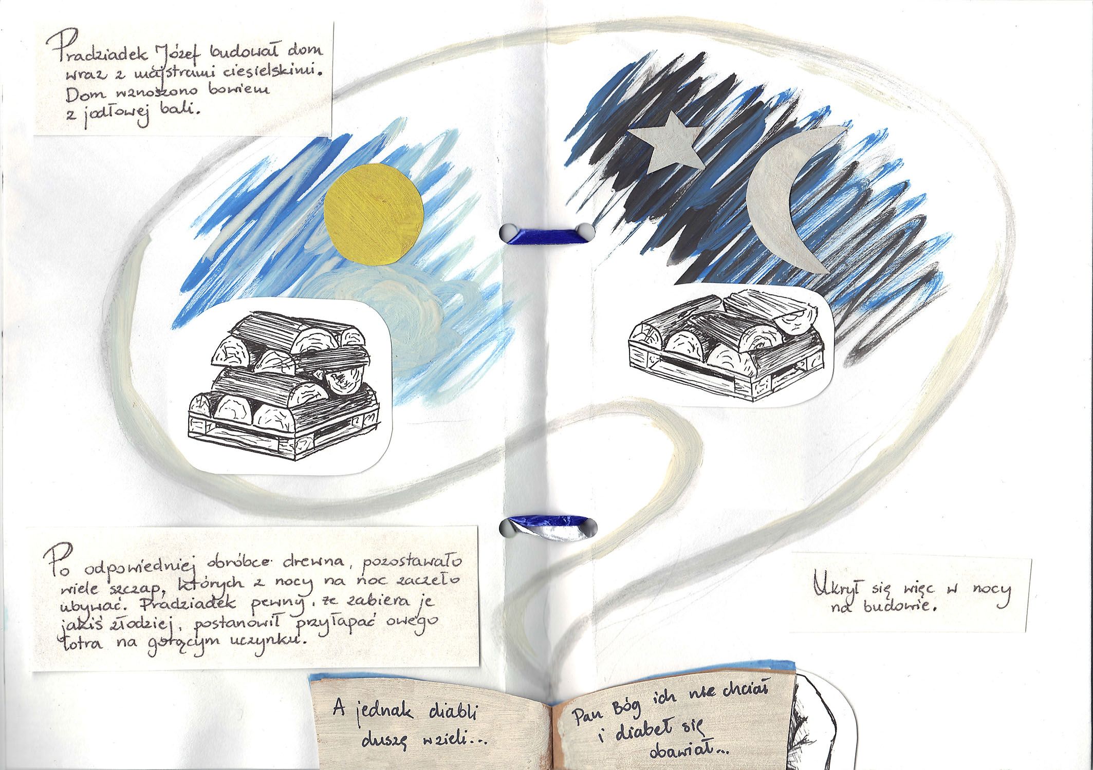 Na drugiej rozkładówce, u dołu, znajduje się mała książeczka z możliwością przewracania kartek, przedstawiająca tytuły innych legend łemkowskich. Książeczka jest trzymana przez narysowaną tuszem rękę, a nad nią unosi się chmura, w której wklejono rysunki ubywających w nocy szczap drewna. To nawiązanie do opowieści przechodnia o swoim pradziadku, który budując dom, zauważył tajemnicze znikanie drewnianych szczap w nocy.