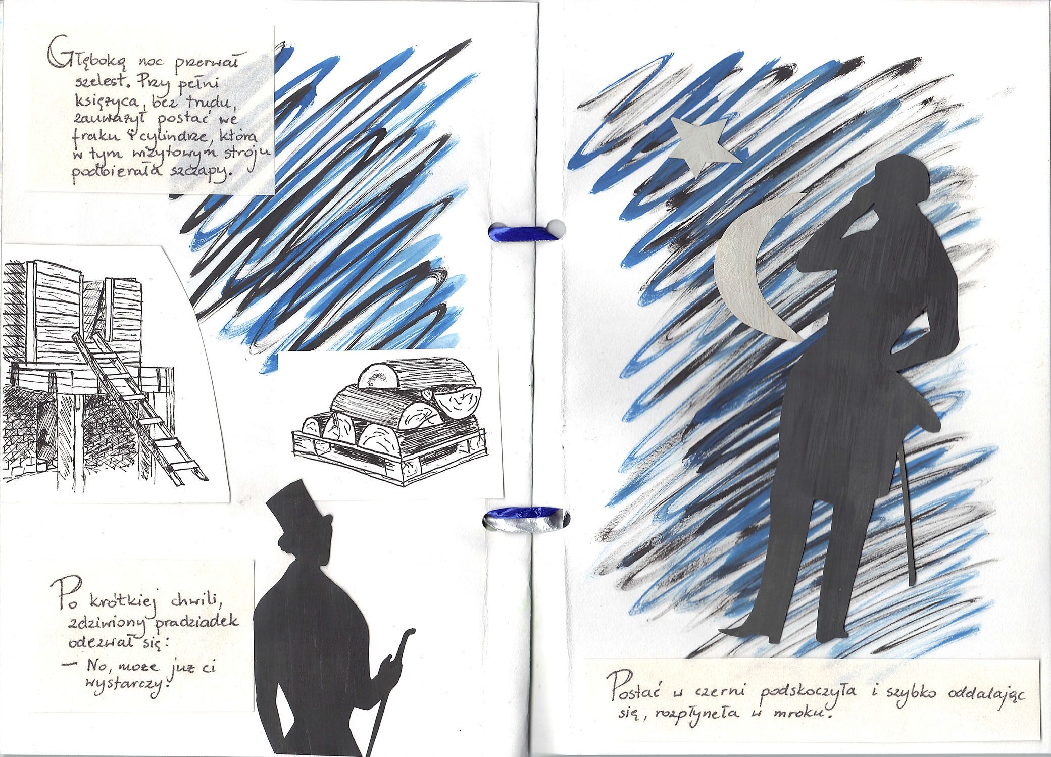 Trzecia rozkładówka przenosi nas w nocną scenerię budowy drewnianego domu. Po lewej stronie widać rozpoczętą budowę z wklejonymi szczapami drewna, a po prawej stronie czarna postać we fraku z cylindrem w ręku, podbierająca drewno. To właśnie pradziadek postanowił złapać złodzieja na gorącym uczynku, a zaskoczony złodziej reaguje na jego słowa.