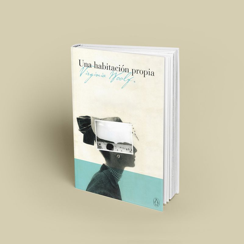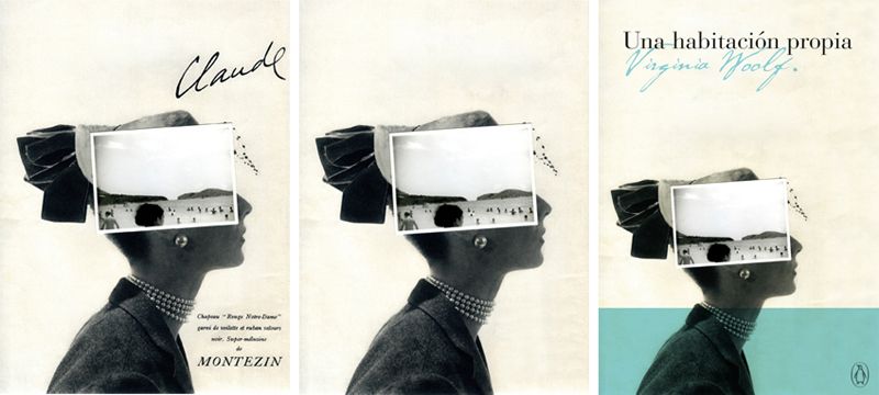 Hemos hecho diferentes pruebas hasta que hemos dado con la solución deseada. Por un lado tenemos una imagen de una mujer de perfil elegante y desafiante pero un tanto rígida que bien podría representar a la mujer de la época (aunque en realidad la hemos sacado de un Vogue de 1949). Y por otro lado tenemos una fotografía de una playa con mucho espacio en blanco, que nos servirá para representar lo lúdico, la libertad, un espacio de esparcimiento simbólico alejado del corsé social. La manera de unirse desde el sombrero a la nariz (uno de los rasgos físicos más característicos de Virginia Woolf), hace que se cree un espacio "lienzo en blanco" precisamente en el sitio de los ojos y el cerebro que de nuevo nos ayuda a sugerir la libertad de pensamiento que se reclama en el libro.