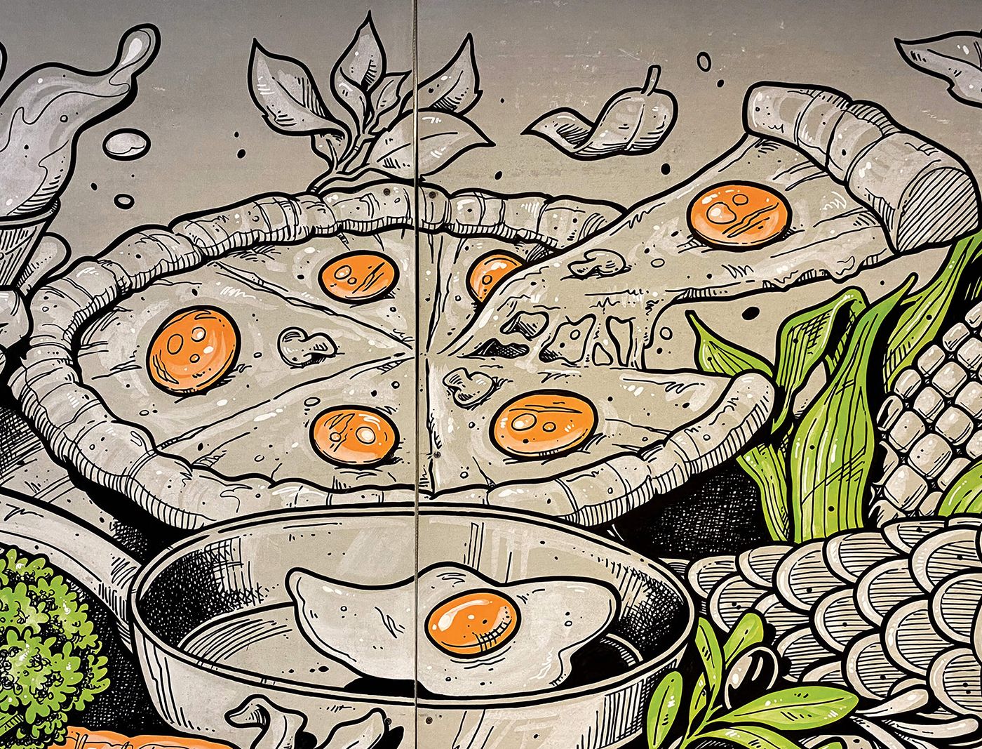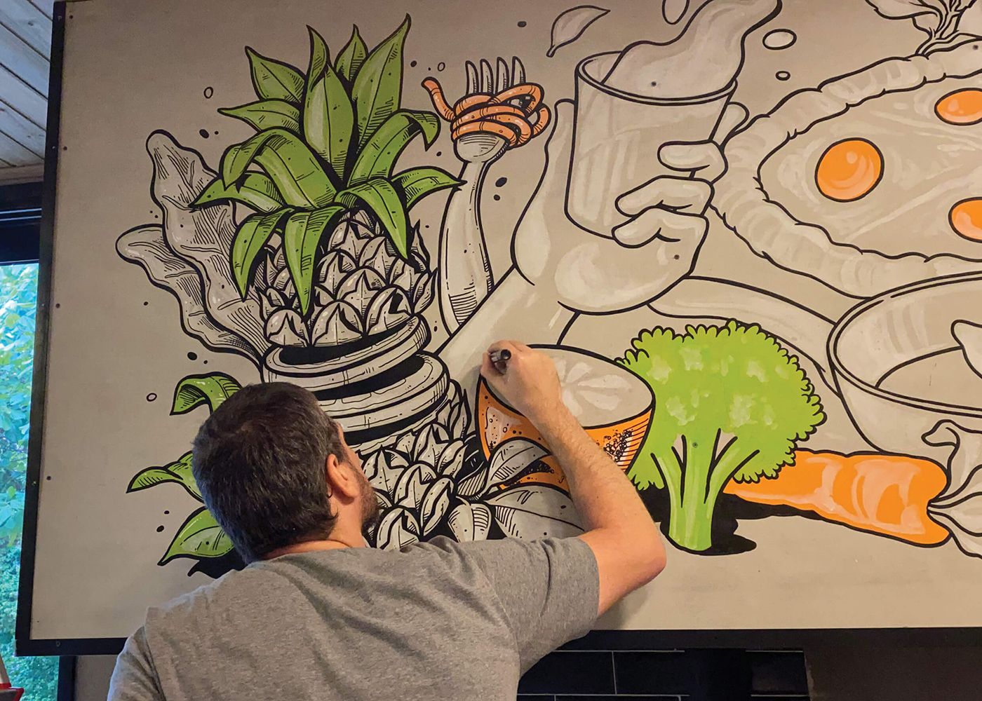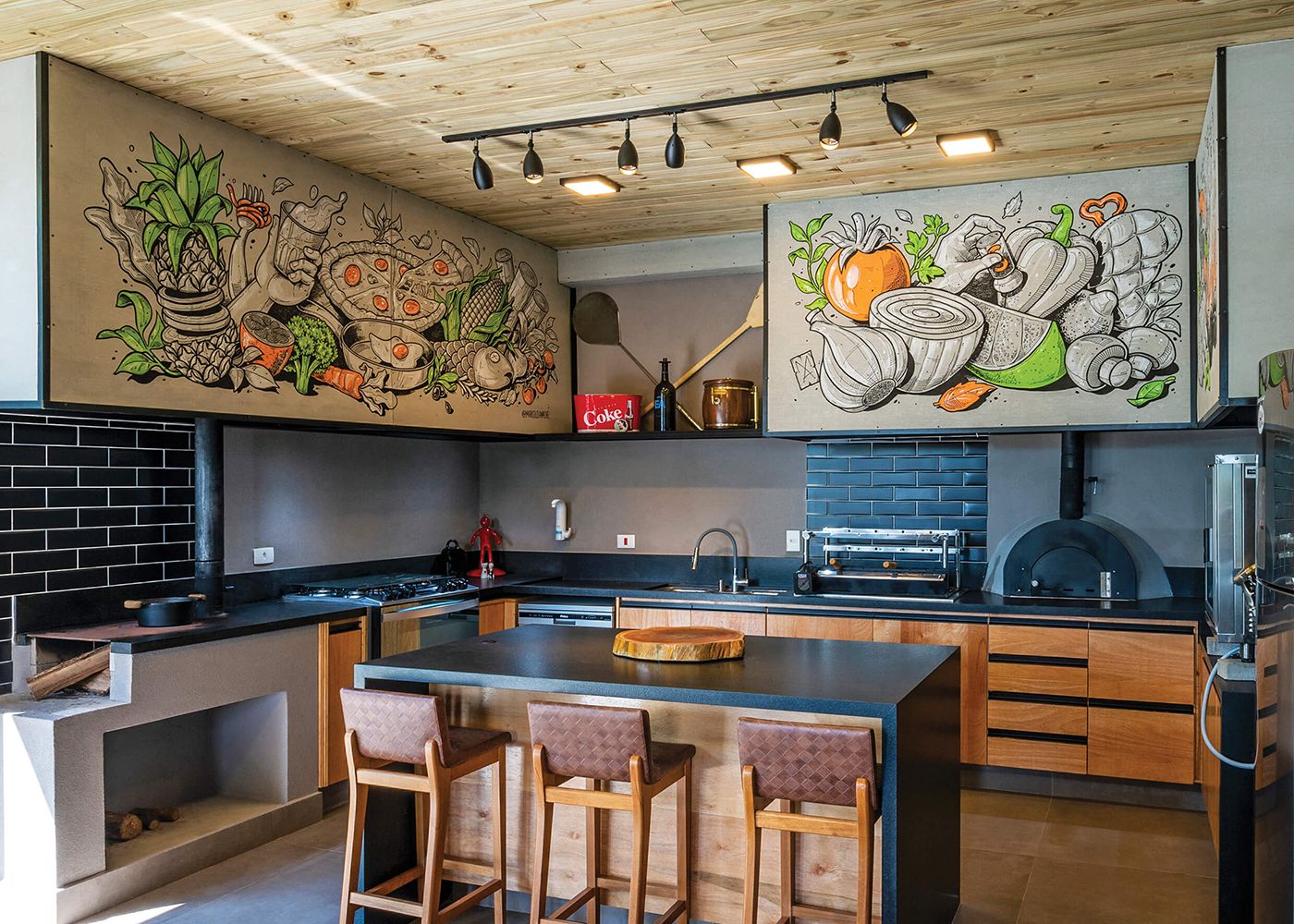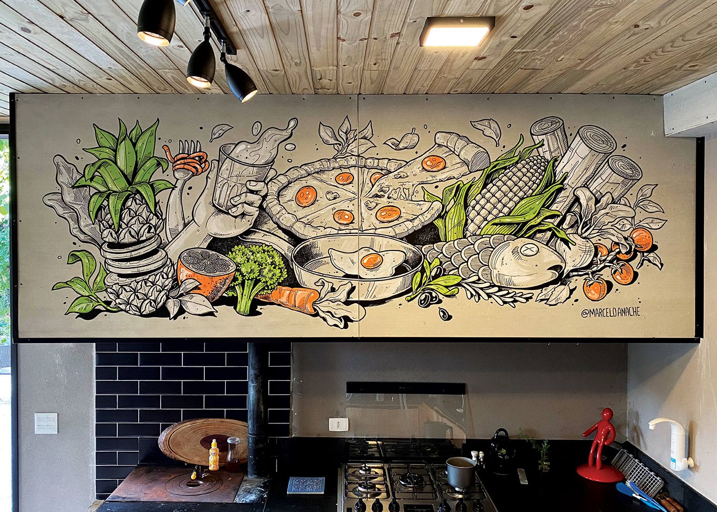 El arquitecto Daniel Szebo diseñó un proyecto único para su cocina: instaló paneles para cubrir la campana y las chimeneas de la barbacoa, el horno de pizza y la estufa de leña, y me pidió que dibujara sobre ellos. La obra de arte era deliciosa, con muchos ingredientes, especias, frutas, verduras, barbacoa y pizza. Sin mencionar el carbón, la leña y el fuego. Fueron cinco días de trabajo, y pueden ver el resultado a continuación.