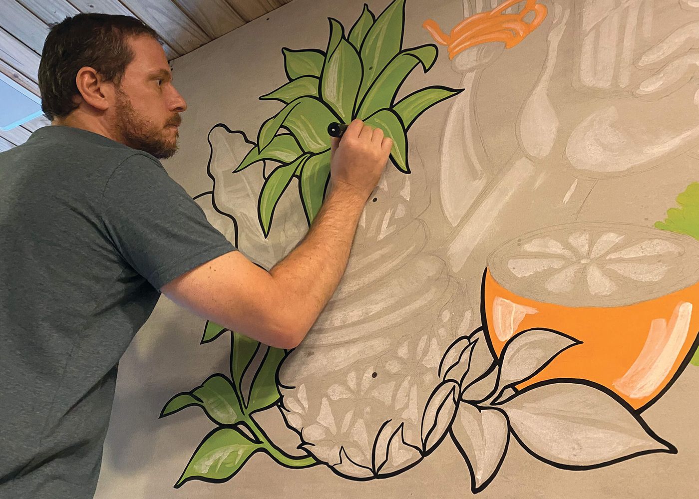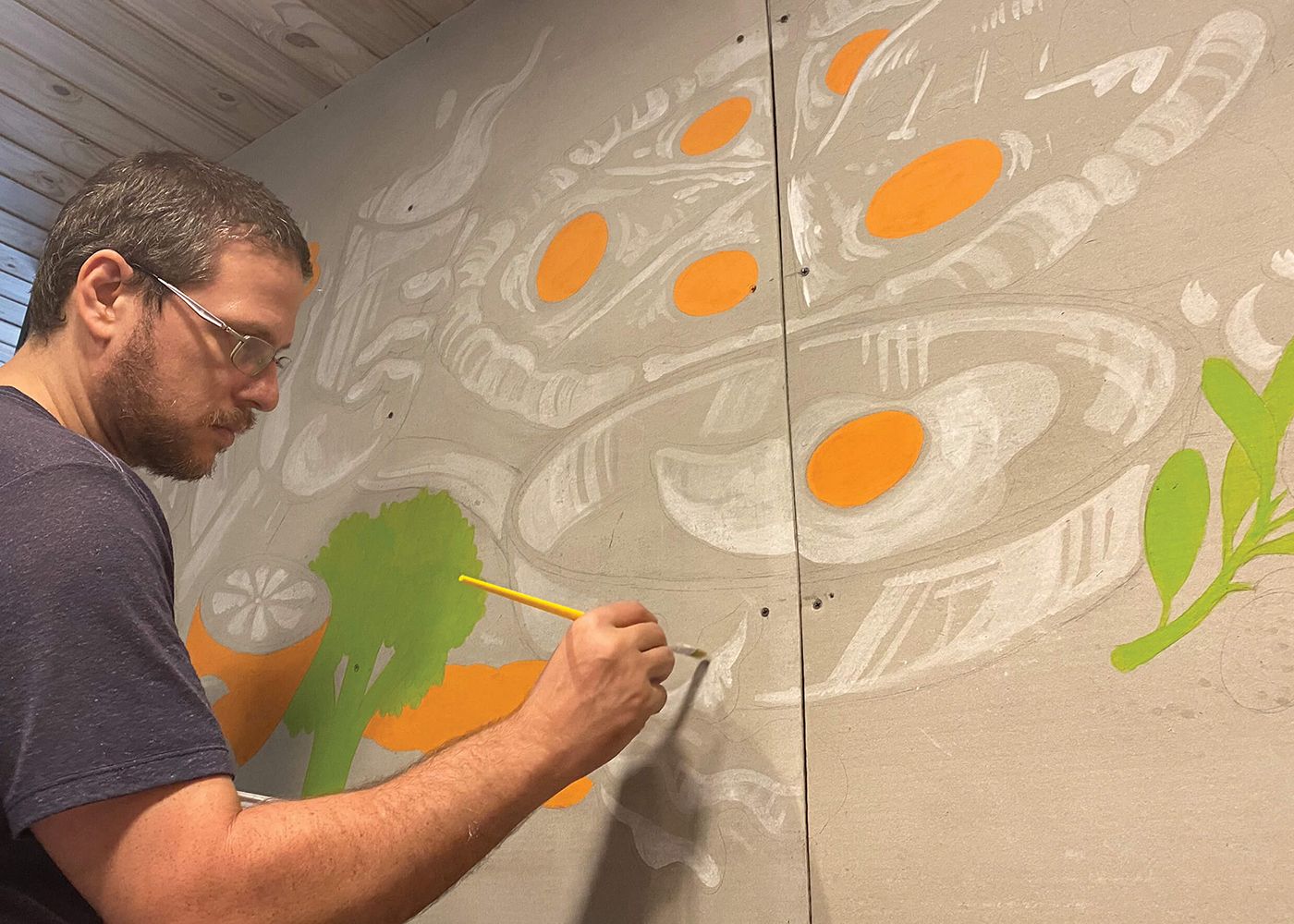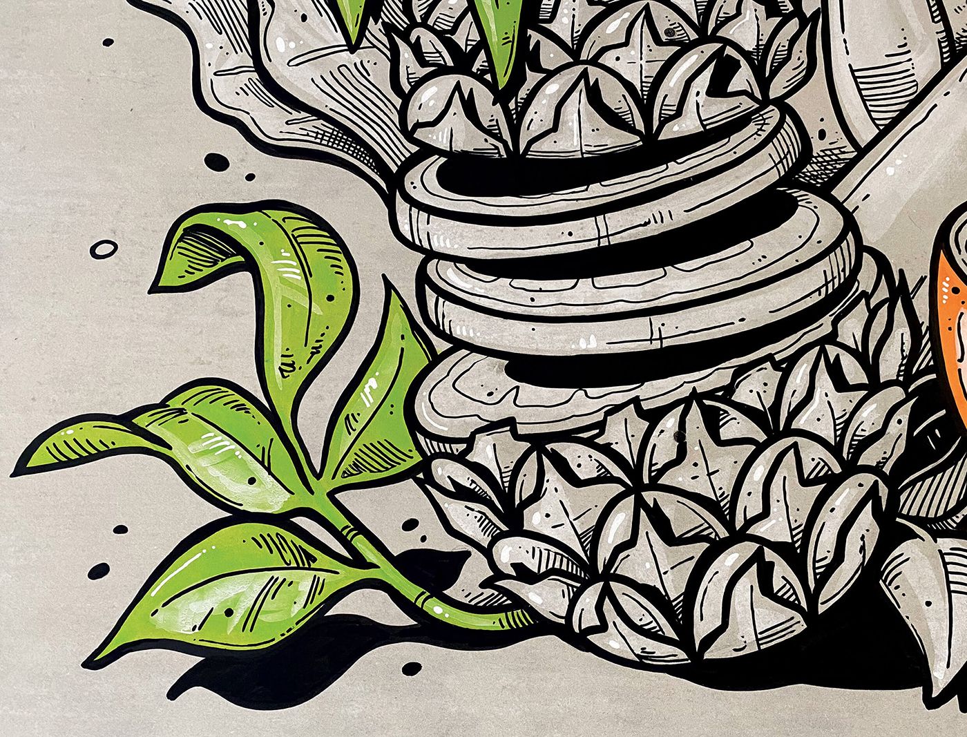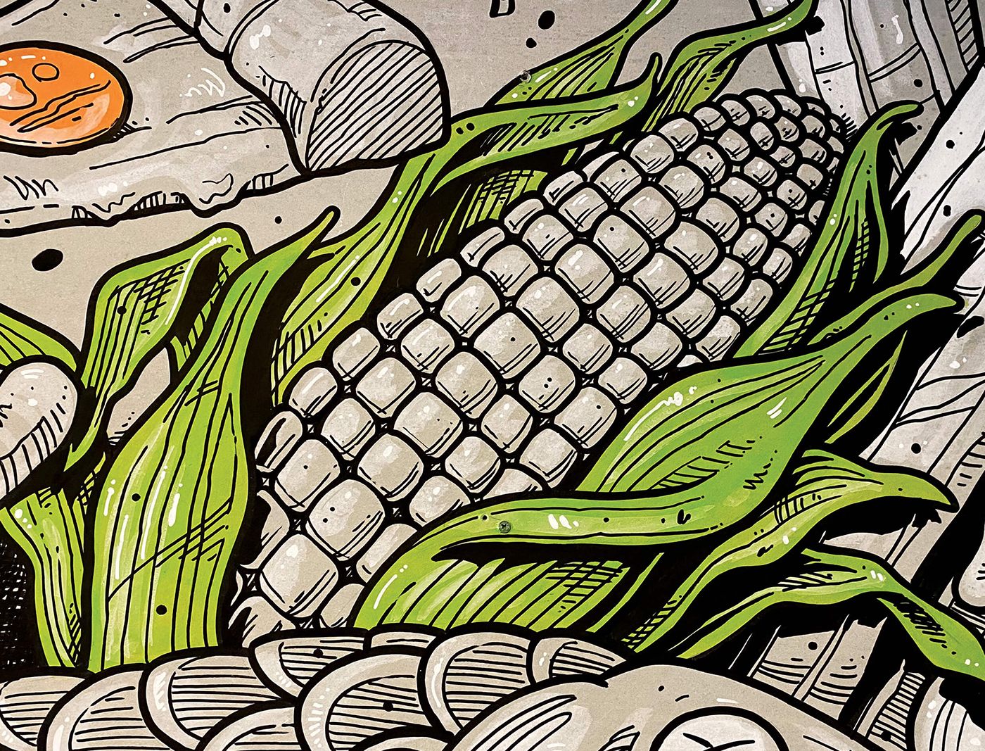 El arquitecto Daniel Szebo diseñó un proyecto único para su cocina: instaló paneles para cubrir la campana y las chimeneas de la barbacoa, el horno de pizza y la estufa de leña, y me pidió que dibujara sobre ellos. La obra de arte era deliciosa, con muchos ingredientes, especias, frutas, verduras, barbacoa y pizza. Sin mencionar el carbón, la leña y el fuego. Fueron cinco días de trabajo, y pueden ver el resultado a continuación.
