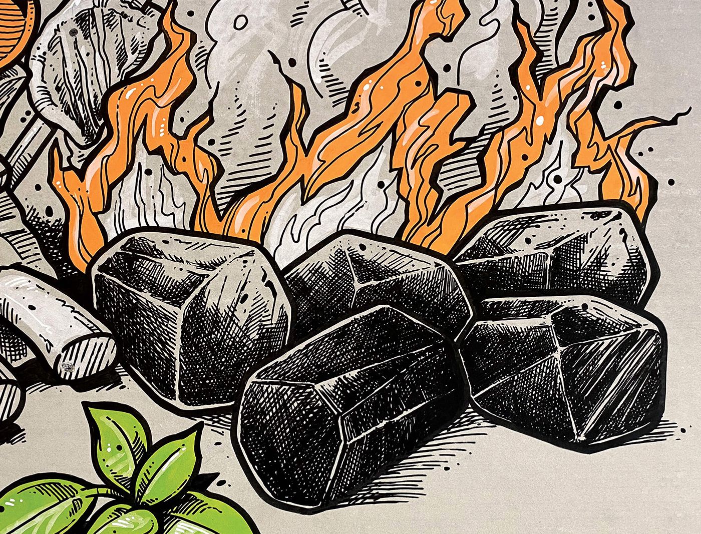 O arquiteto Daniel Szebo fez um projeto exclusivo em sua cozinha, instalando painéis para cobrir a coifa e as chaminés da churrasqueira, do forno de pizza e do fogão a lenha e me chamou para desenhar neles. A arte ficou de dar água na boca com muitos ingredientes, temperos, frutas, legumes, churrasco e pizza. Sem esquecer do carvão, da lenha e do fogo. Foram cinco dias de trabalho e o resultado você pode conferir abaixo.