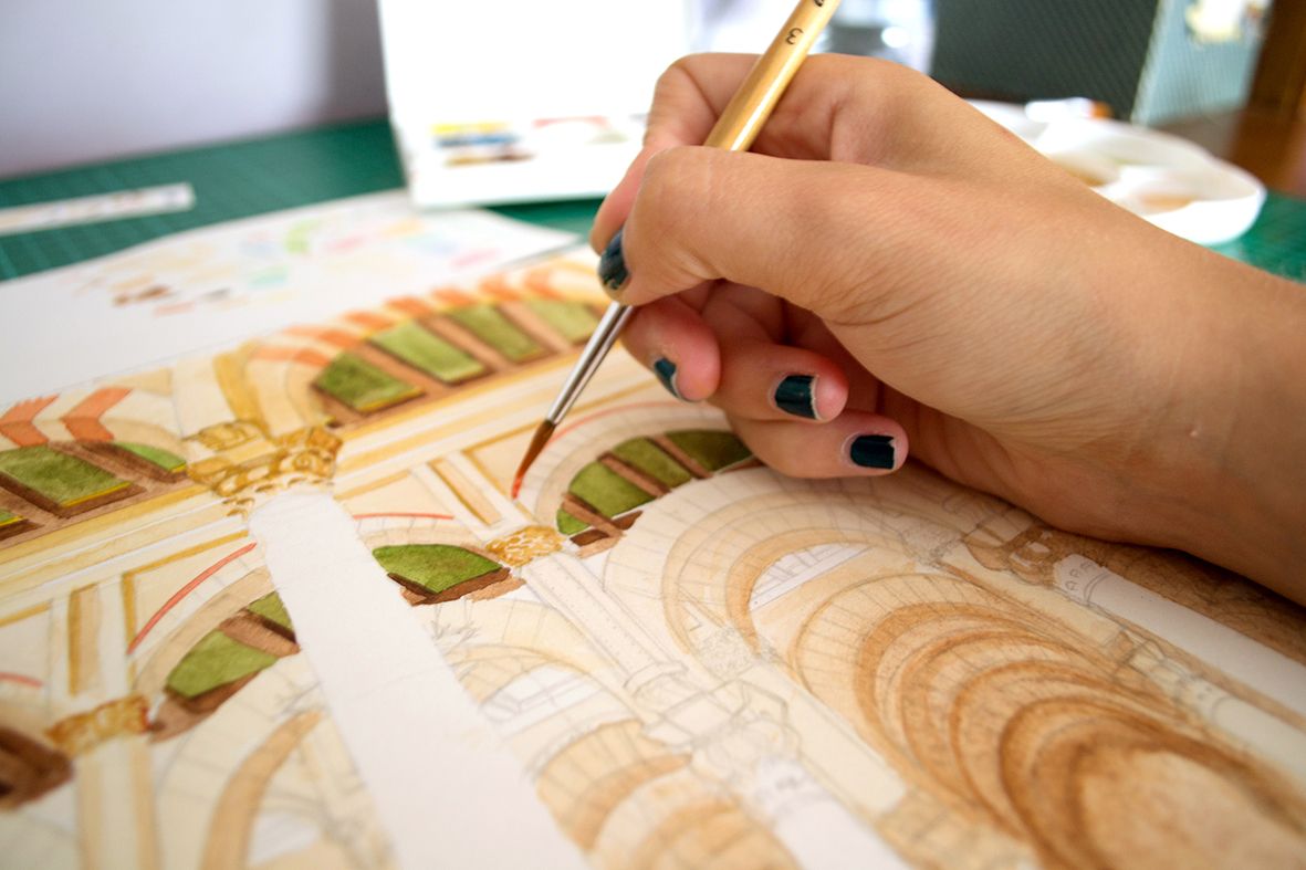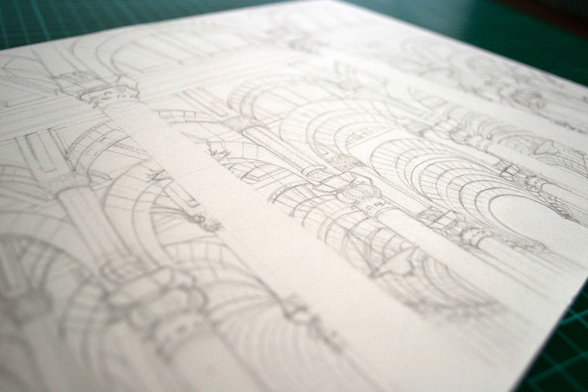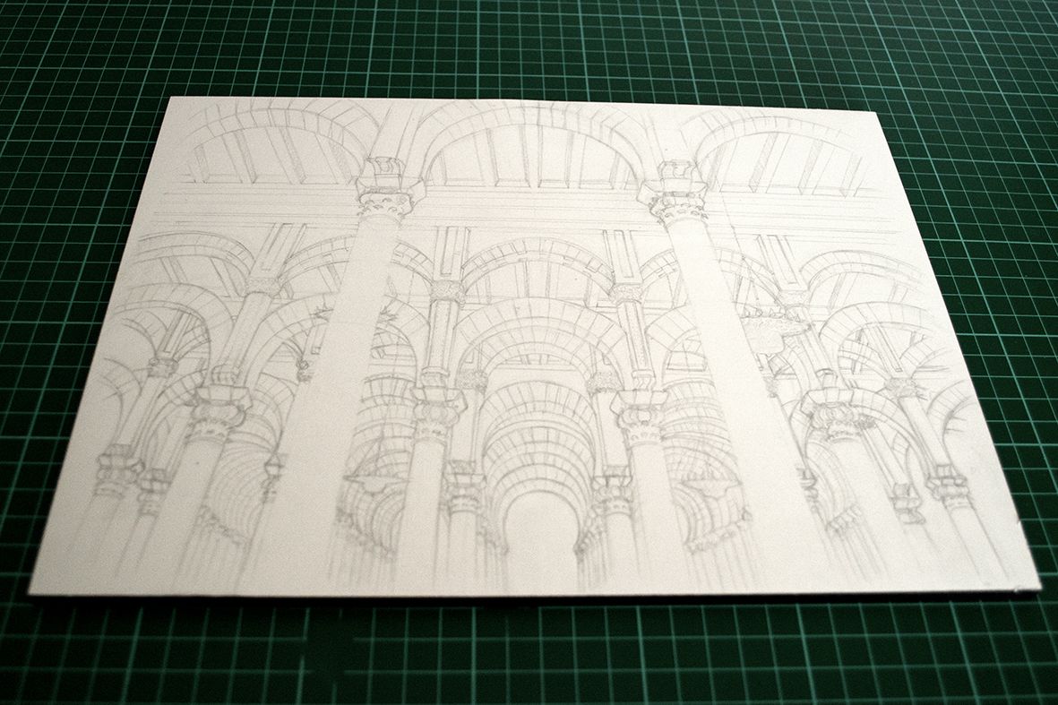 Comenzamos por el boceto inicial. Quise representar la parte árabe de la mezquita y su impresionante sala llena de arcos y columnas.