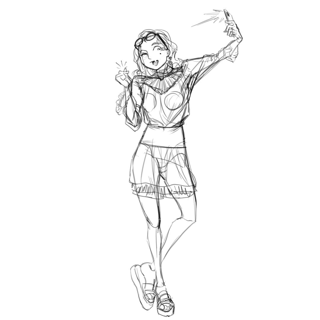 My project was a character called Clarice, from a romance manga I'm drawing called Mystery Date. Clarice is excitable, brassy, mischievous, and fancy. She like being a fashion plate, and she's a show-off. Here, she's taking a selfie. That's the long and the short of it.