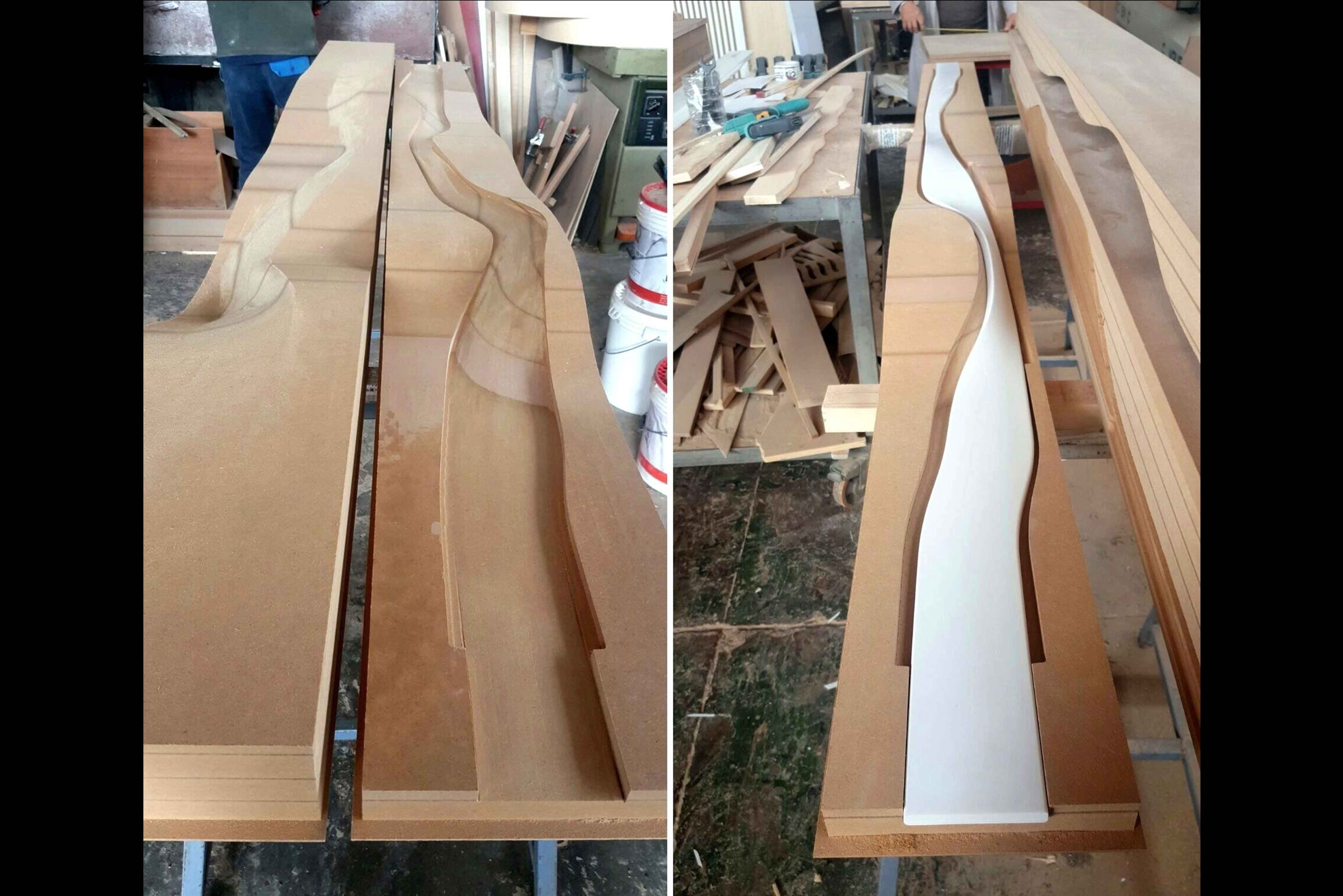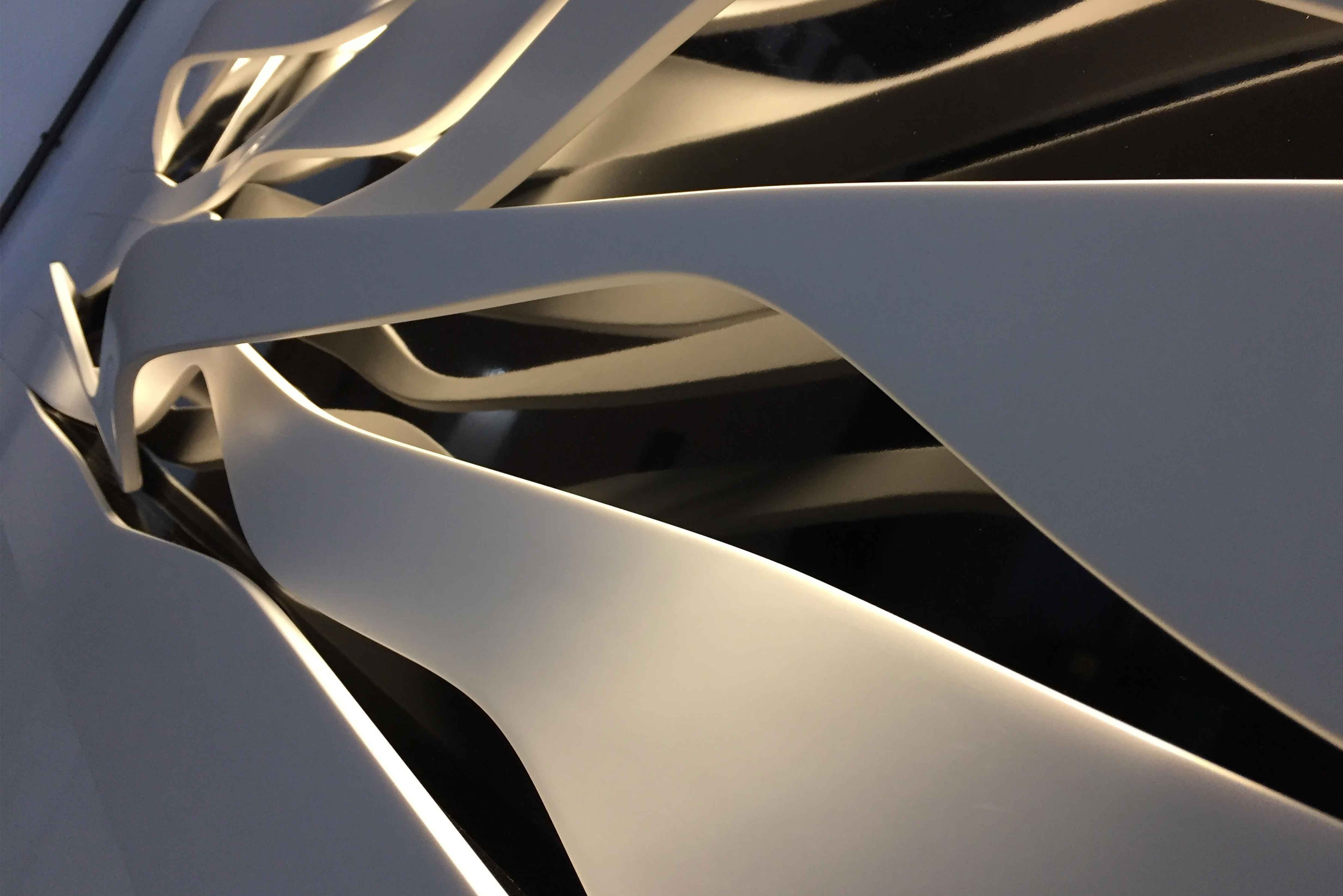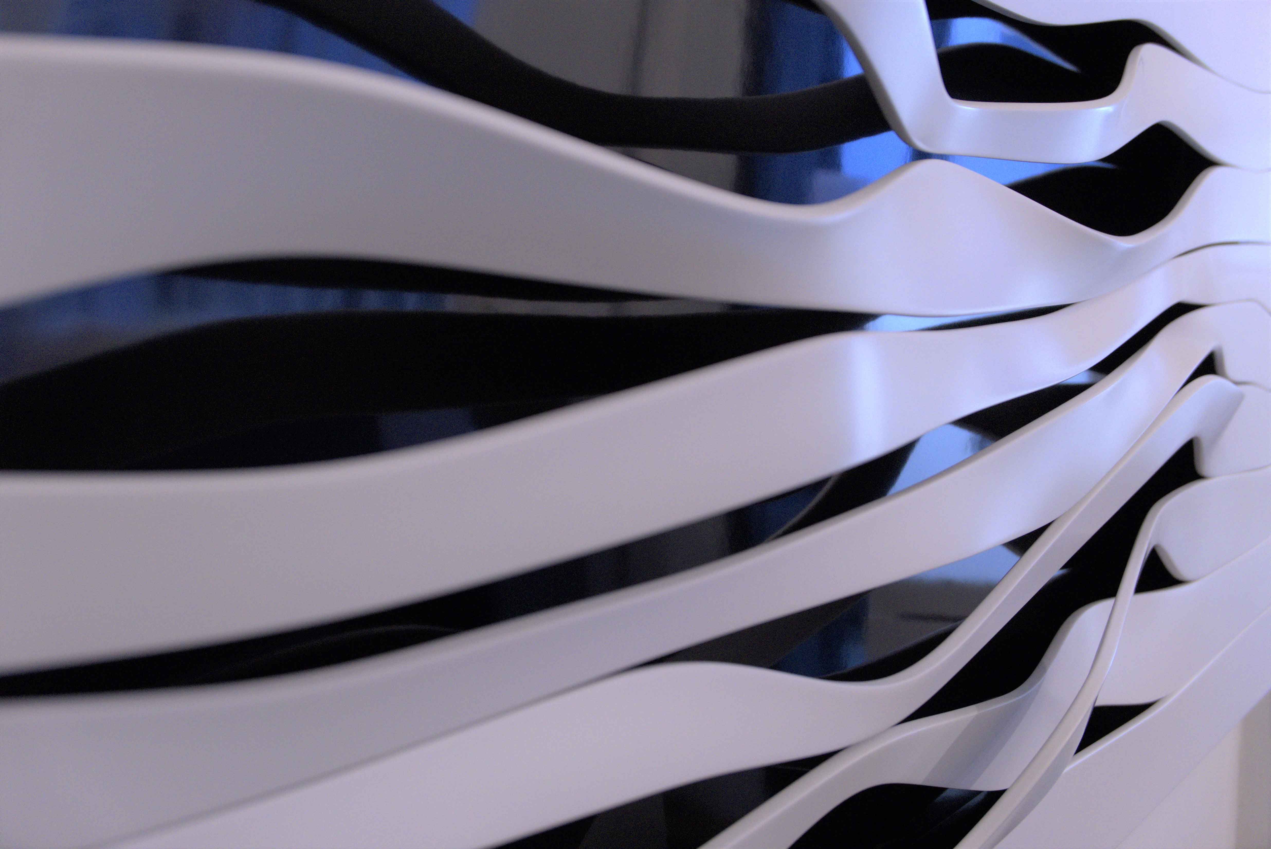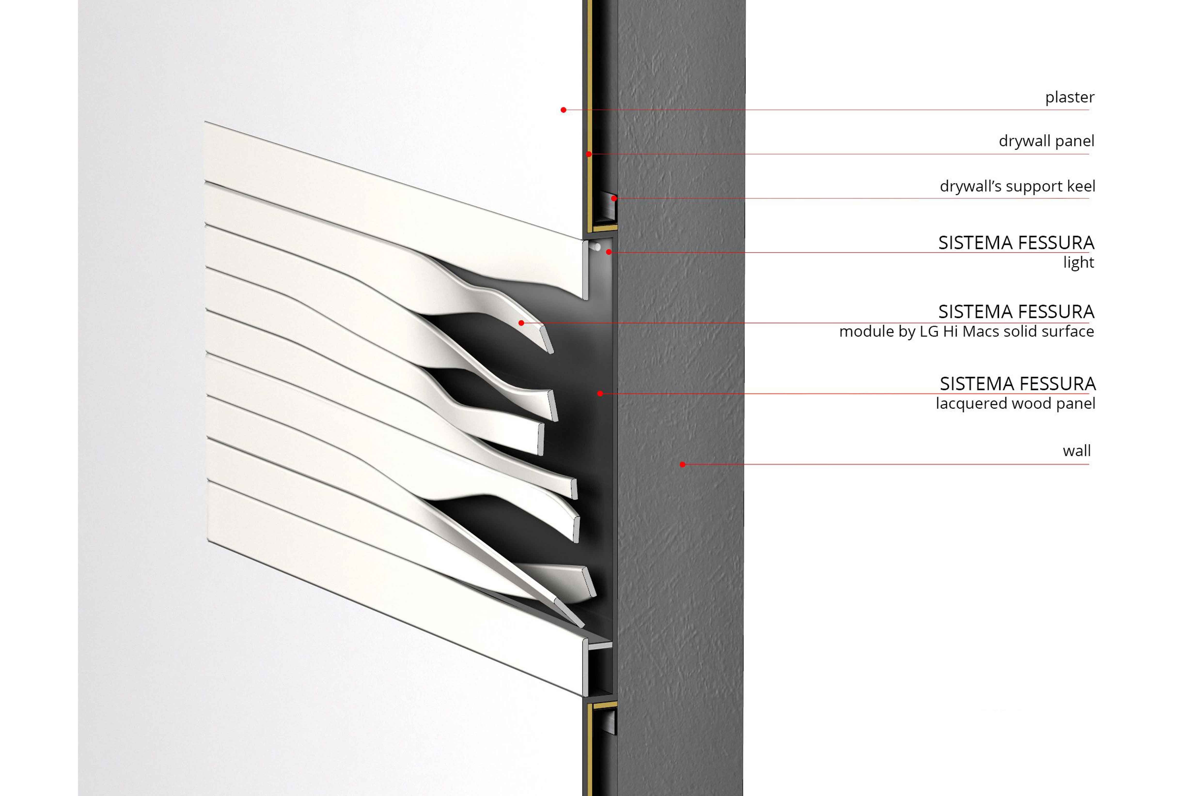 The design is the result of advanced algorithmic techniques which generate unprecedented geometries and allow the designer to rapidly customize the panel’s digital model to fit specific measures and to generate a machine readable file for manufacturing. Fessura creates a tridimensional and dynamic effect using high-end details and materials. Despite the seamless appearance, each component has been strategically designed for a modular and easy assembly. Fessura consists of nine modules made by LG Hi Macs solid surface (colour code S028) and can be installed on existing walls or in continuity with drywall sheets. The fabrication process consists of three main phases: creation of nine CNC milled modules, CNC cut of planar Hi Macs sheets and thermo/pressure forming. The first prototype (dimensions: 300 cm x 80 cm circa) was exhibited at Fuori Salone di Milano