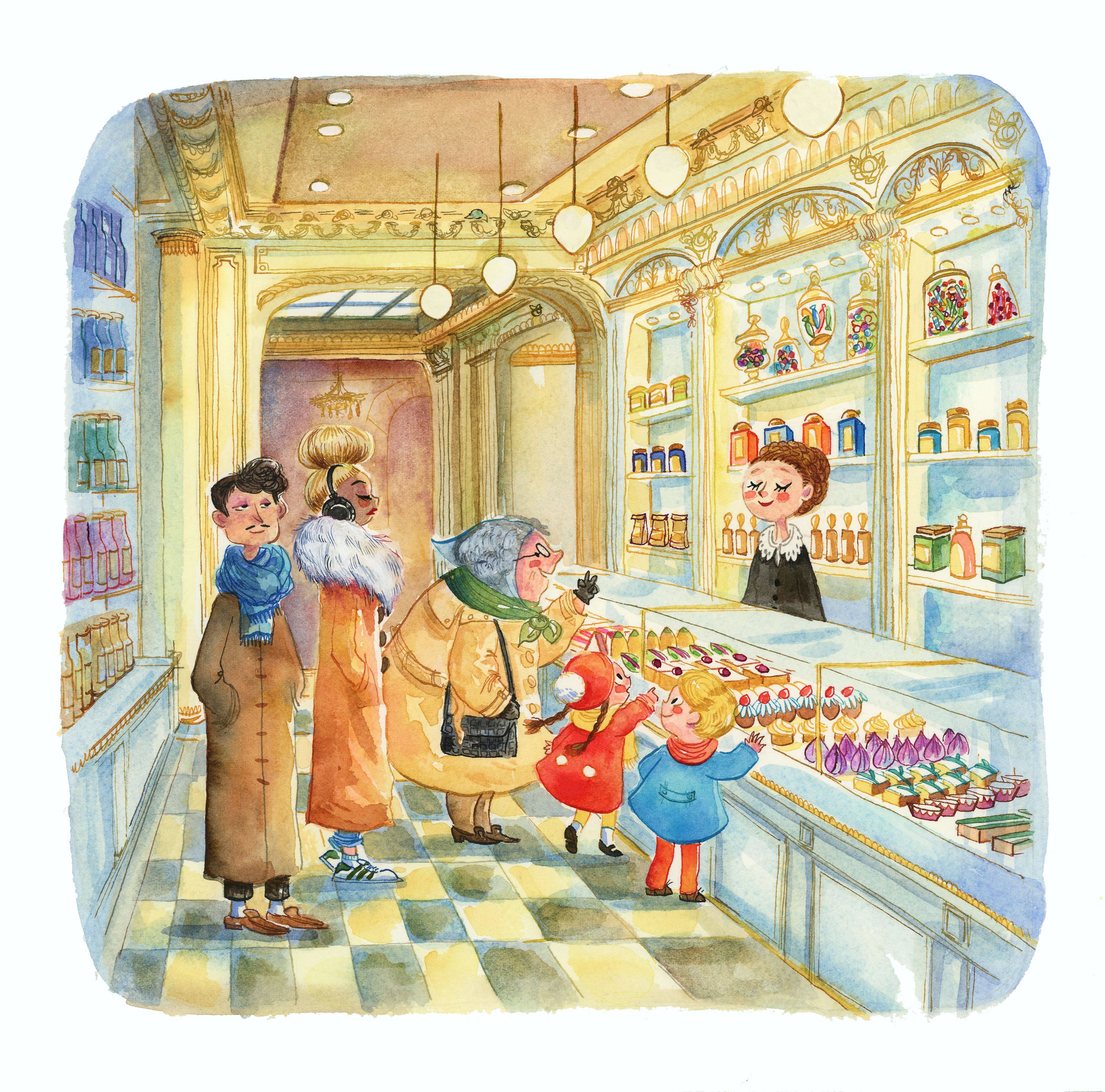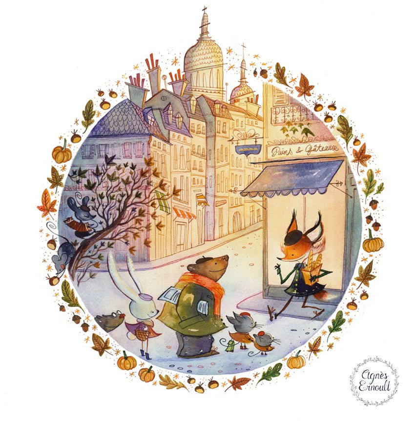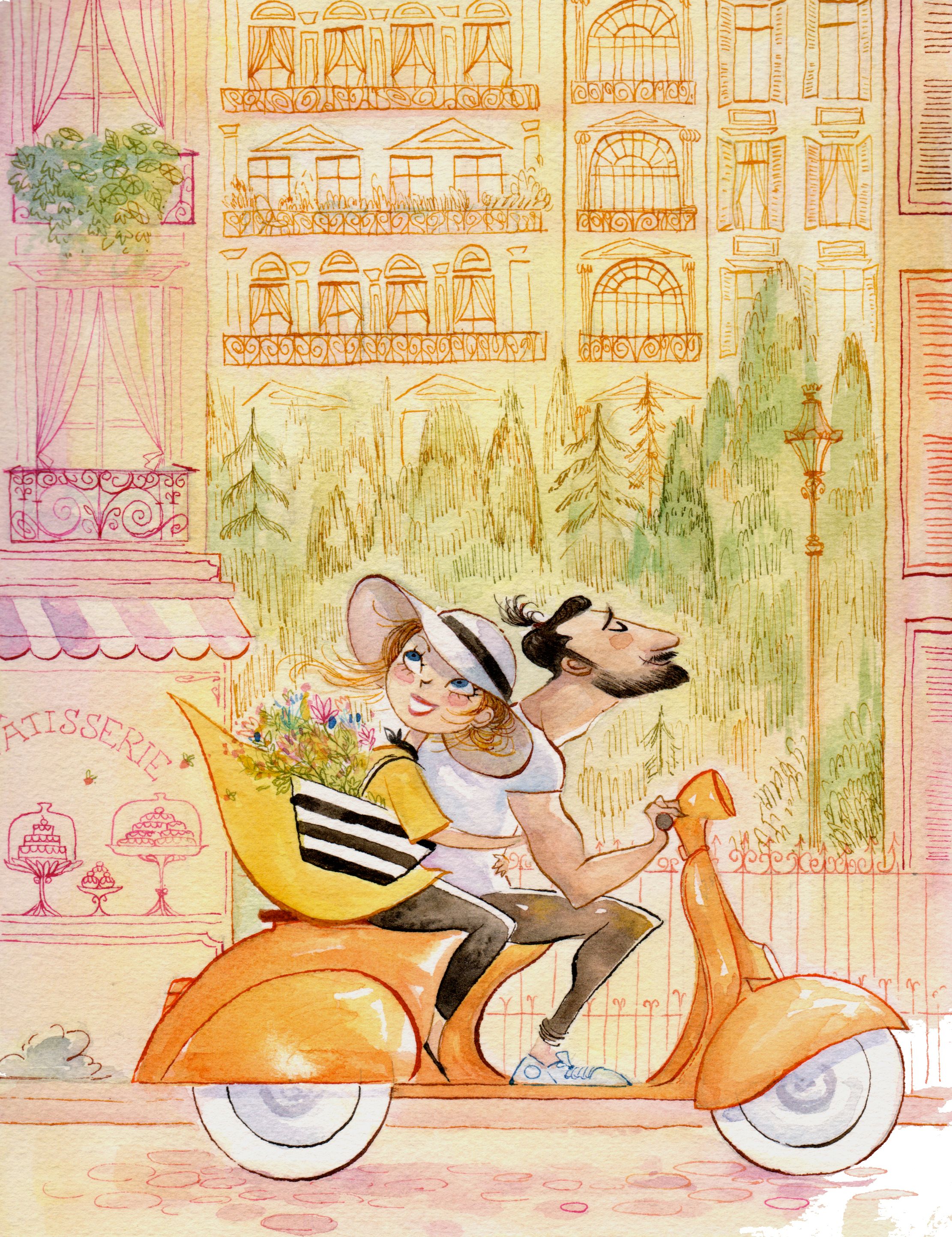 La acuarela de la pareja en la Vespa es una de las ilustraciones más hermosas que he visto. Es una obra de arte. Me encanta.