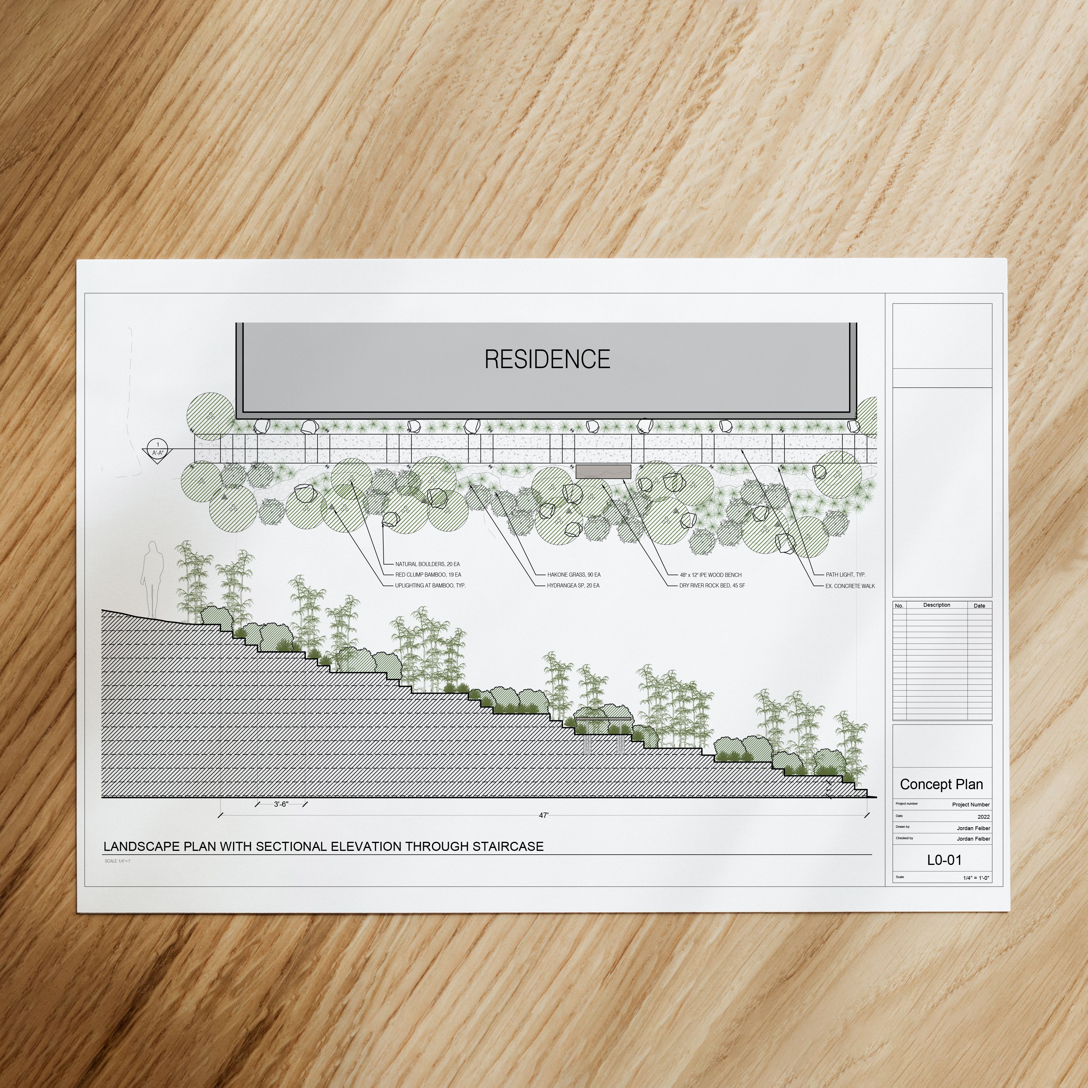 • Enlarged Landscape Plan with Sectional Elevation Through Staircase. Un proyecto de Paisajismo de Jordan Felber - 16.05.2022