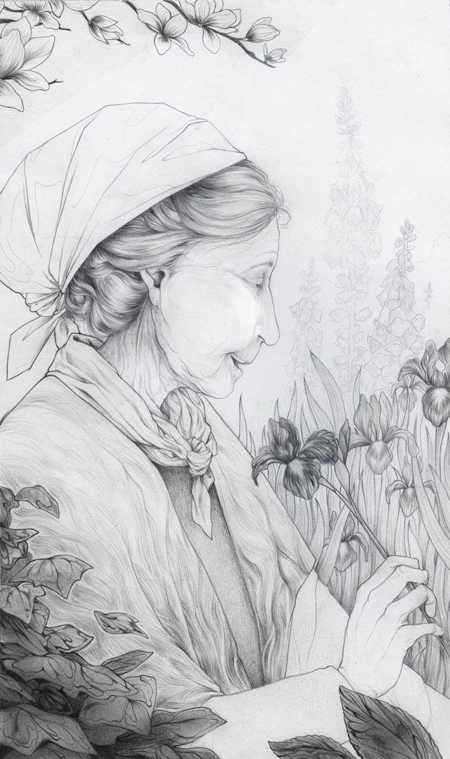 This work was created using a hybrid of traditional graphite line, watercolor textures, photographs, and digital drawing. Added textures such as gold leaf were explored using layer modes and photographic textures.