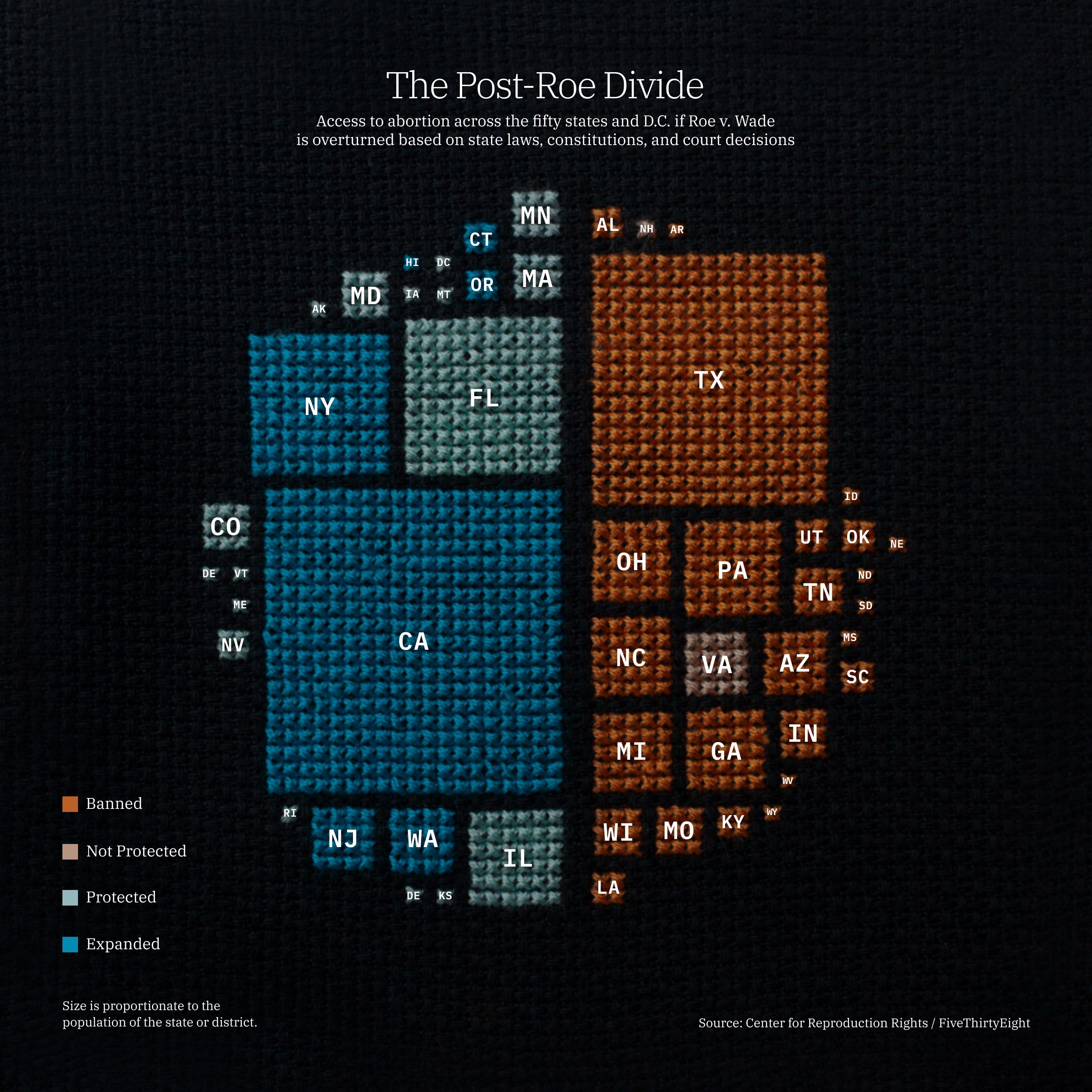 Recently, a document from the U.S. Supreme Court was leaked that proposes to overturn Roe V. Wade, a court decision from the 1970s that protects women's right to abortion in the states. If Roe V. Wade is successfully overturned, the country will be split in half: half of women will be able to access abortion, half will not. I felt compelled to create a piece that depicts this data using cross stitch because it is such an important women's issue. Women's rights are routinely undermined and devalued, similar to women's mediums of art and craft (like cross stitch).