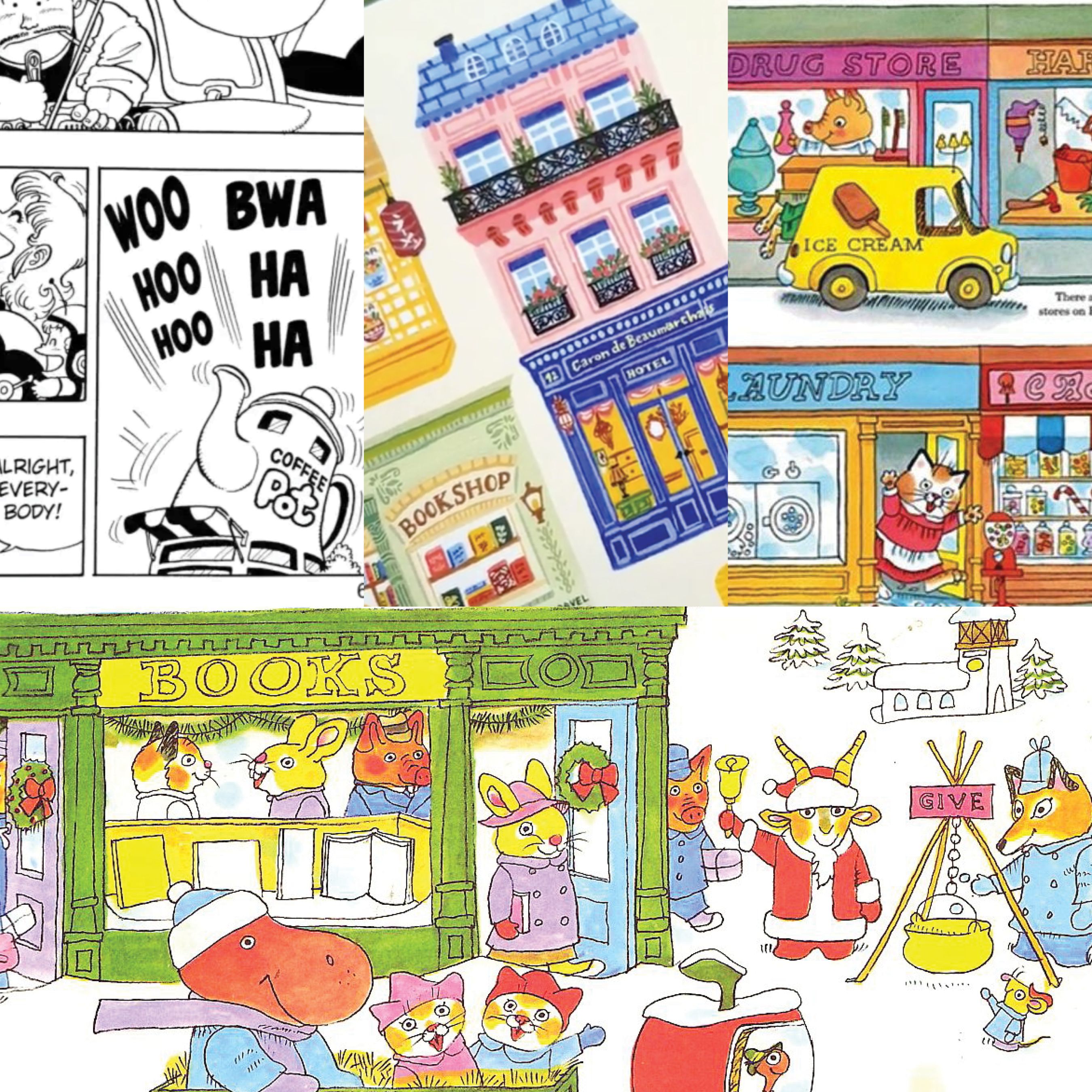 Before I started drawing, I did some research. I was inspired by some comics I was reading at the time, a few artists I follow on Instagram, and the Busytown books by Richard Scarry! I wanted to make a town that felt alive and in looking at the research, I realized I need to make sure I include the townsfolk as much as the storefronts.