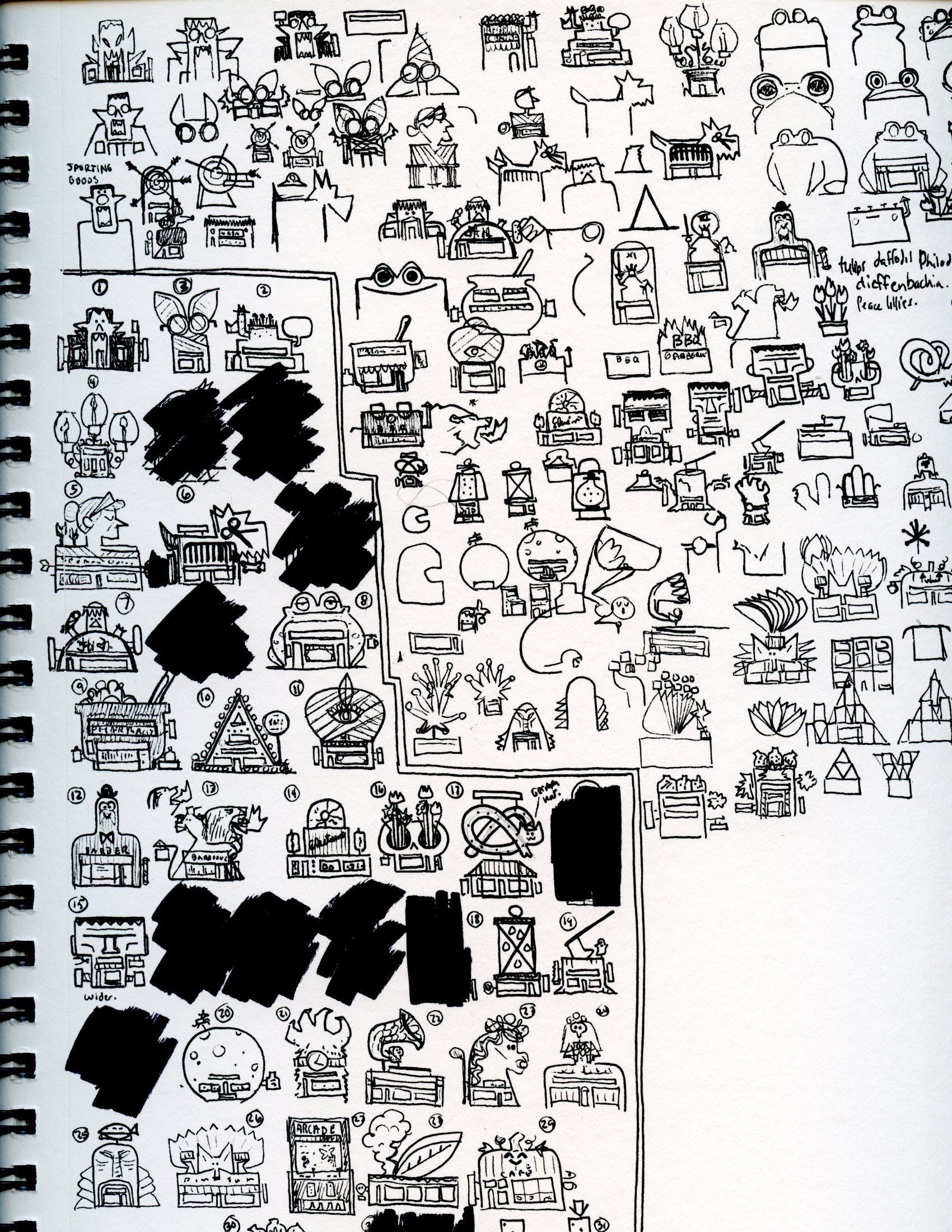 The reason I work so small is so that I can work quickly and make sure I like the overall shape of the shop. The silhouette of each building was important so that they didn't all look like the same rectangle and drawing small like this helped avoid that.