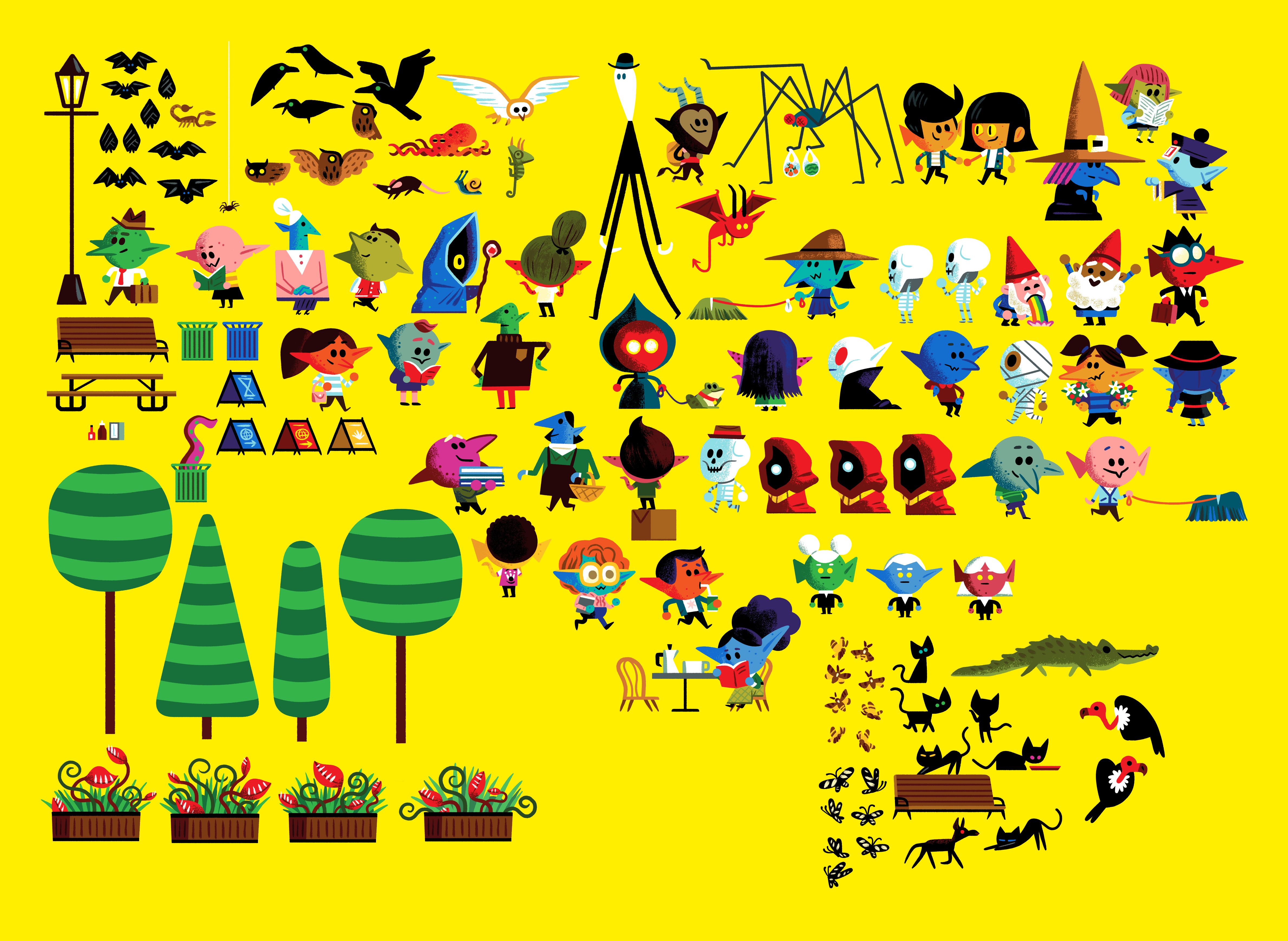 Including people and trees and other little details were important to me. It's what made the shops feel real and the town feel alive. Below are most of the creatures and characters that appear around Booburgh. Elements like trees and trash cans repeated.