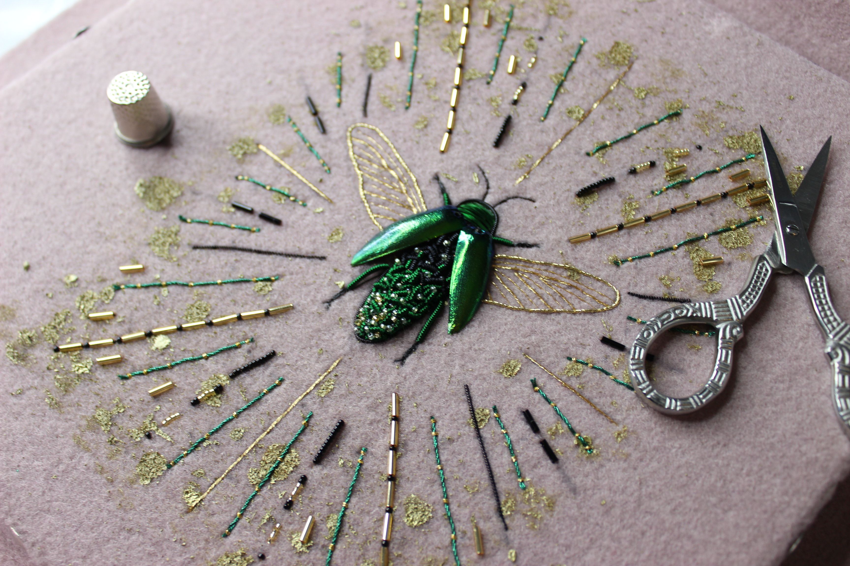 This project was inspired by jewel beetles. I bought some wings from a local supplier and didn't realise they were real until I got them! I wanted it to be realistic but didn't realise quite how real they could be. I have a great love for this piece as it inspired me a lot for the future and also opened some doors for me in the embroidery and creative world.