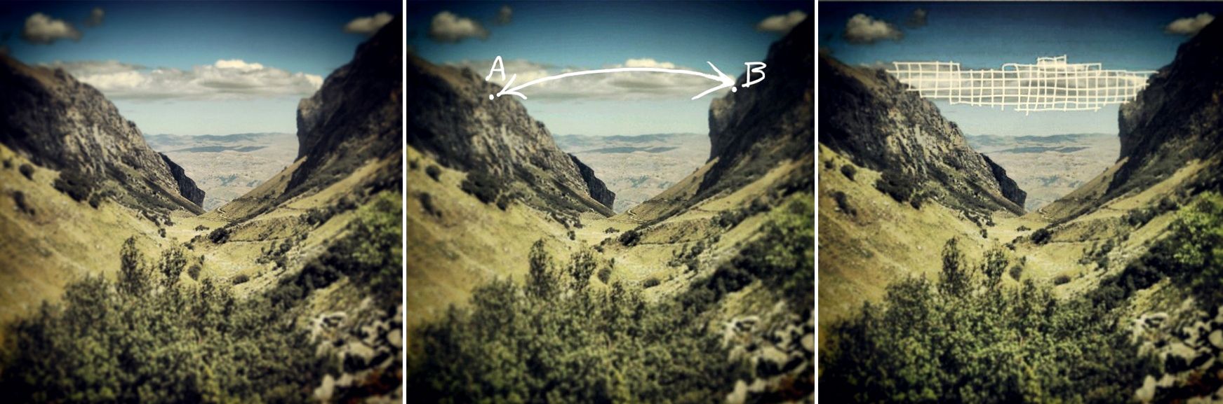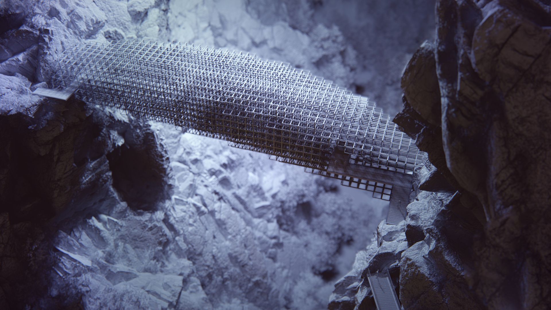 Merging computational techniques with a natural architectural language, ‘the Cloudbridge’ by Arturo Tedeschi reflects the site’s existing landscape. Influenced by 60’s avant garde (in particular by the italian team Superstudio), the project creates a non-linear path suspended between two points. Responding to both the mountain and the sky, a specific algorithm was used to design a cloud-shape grid that balances the asymmetric loads of the footbridge. The bridge links two mountainsides via an ethereal, cloud-like structure. Though bridges are often a visual statement of strength, the Cloudbridge appears to float between mountains, blending into its natural surroundings. The latticed structure, bolstered by extreme engineering, creates a super stable bearing system that is meant to push the boundaries of architecture, engineering and construction.