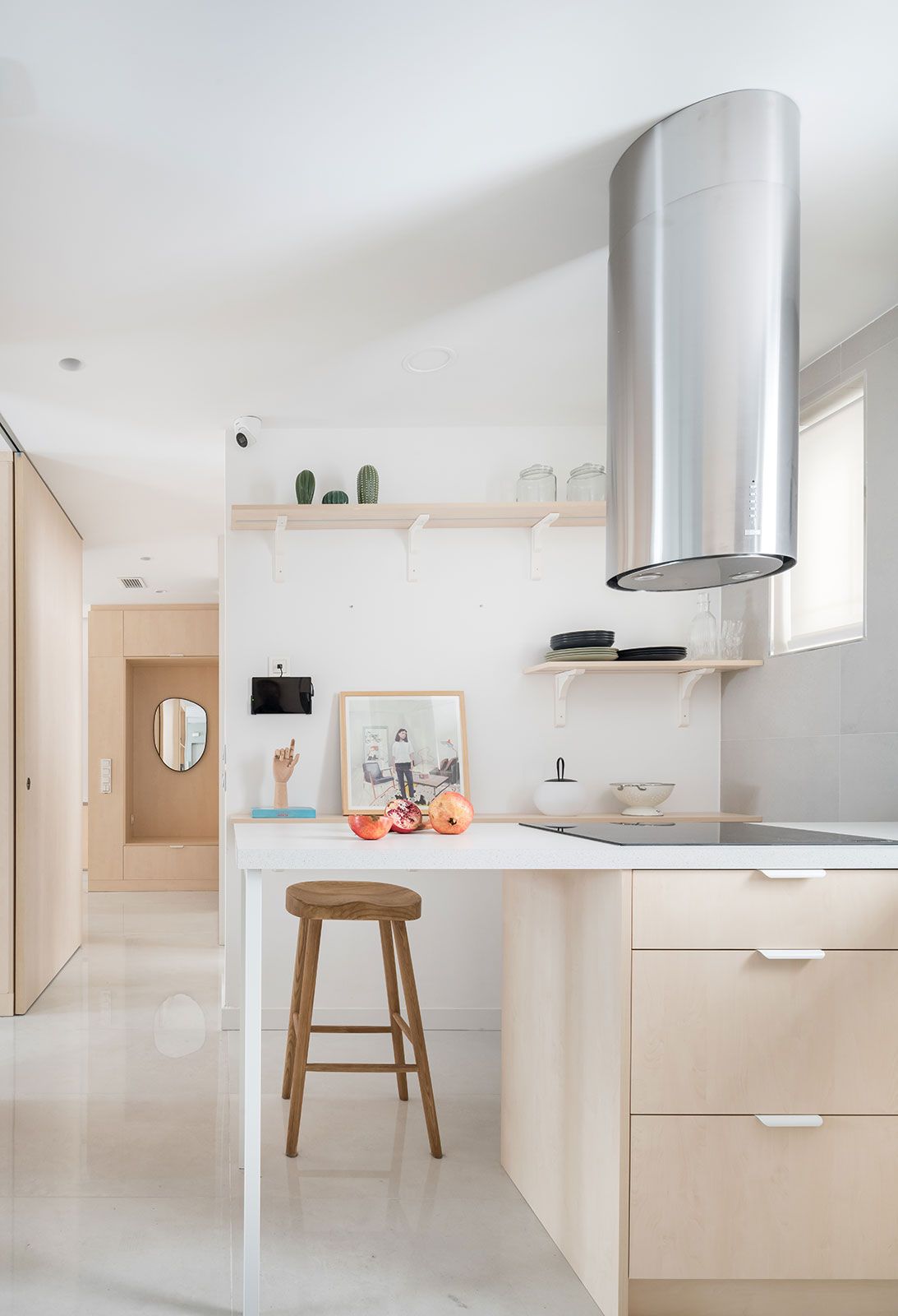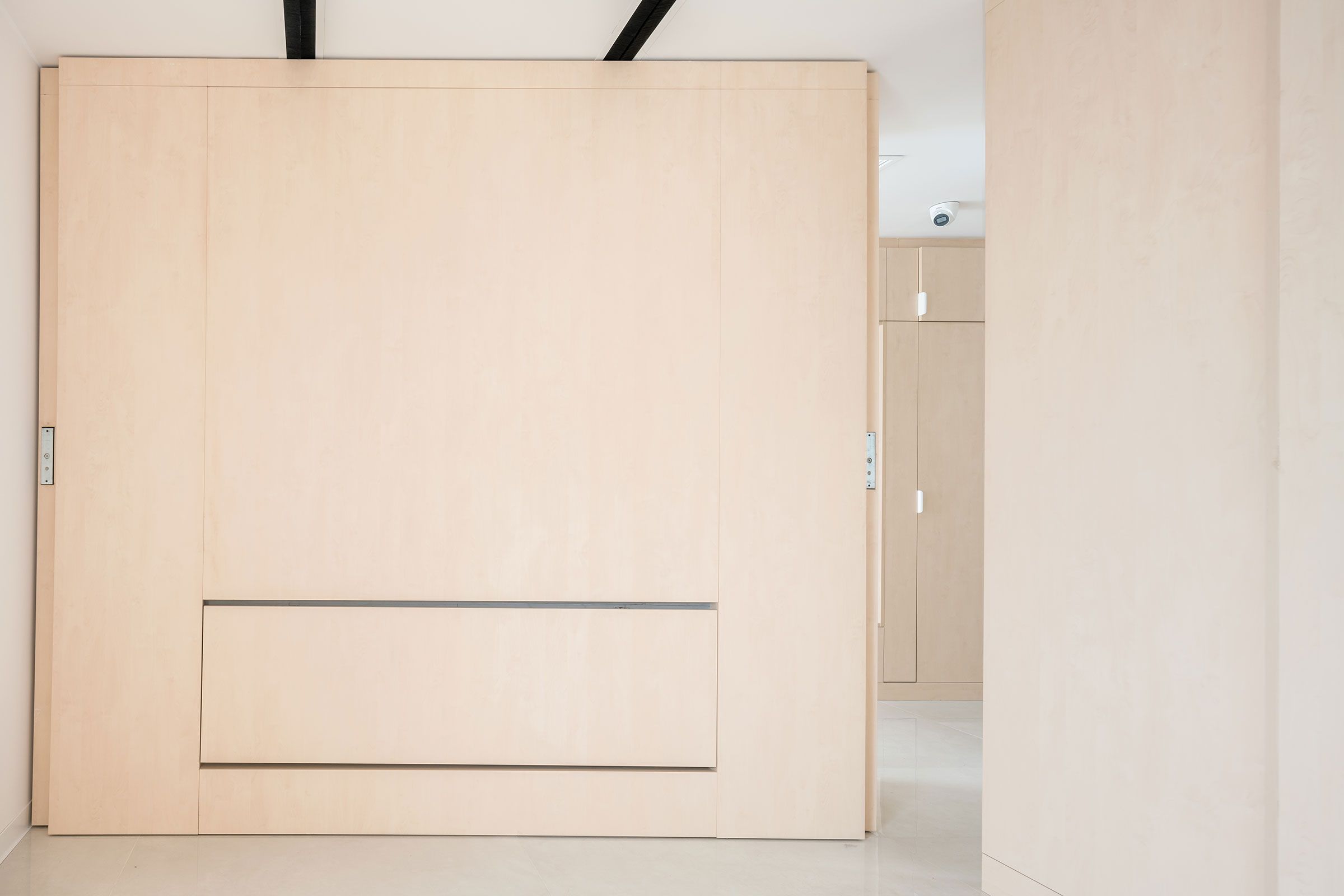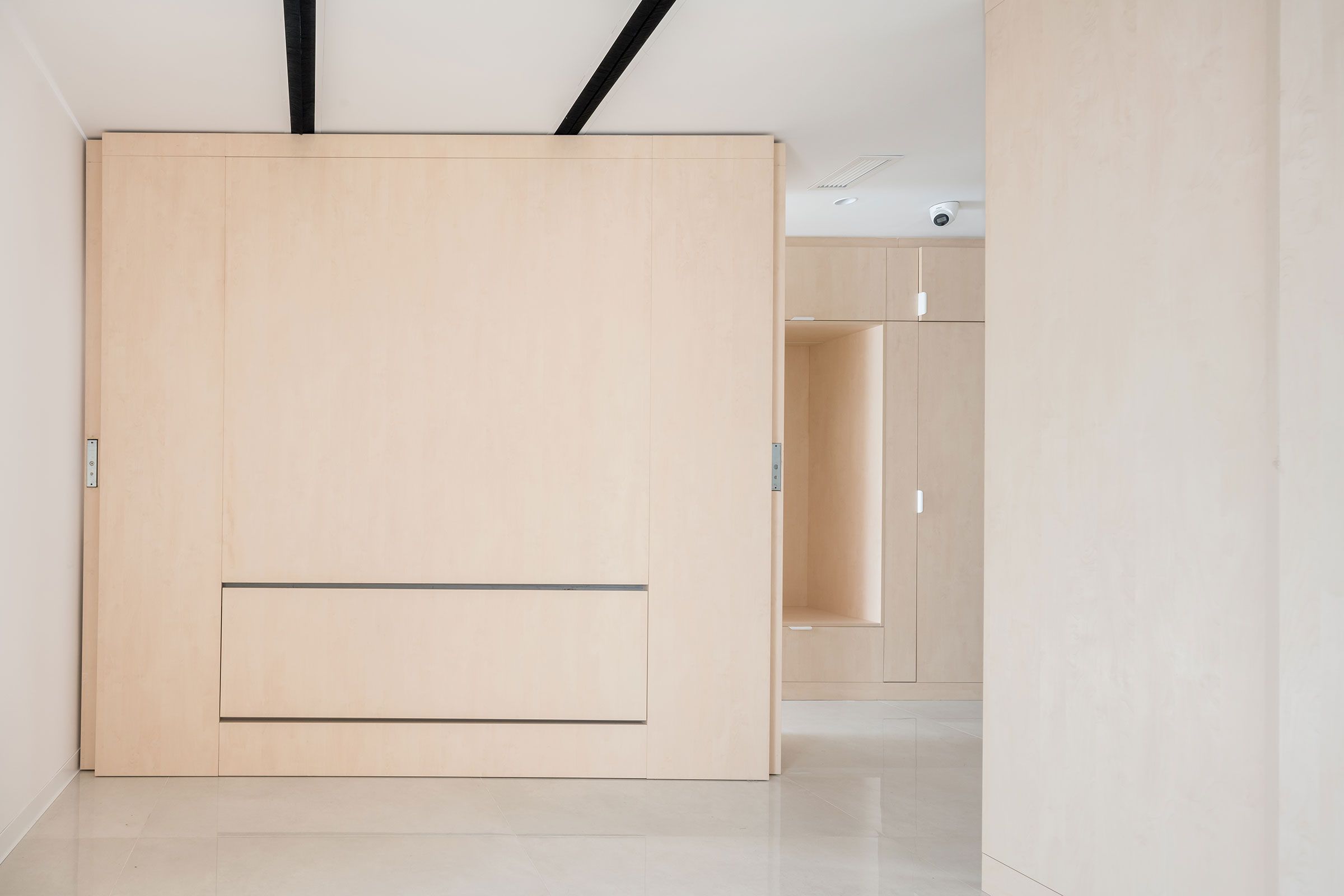 El apartamento cuenta con dos dormitorios, uno de ellos con vestidor, dos zonas de trabajo o estudio, salón, baño y una cocina de hasta 30 m². Todo ello, equipado con dos paredes móviles que permiten rotar y distribuir todas las estancias de la casa con un gesto sencillo y cómodo, según las necesidades del momento. Además, estas paredes están equipadas con camas plegables, mesas de comedor o de trabajo, y diversos equipos de almacenaje y estanterías.
