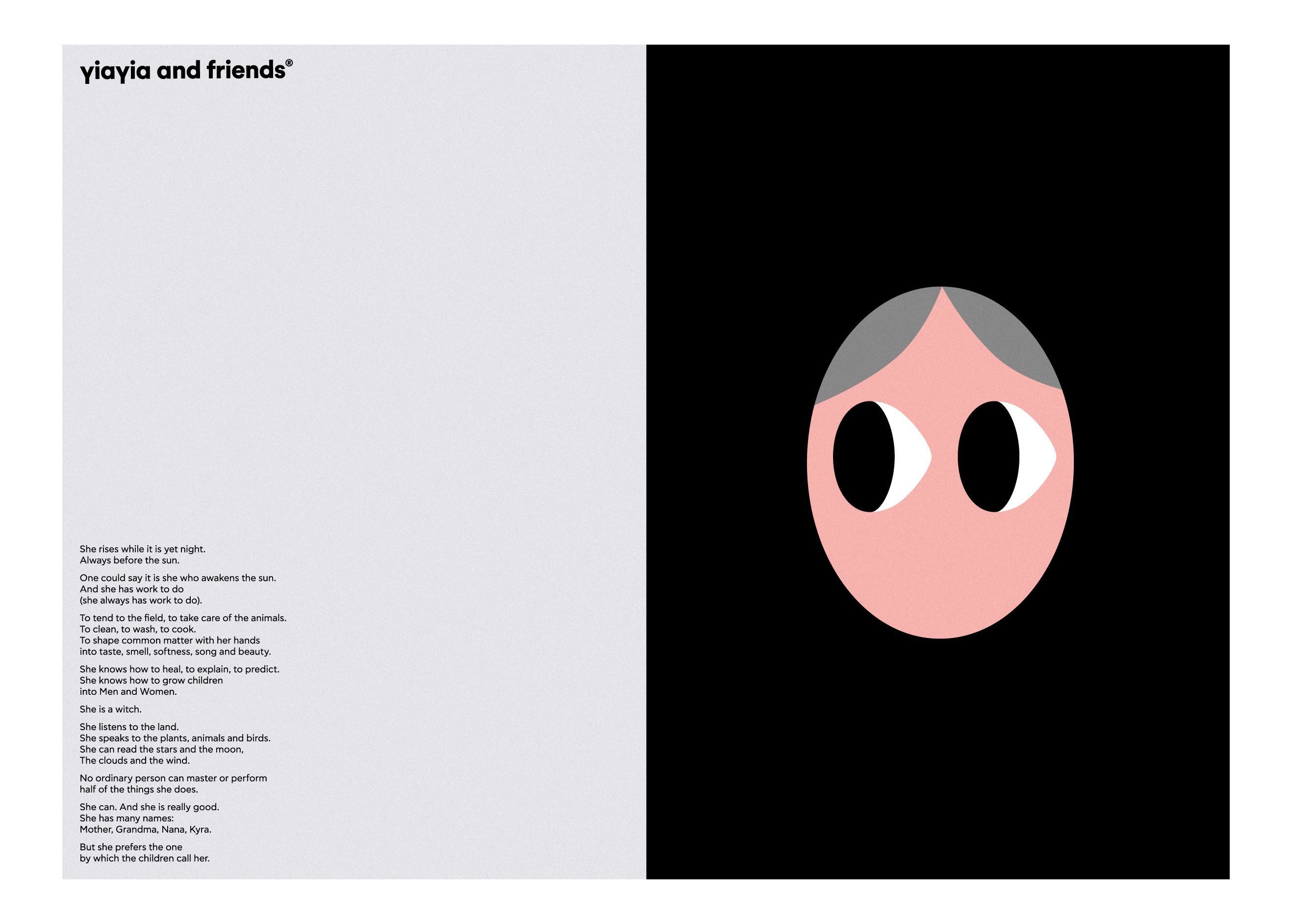 “Yiayia and friends” is a multi-faceted project that re-imagines and re-introduces traditional notions of life, superior quality food products, culinary objects and epicurean artefacts of yesteryear. At the heart of the design project “Yiayia” (“granny” in Greek) is glorified in a key-storyline as the super-powerful, all-knowing but also a discreet person that she is. Together with her “friends” from both the human and animal kingdom the art of growing, cooking and sharing food together, along with everything that is attached to it, is remembered, re-introduced, and re-imagined for generations to come. This is a story about YIAYIA. A Greek granny together with her animal friends spread the message of family values through food related stories and experiences conceptualised with a fresh perspective and a sense of humour.