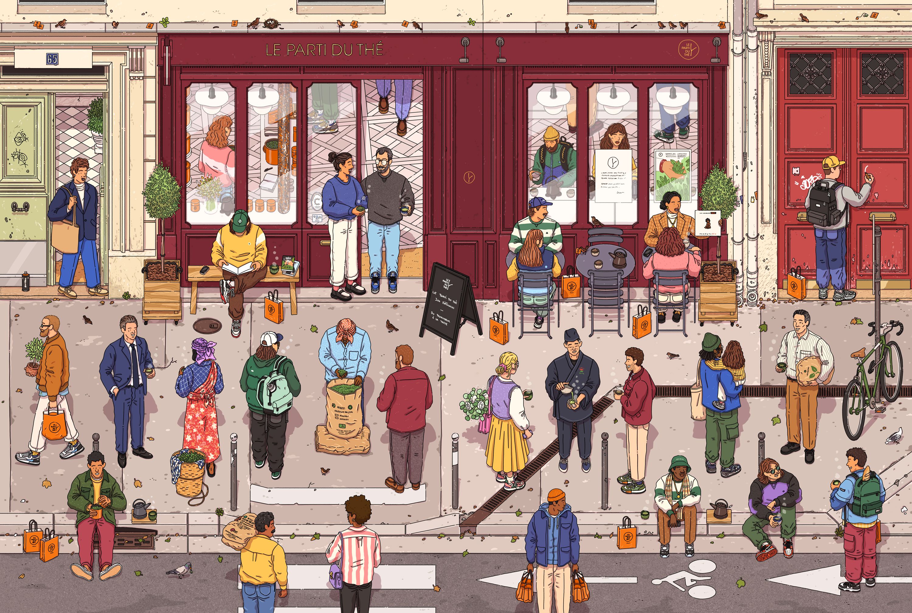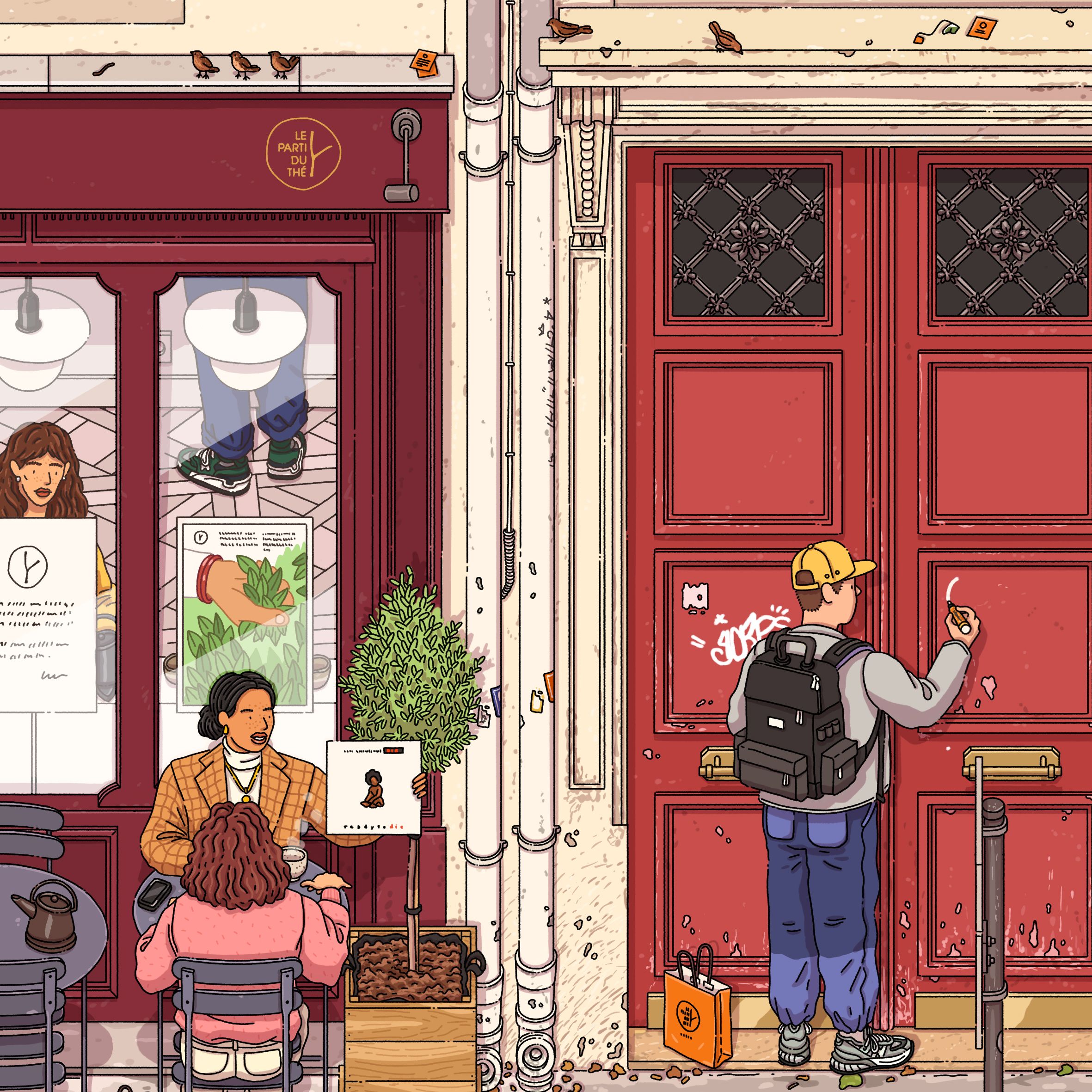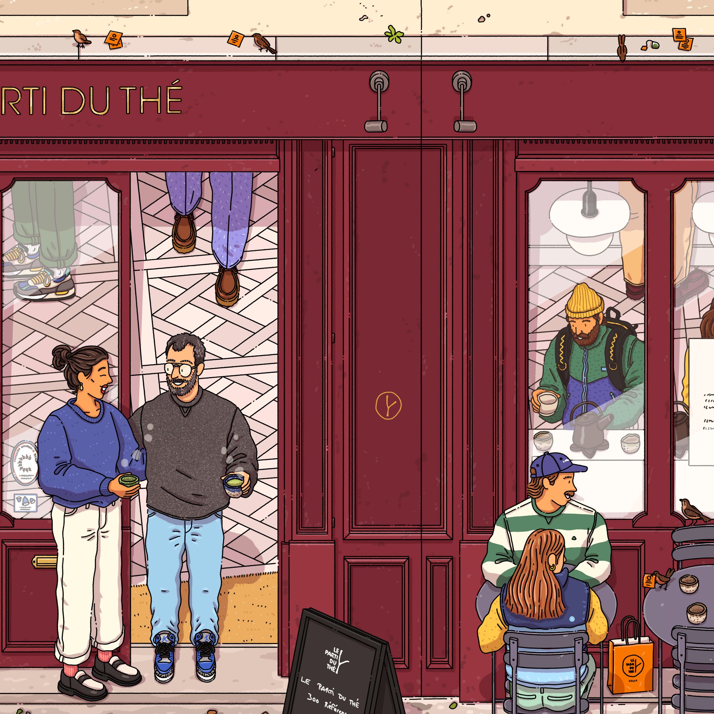 Collaboration avec Le Parti du Thé pour leur collection de coffrets pour Noël. La collaboration comprend aussi des boîtes à thé personnalisées, des t-shirts, un hoodie, des tote bags et la réalisation de vitrophanies pour les vitrines des boutiques.