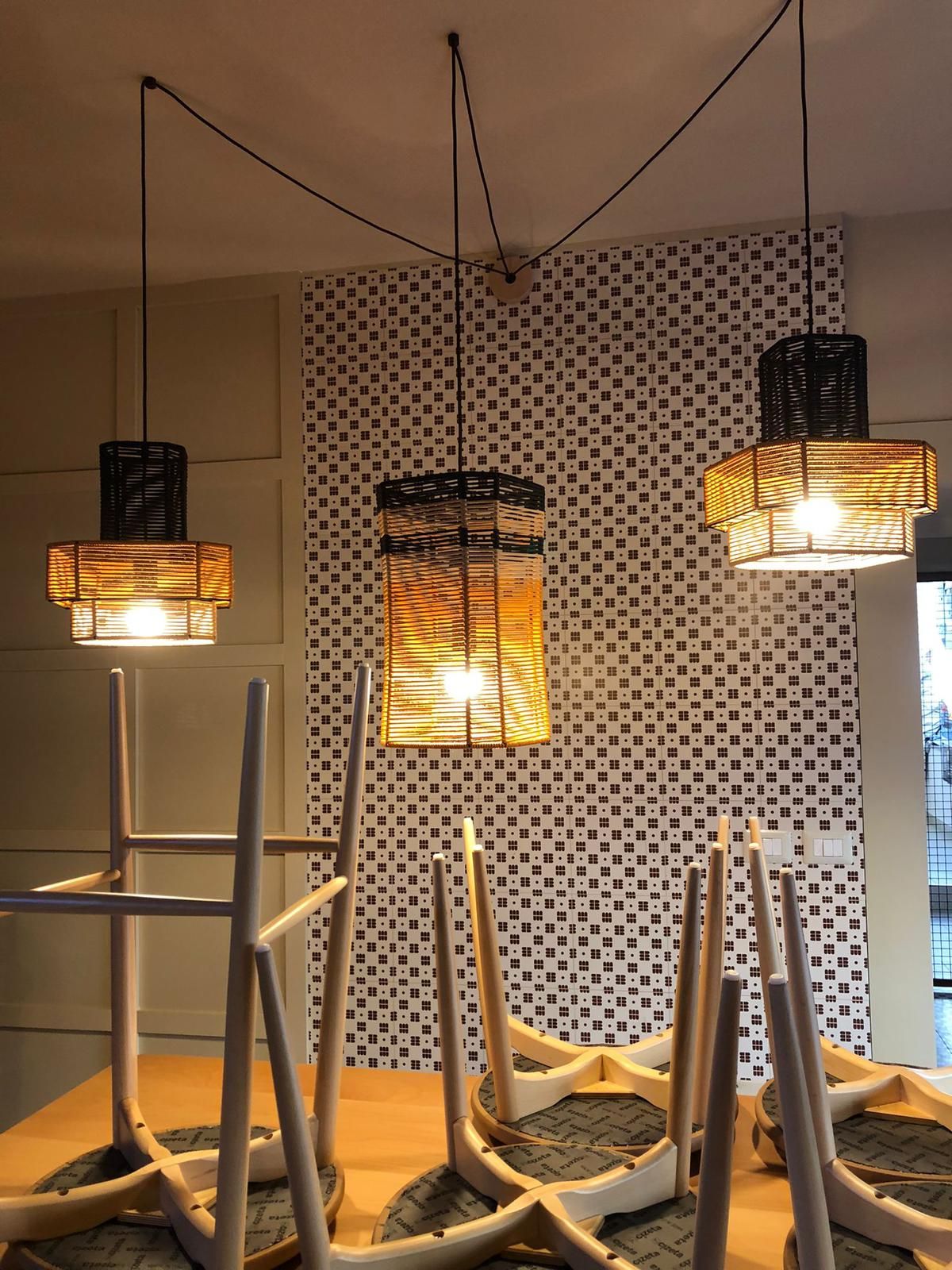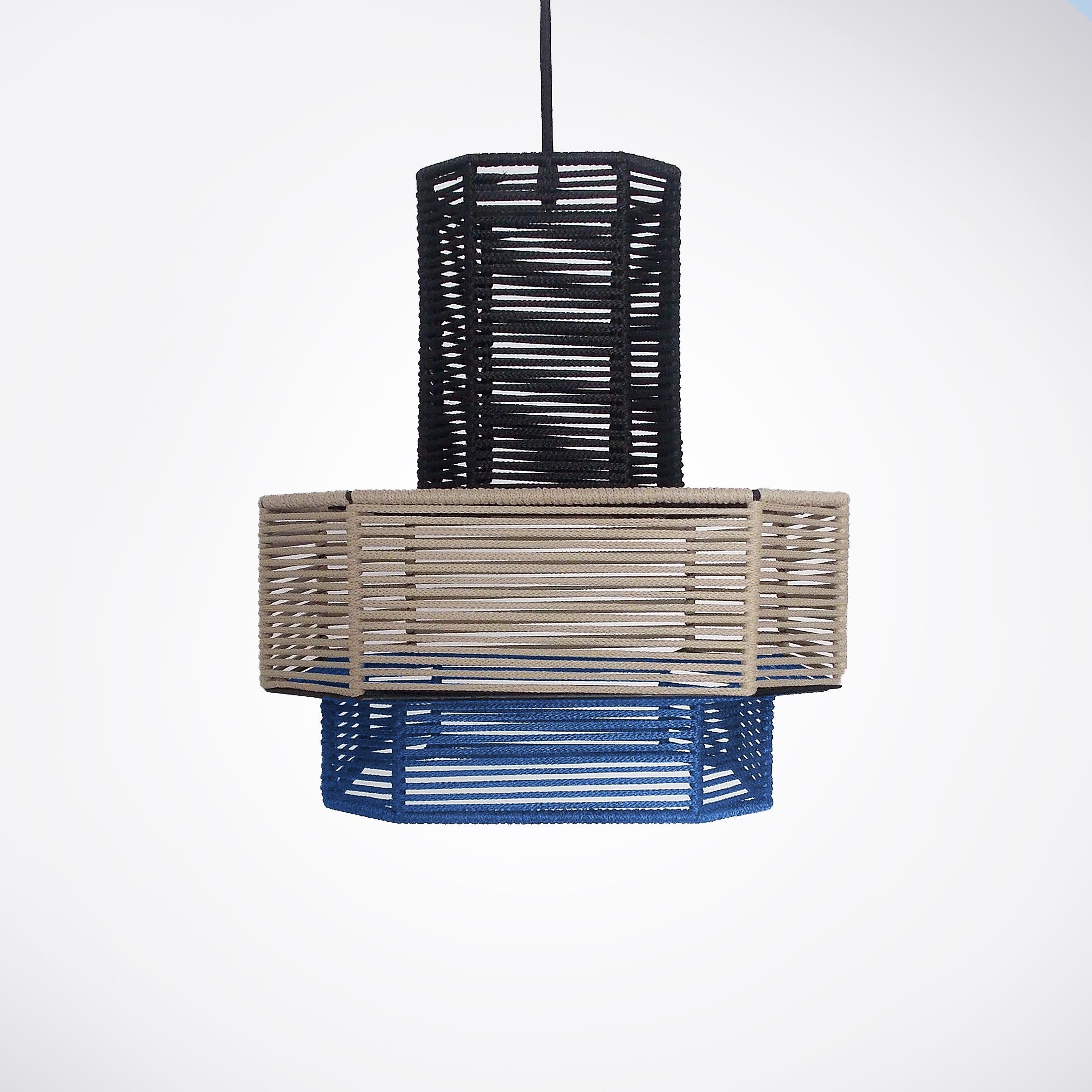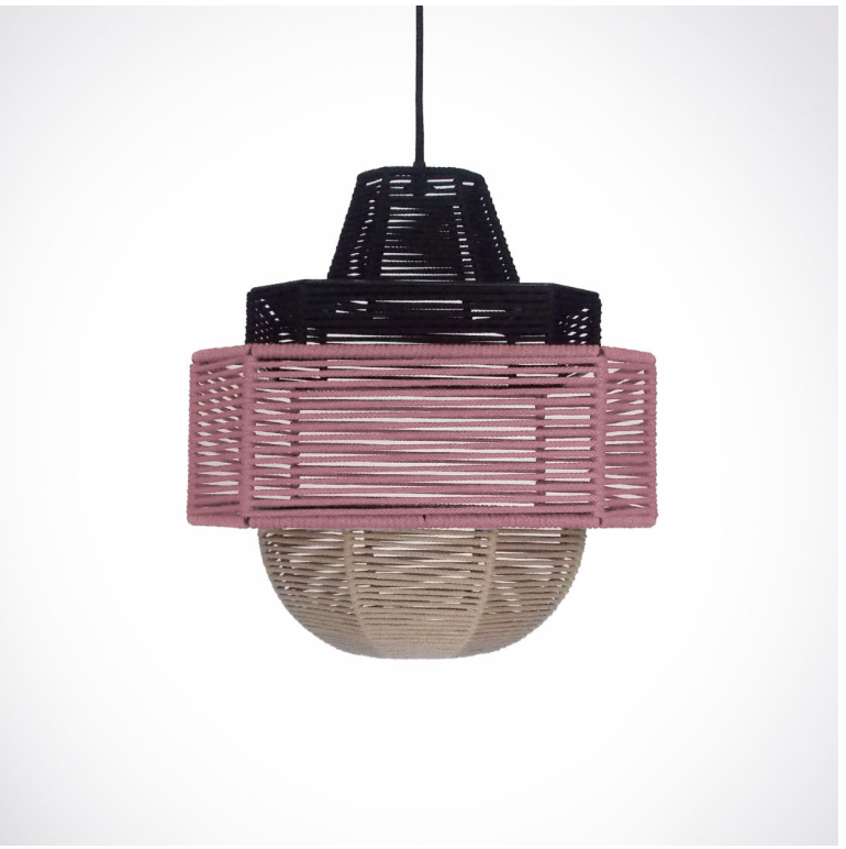 Per il design ho voluto sovrapporre dei blocchi colorati dalle forme geometriche semplici . La struttura è fatta a mano in fil di ferro, il rivestimento è una corda in PPL di 5mm che viene intrecciata direttamente sulla struttura .