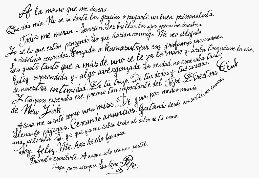 La Pepe está inspirada en la caligrafía con la que Andy Warhol acompañaba sus dibujos e ilustraciones durante su primera etapa. Su manufactura muestra una cierta torpeza en el trazo y un extraordinario mimo en su ejecución. Este es el origen de la vitalidad y la frescura que respira la Pepe. Una tipografía desinhibida y sin prejuicios. Certificado de Excelencia en Diseño Tipográfico, TDC 2001. Compra la FF Pepe aquí.