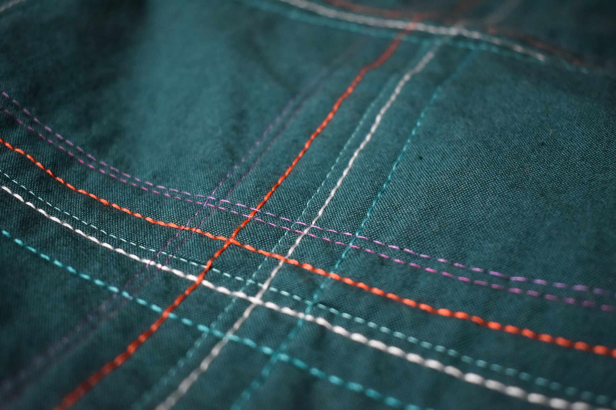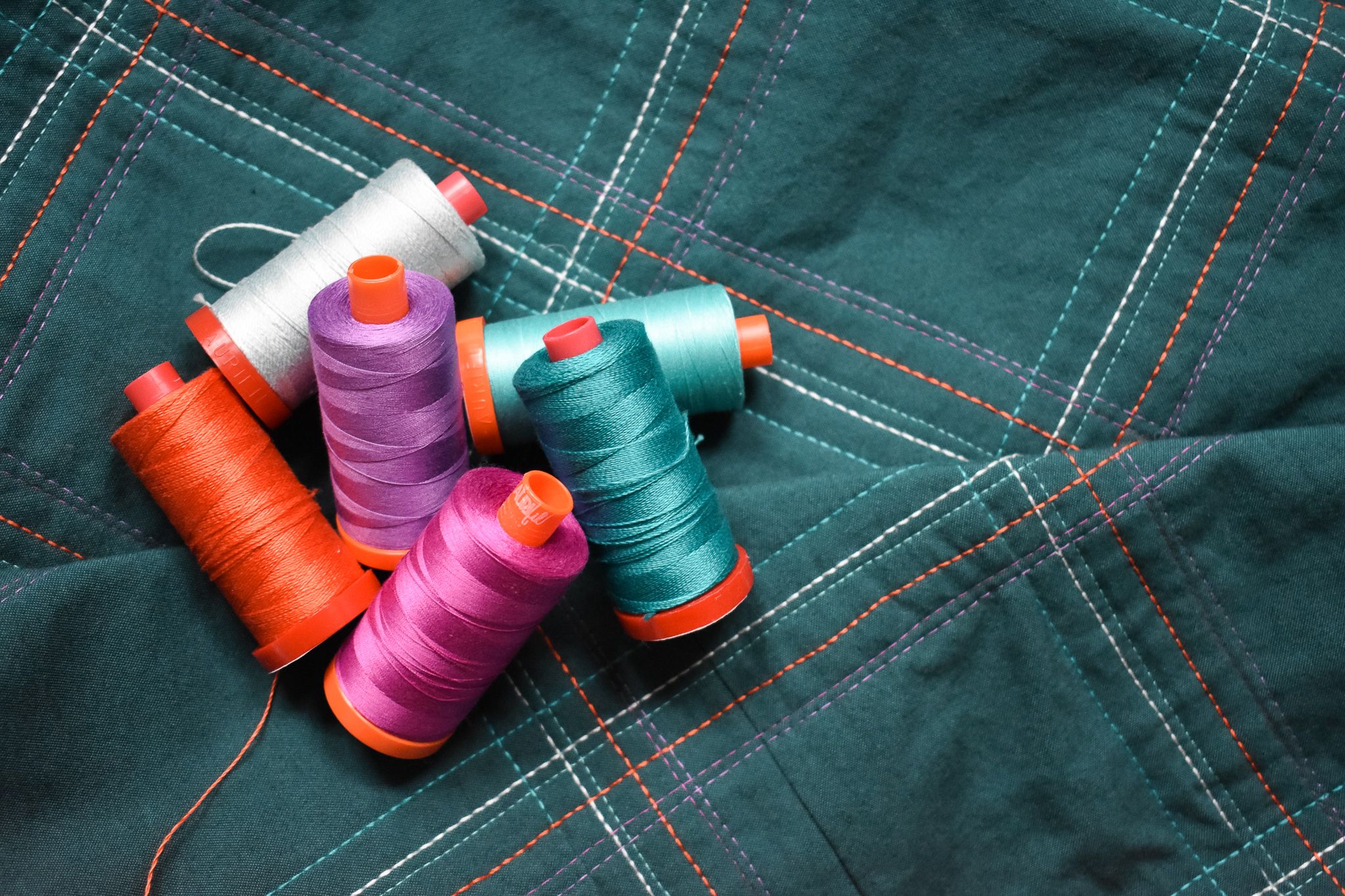 Working on a wholecloth front (with an improv pieced backing of various sized fabric scraps) to play with different weights and colors of threads when quilting in a repeating plaid grid pattern.