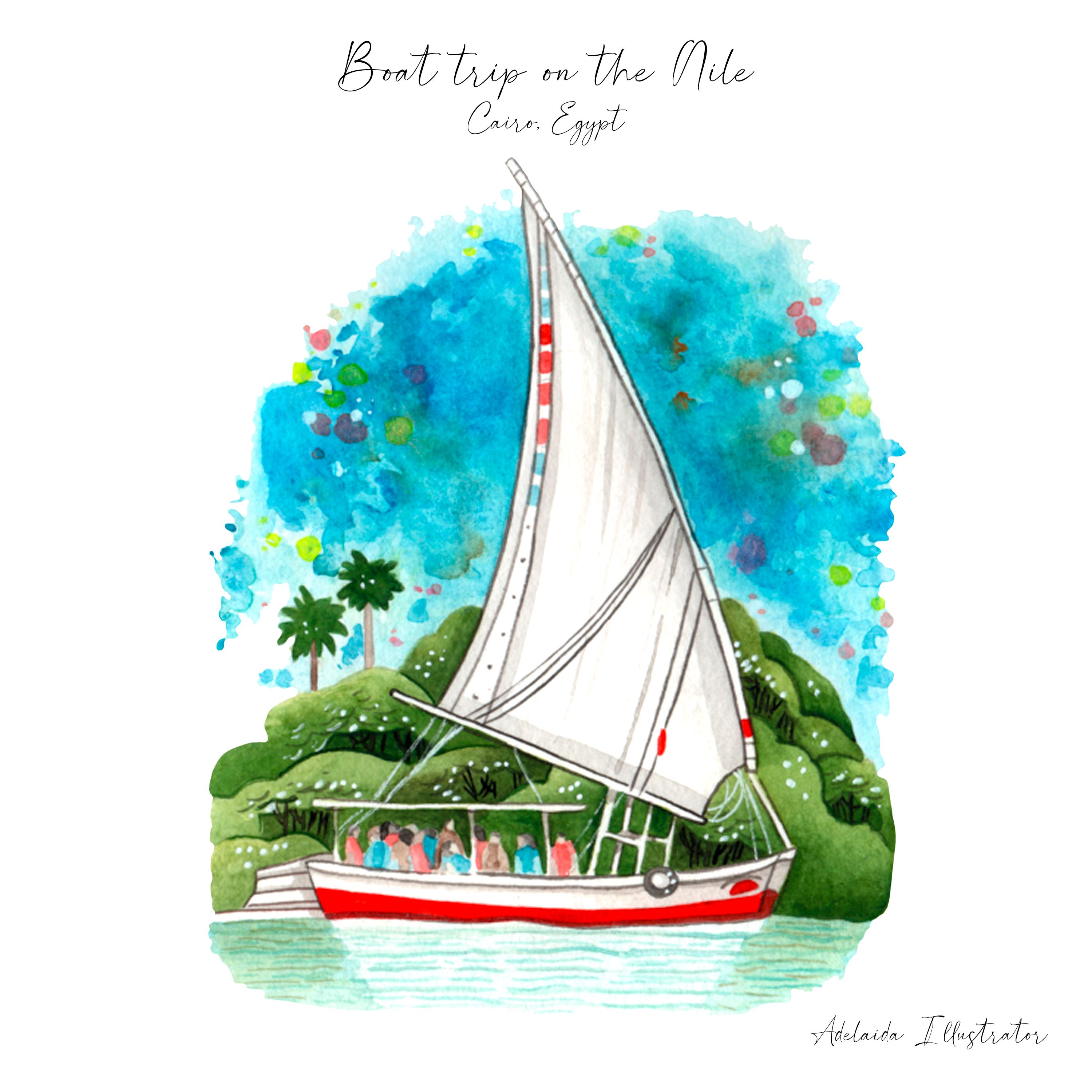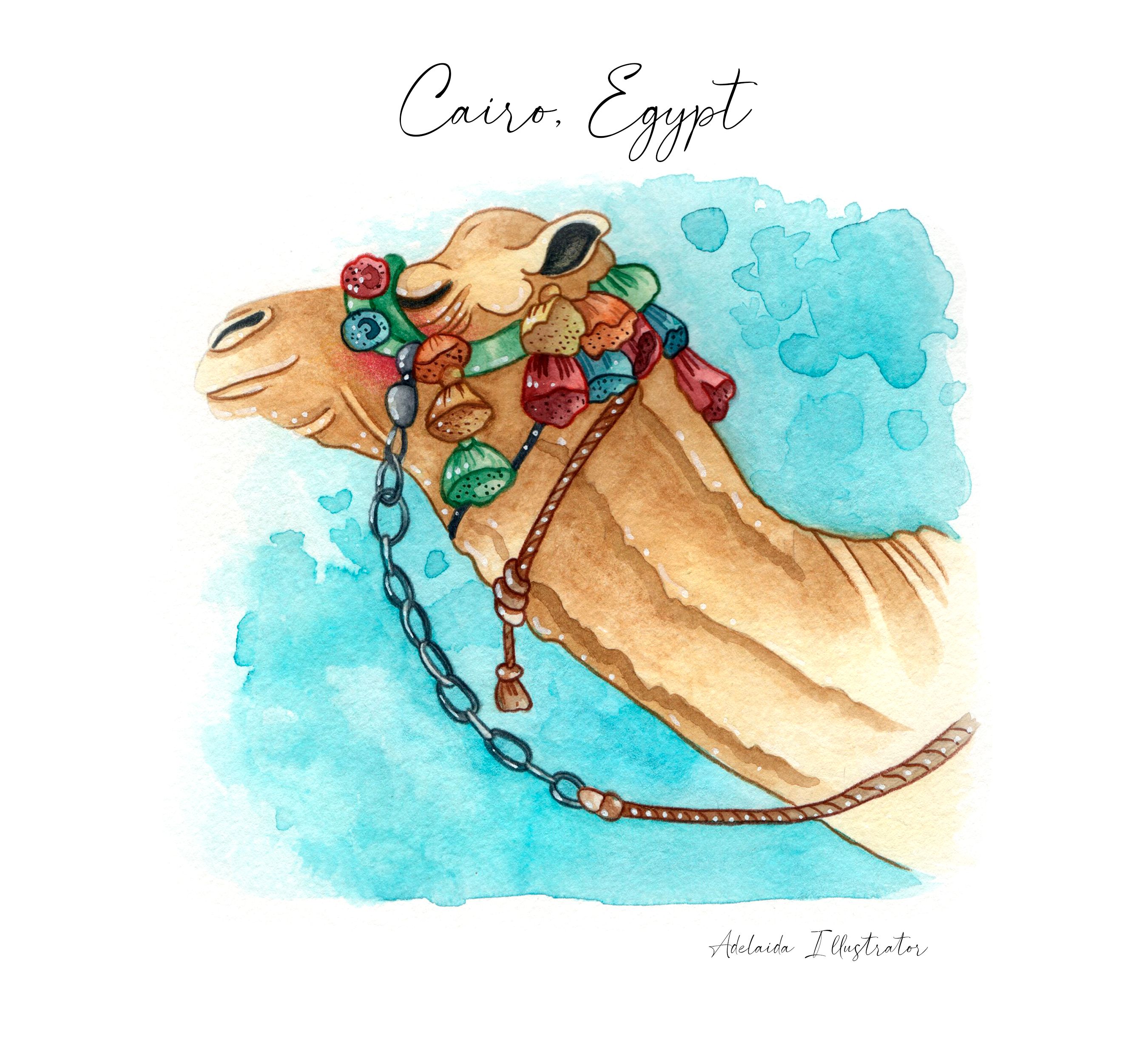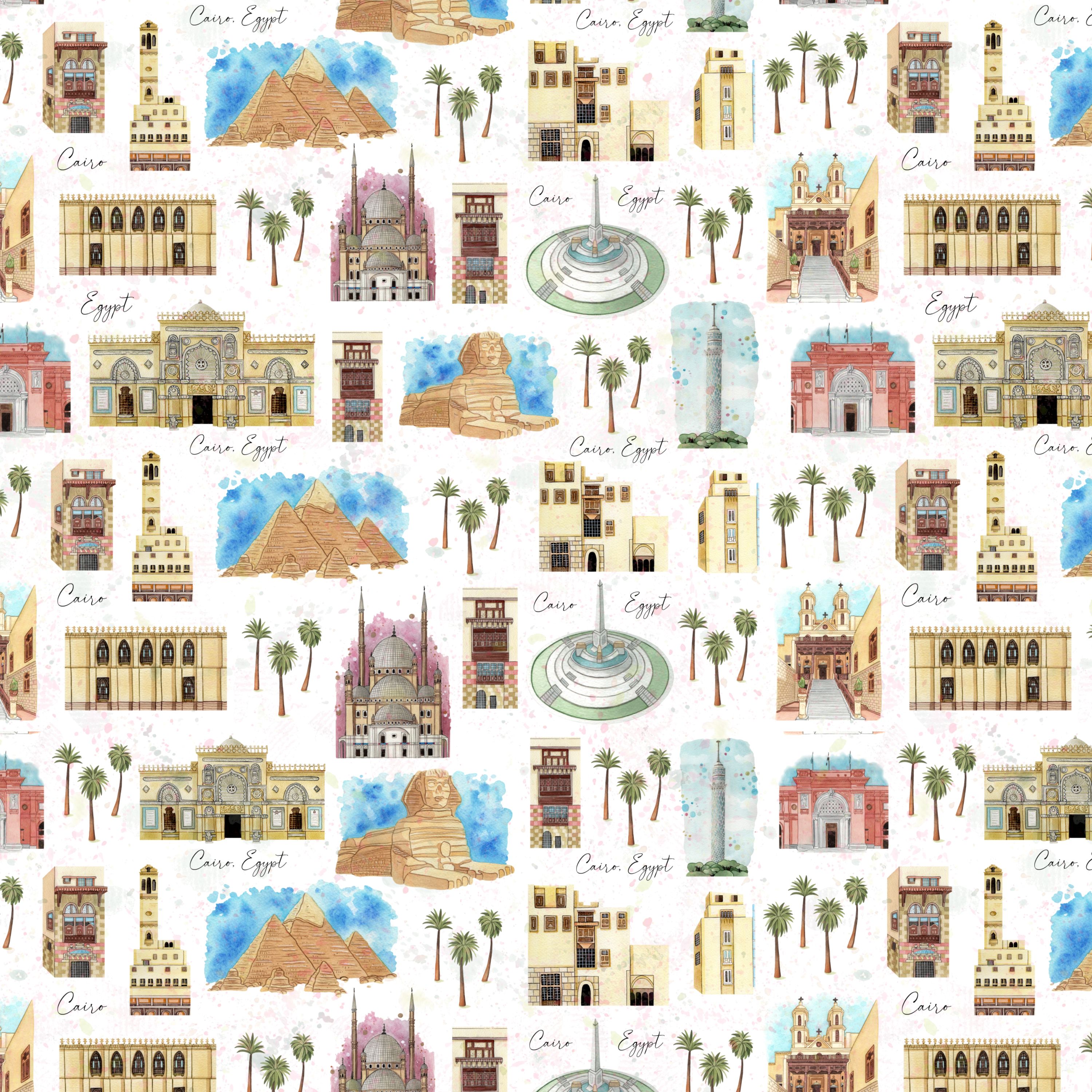 Proyecto dedicado a la ciudad de El Cairo, Egypto. Está formado por ilustraciones y patterns dibujados y pintados a mano con técnica mixta y terminados en Photoshop. Es un trabajo para aplicar en productos de decoración, papelería, textil... y también para su venta individual como prints, stickers, postales...