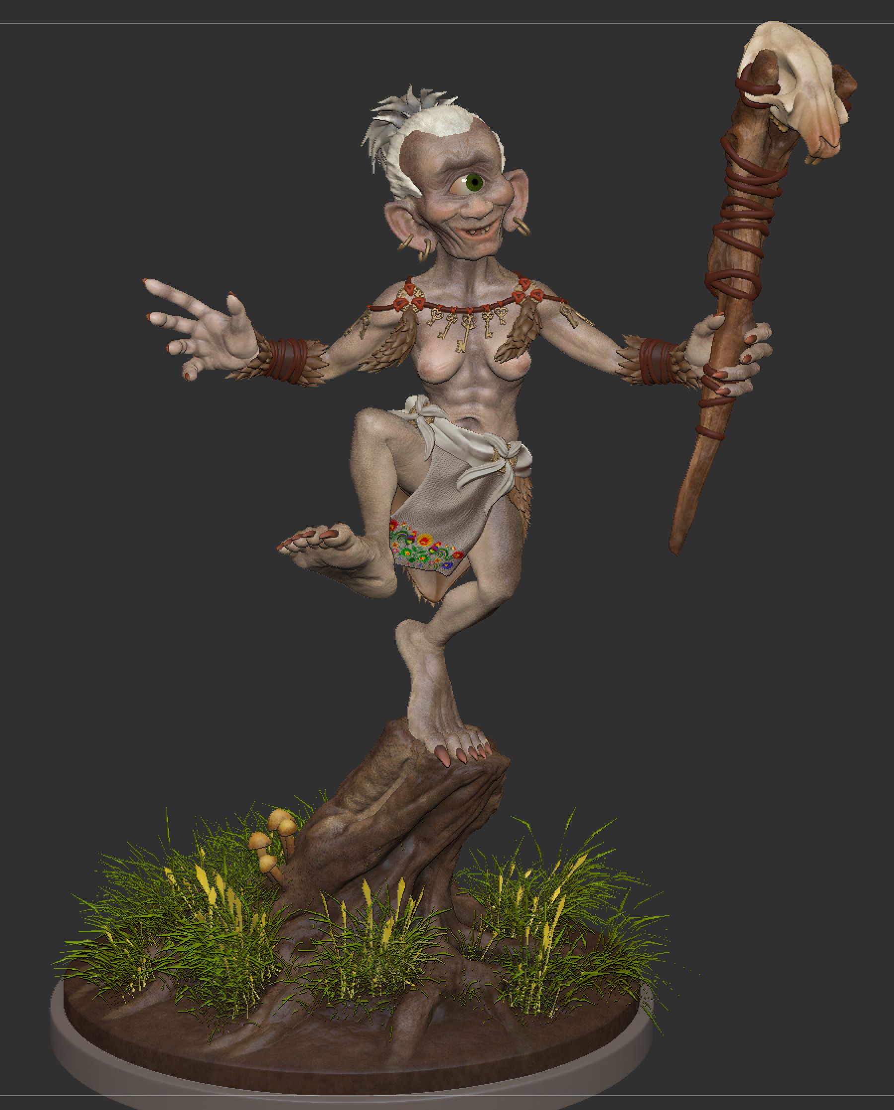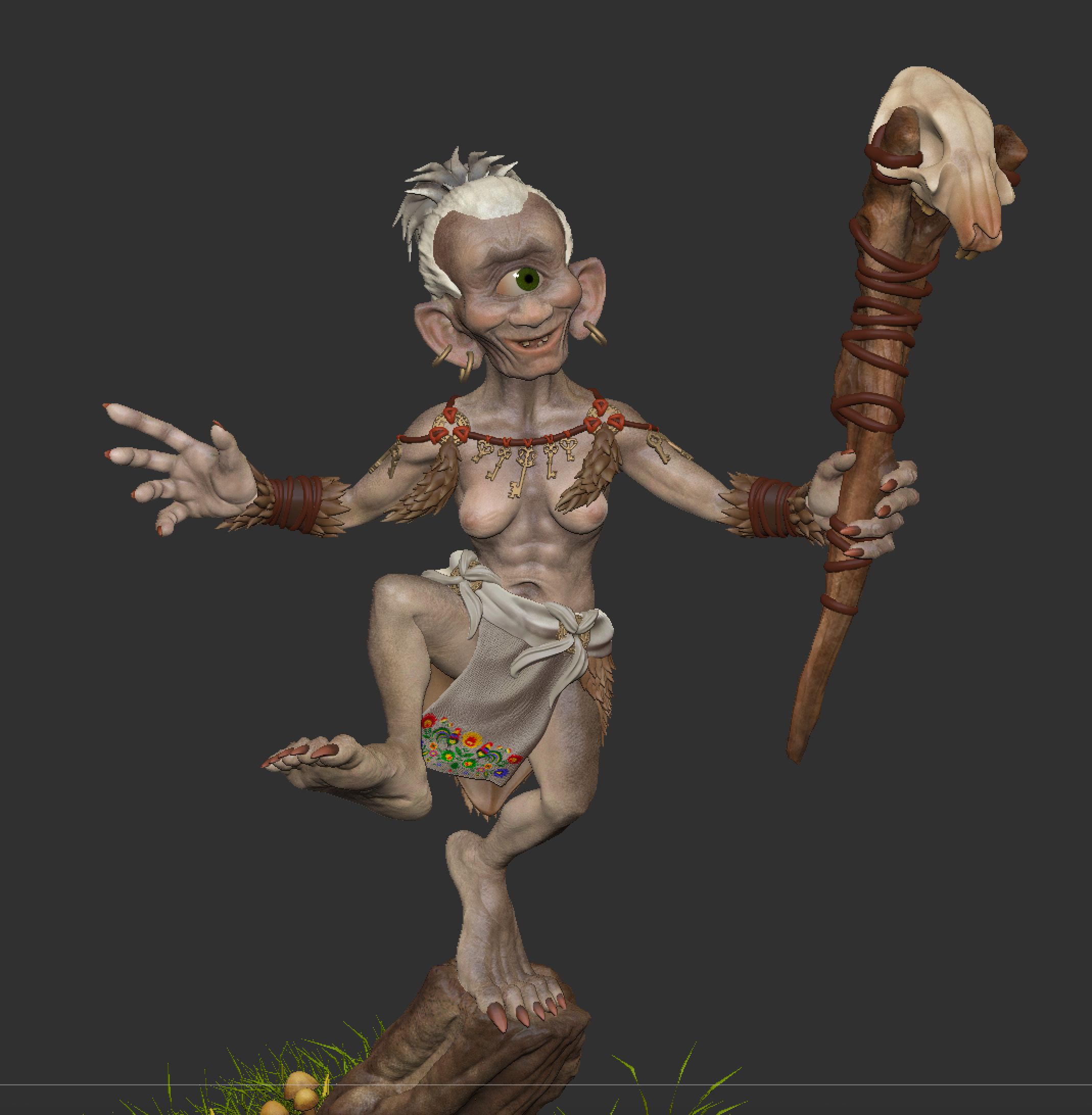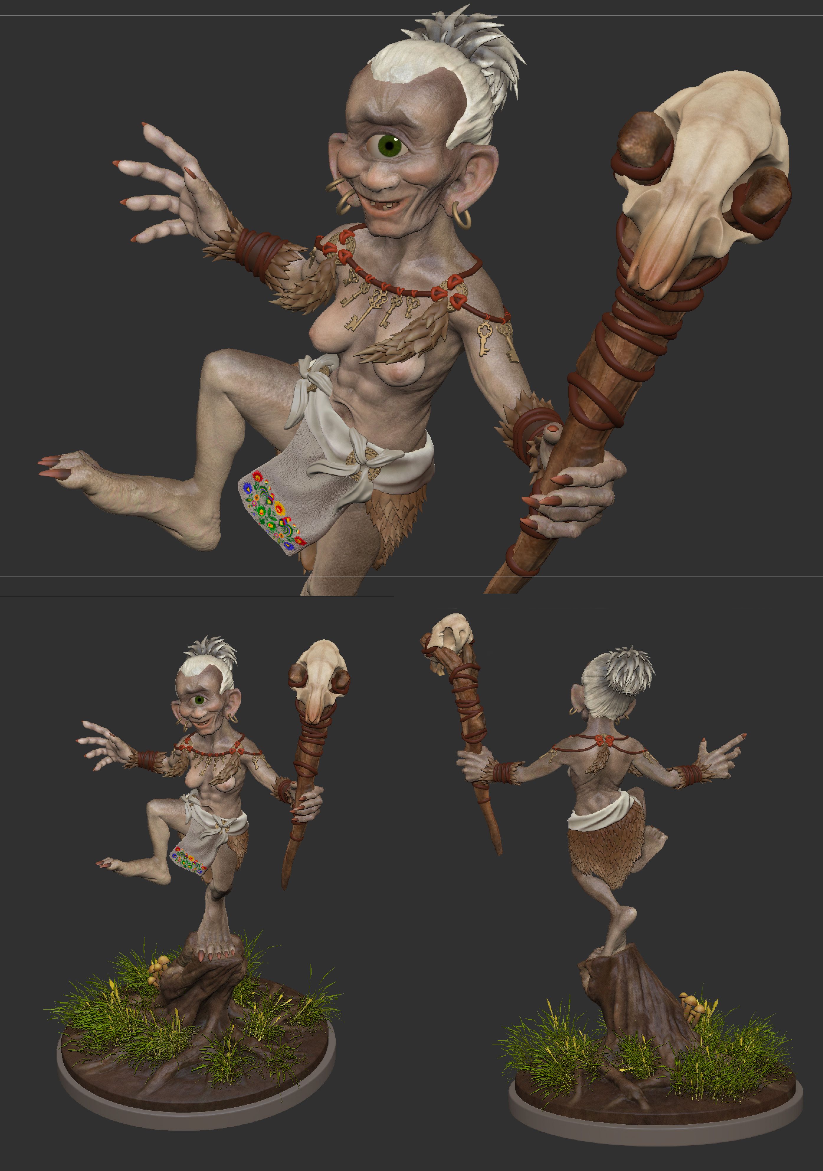 Finished at least: Here is my final project after almost 10 months of fighting, constantly interrupted by catastrophes of a private nature and capers of modern software on an old PC. According to the course specification, I should have created a goblin, but since I find the fantasy figures from Anglo-Saxon and Celtic tradition quite worn out, I interpreted a Licho. Licho (Likho) is a Slavic household demon who spoils objects with the - literally - evil eye.