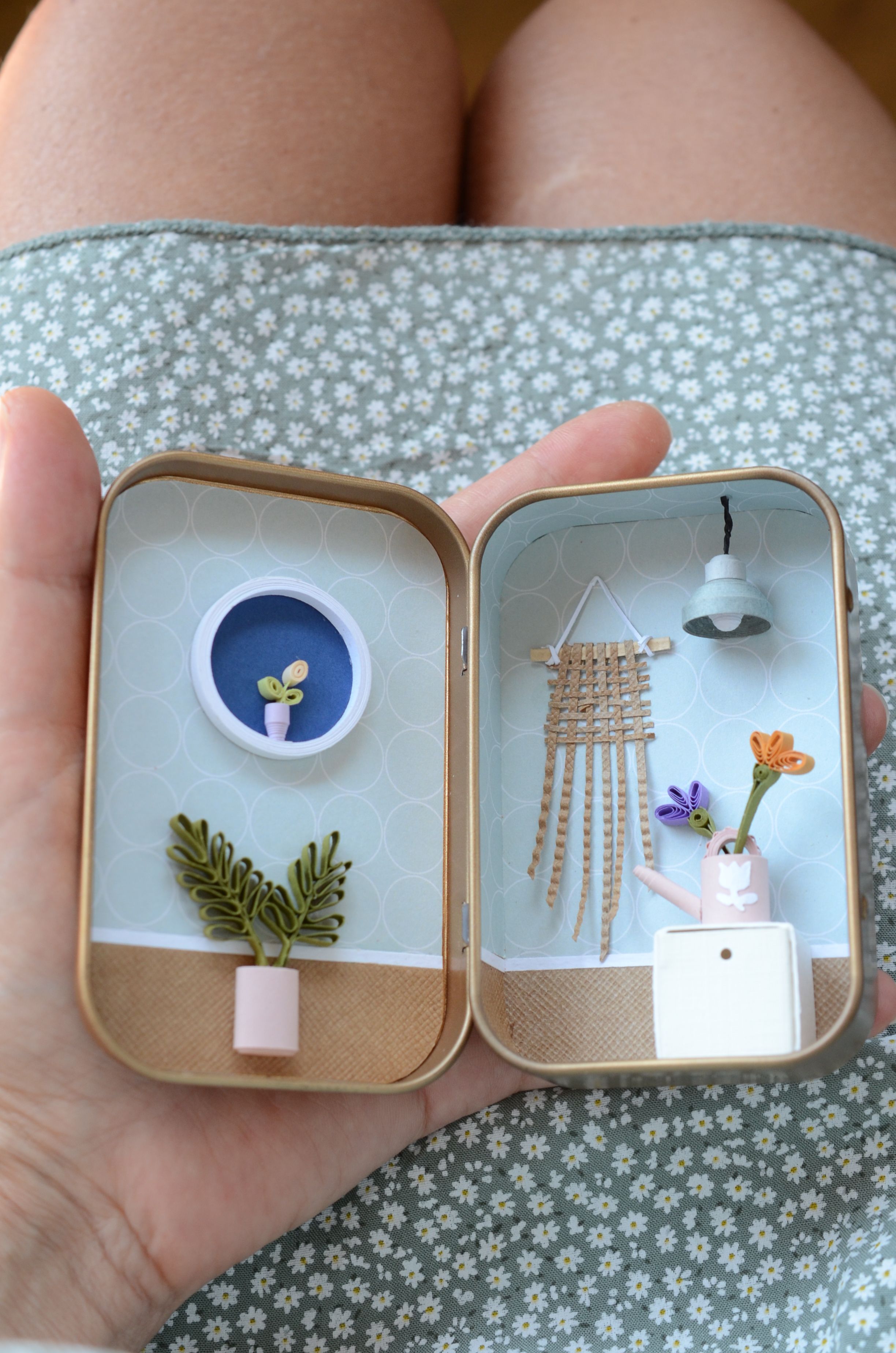 Piccola casa realizzata in carta all'interno di una scatola di latta.
