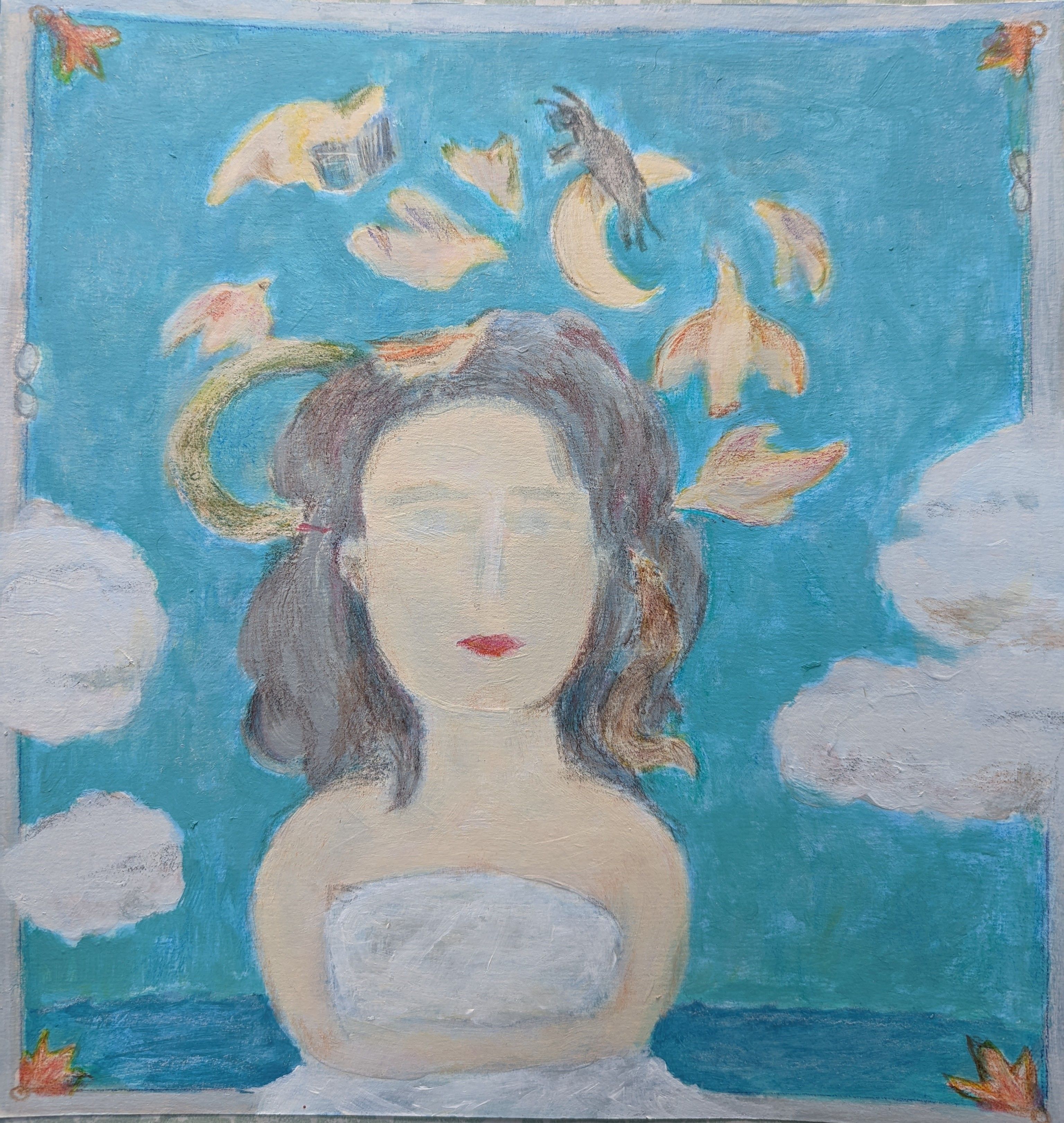 Notes: I wanted to try the clouds and sky as in the example, as the techniques are so new. I found the paint difficult to apply precisely. I used coloured pencils and gel pens to clarify. Next time, I would like to try water-based markers.