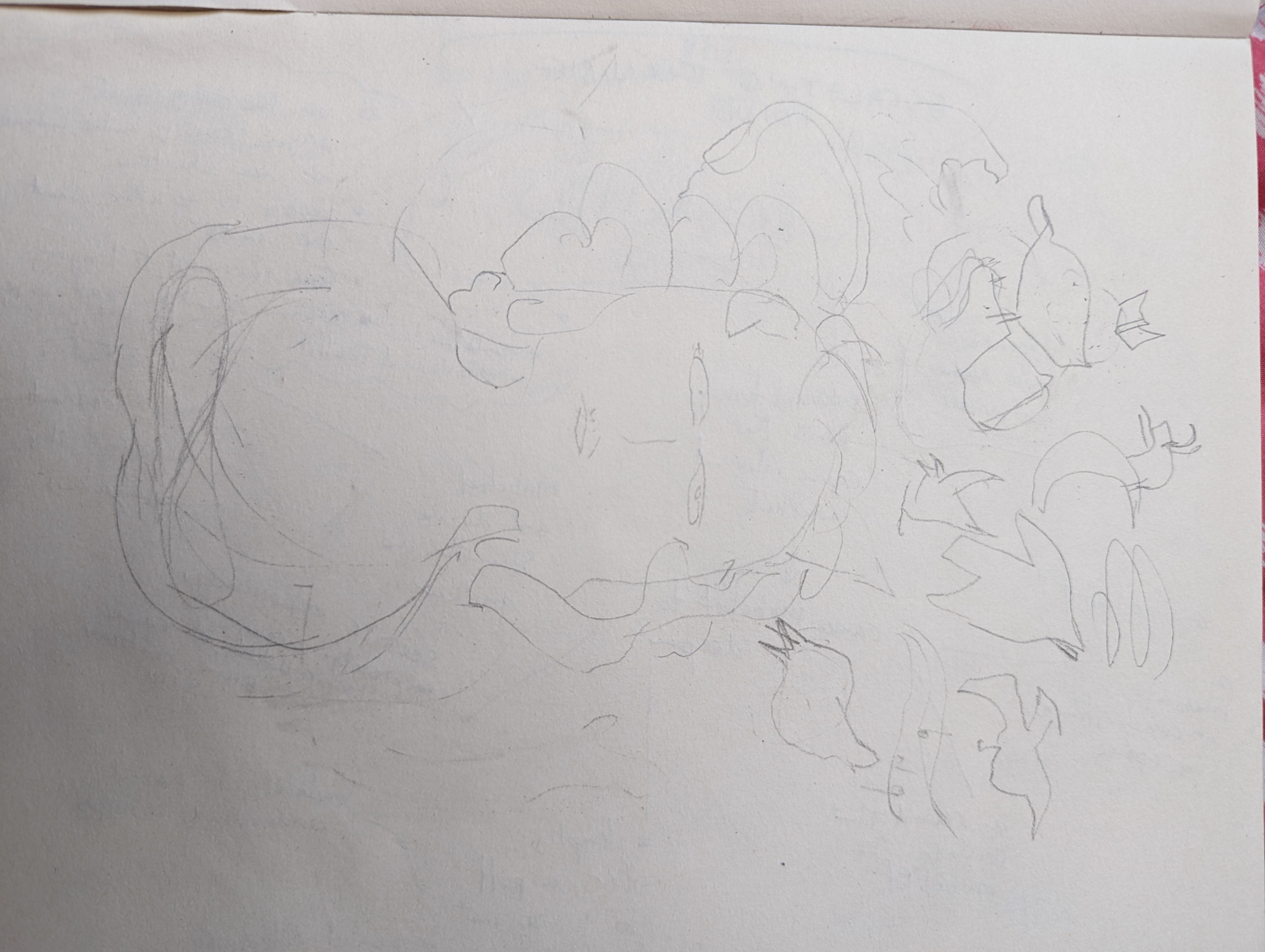 I wanted to represent the experience of my trying to listen or concentrate with ADHD: feeling hesitant and confused but also having so many ideas and sensations flying around in an exciting but tiring manner! The text says: "you're listening so closely and hearing everything."