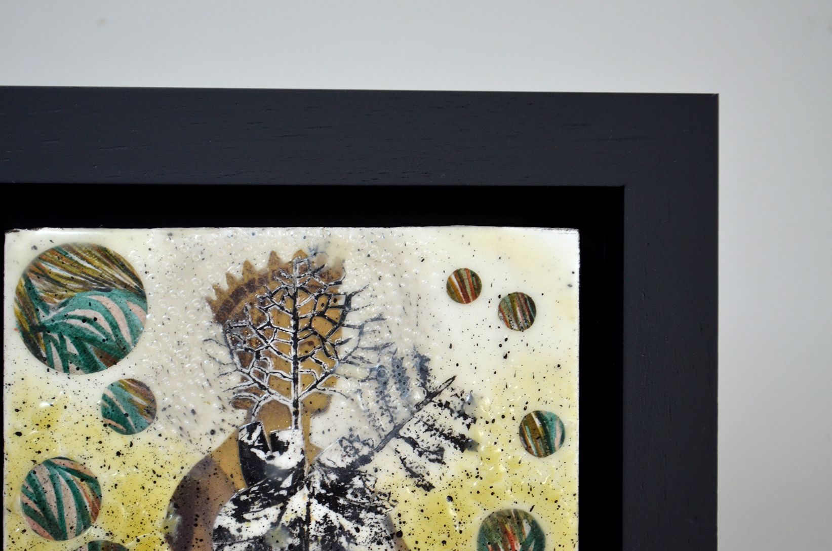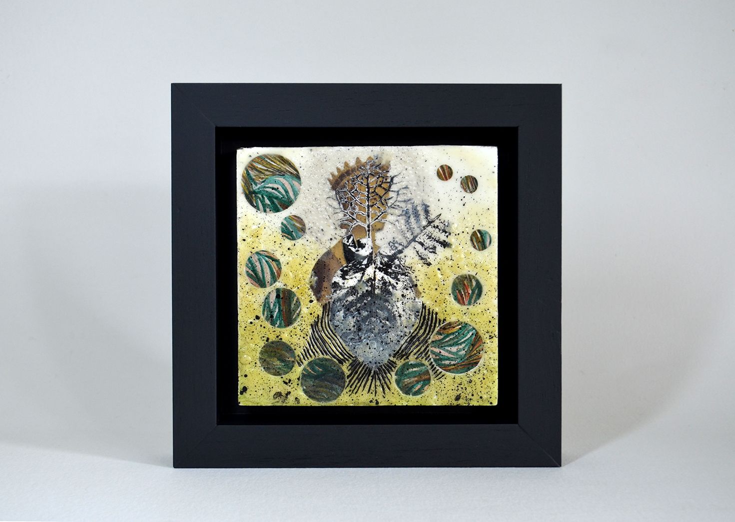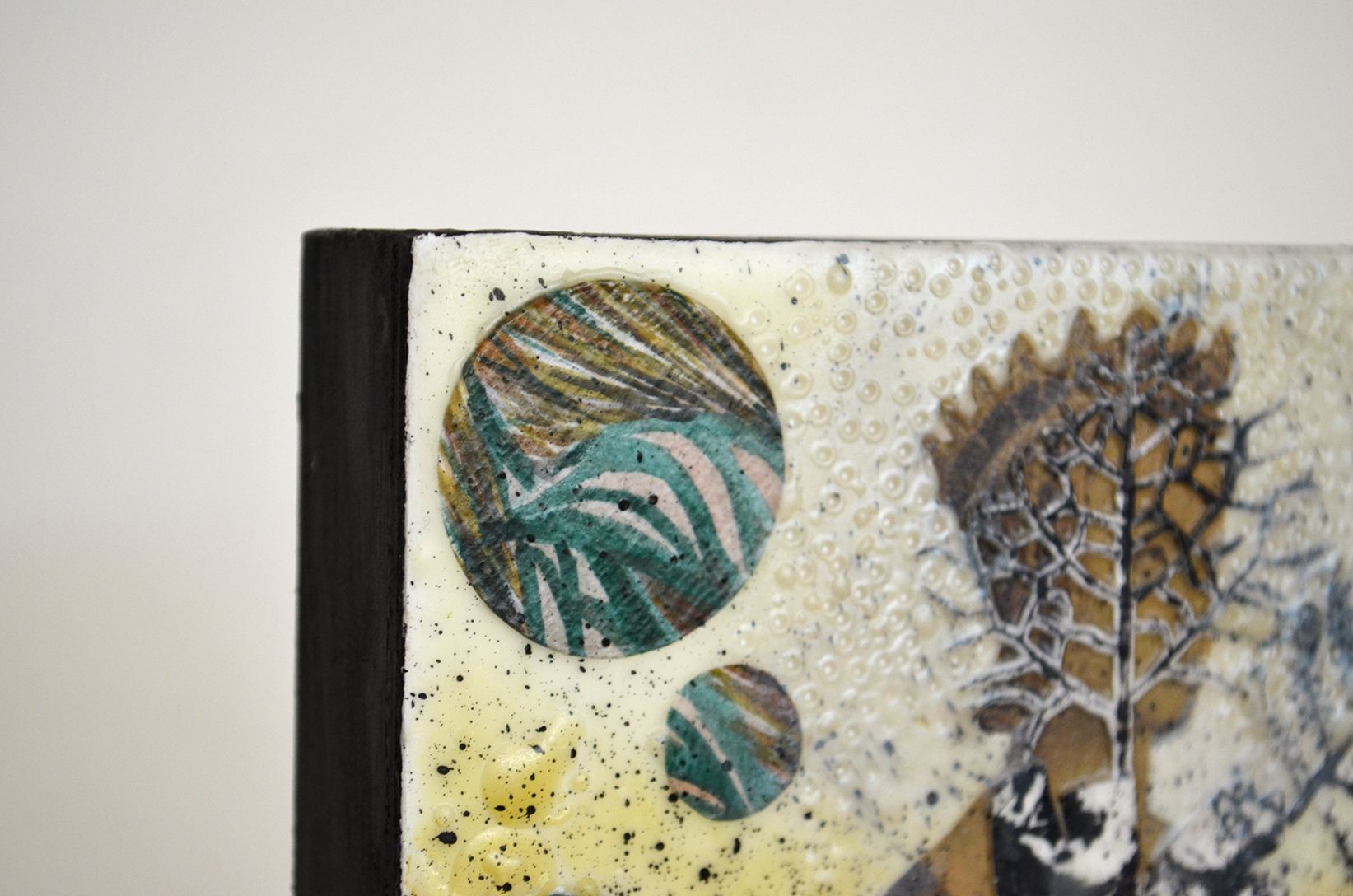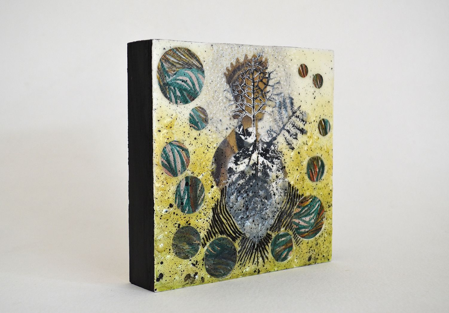 Collage Encáustico, técnica mixta sobre bastidor de madera. Titulada: Embuste del nimbo