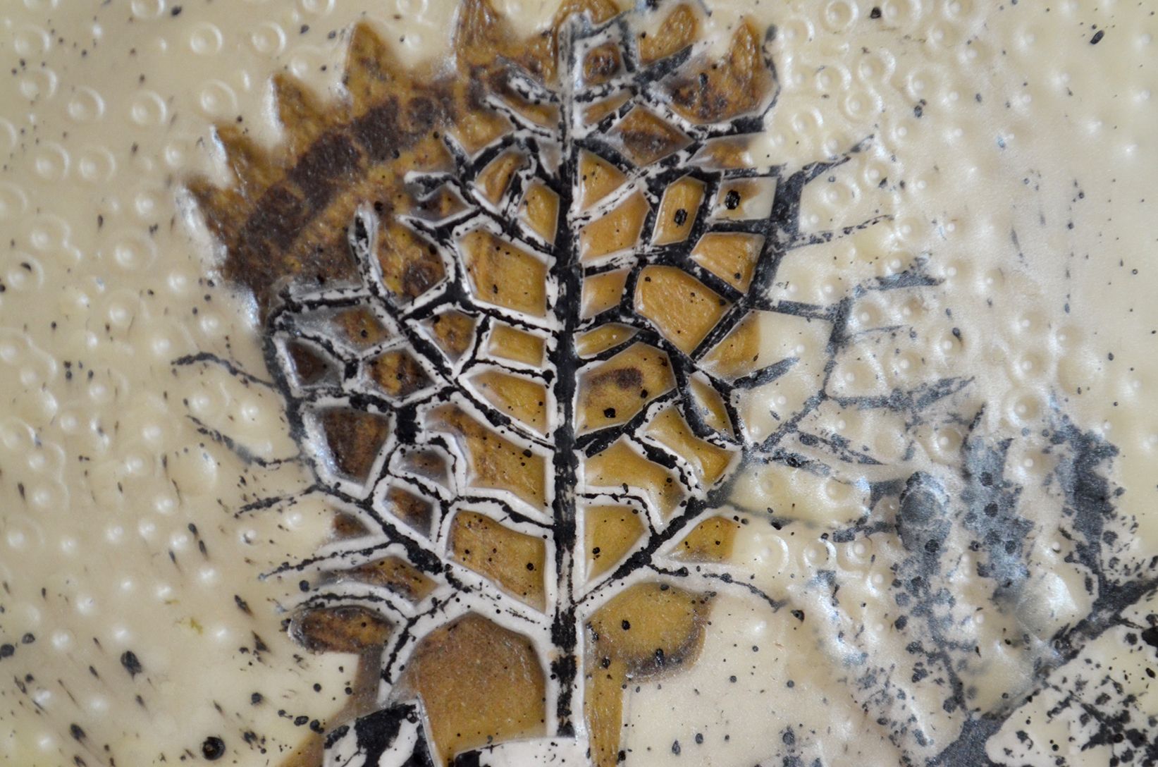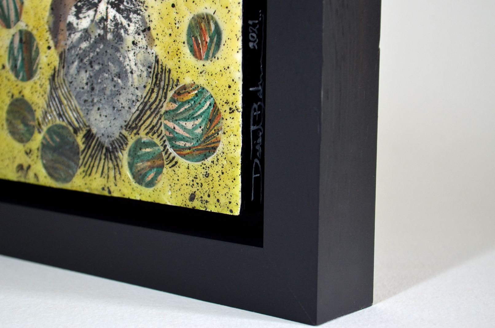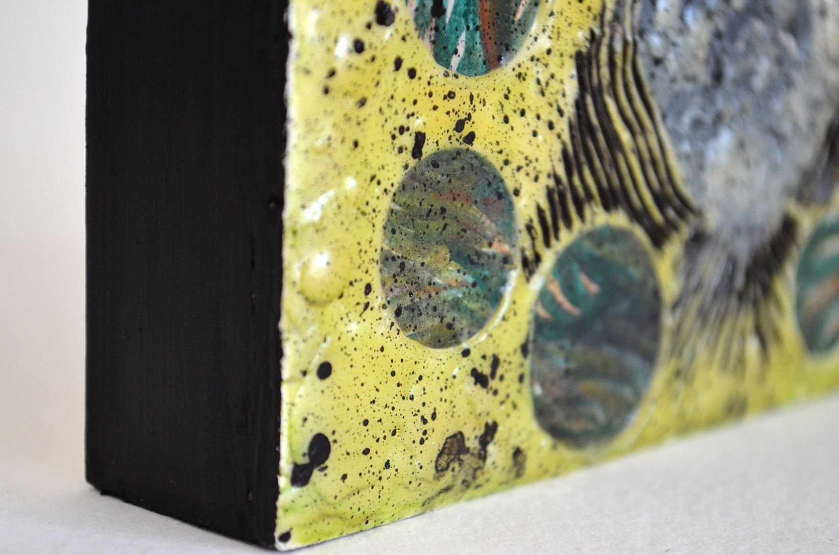 En esta pieza en pequeño formato fue interesante el proceso de desarrollo ya que me permití explorar de manera más libre con la imagen que iba construyendo en la ejecución, indudablemente el introducir una base cromática a la cual no estoy tan habituado a desbordar, también fue un hecho interesante, así como la unificación de las texturas y carvados que fui determinando capa a capa. La primera capa fue lo que me dio la pauta para poder transgredir la imagen que hasta cierto punto me parecía formal y correcta en realizar, sin embargo, me gusta inducir procesos provocativos que laceren los estados extremos moralistas del humano condicionando todo por su paso. Esa premisa posiblemente iracunda me impulsa a asociar mi obra con un estado de conciencia más libre y sin pretensiones como lo he venido siendo desde que supe que me dedicaría a ser artista y creador de imágenes en este plano.