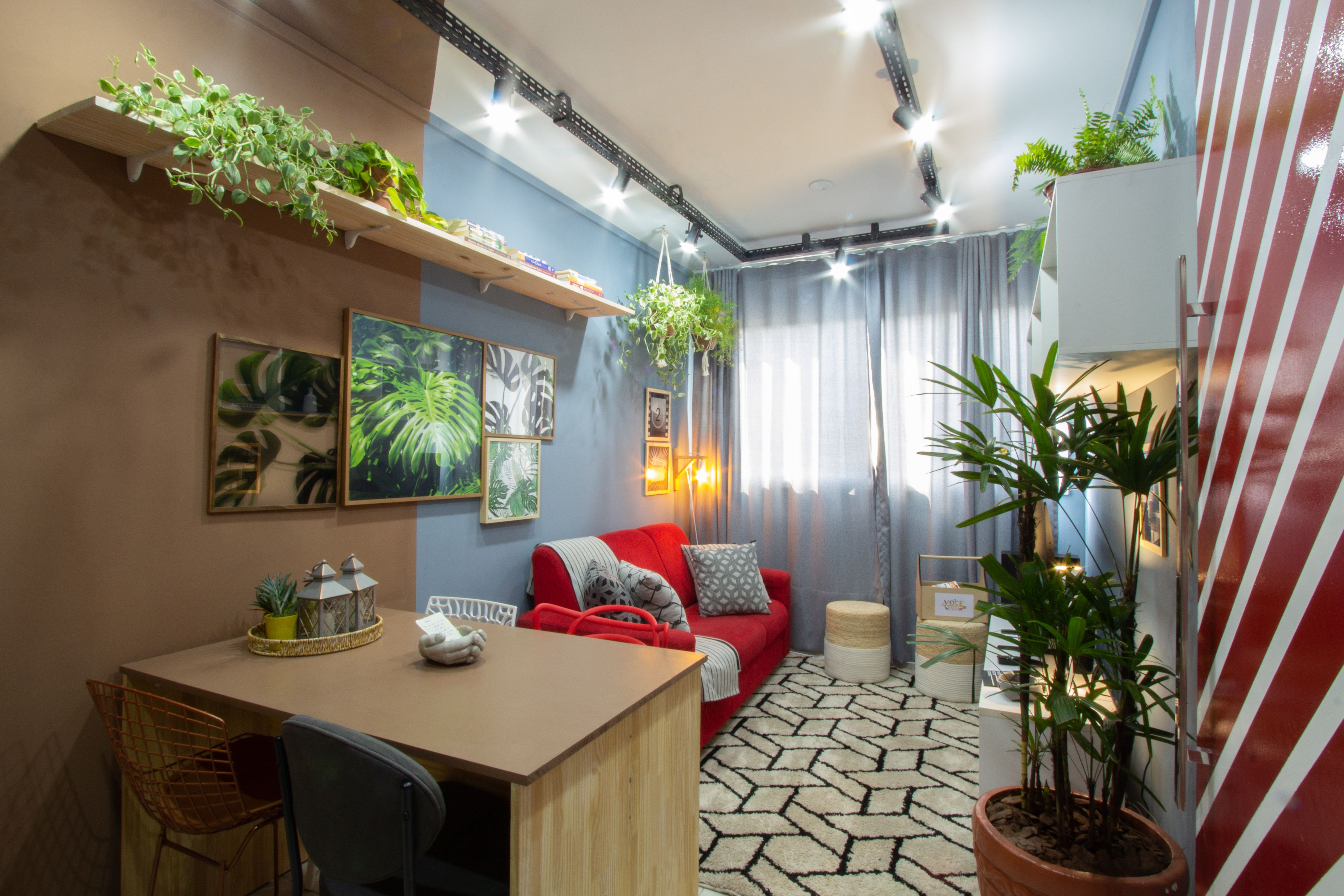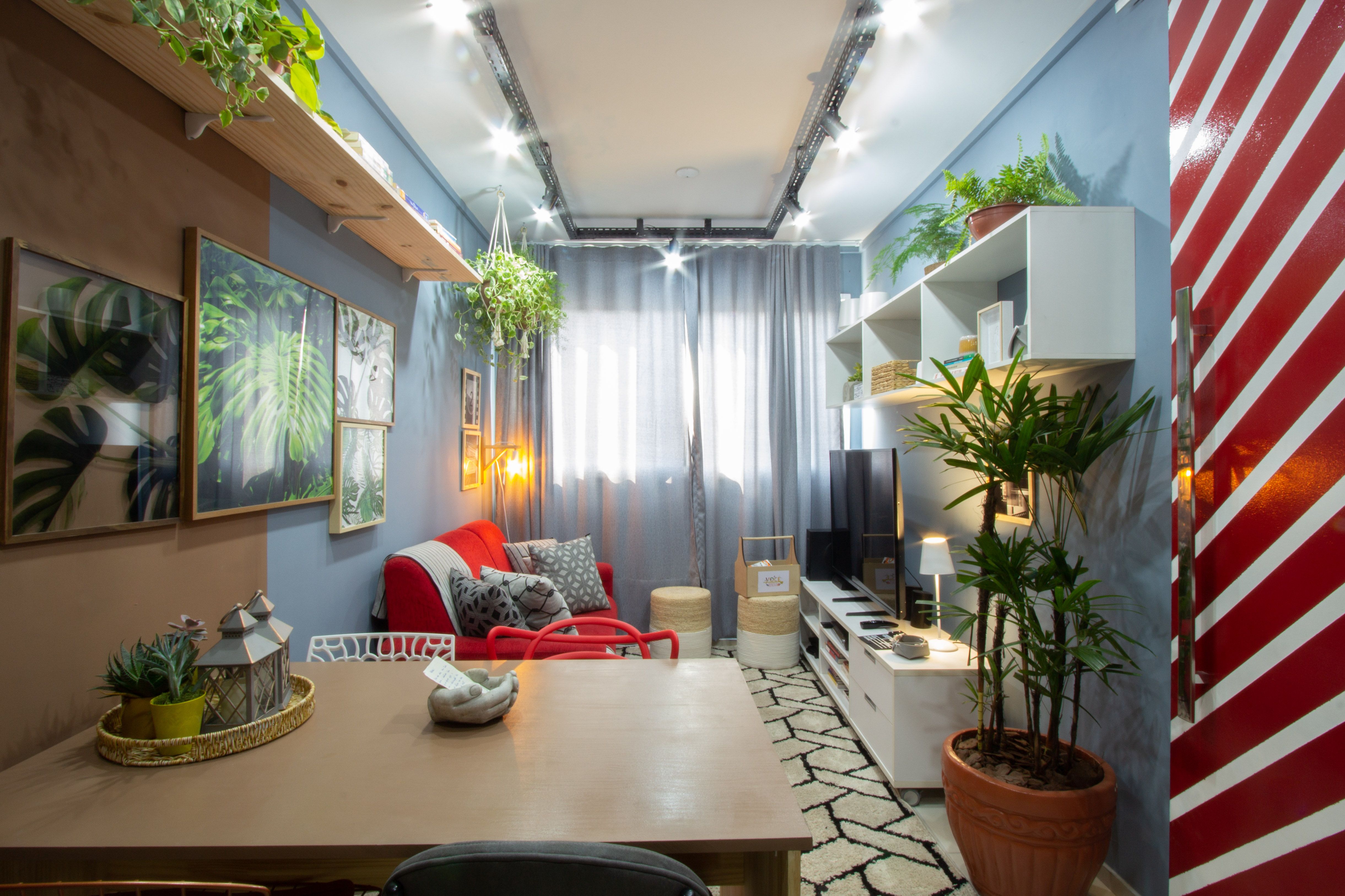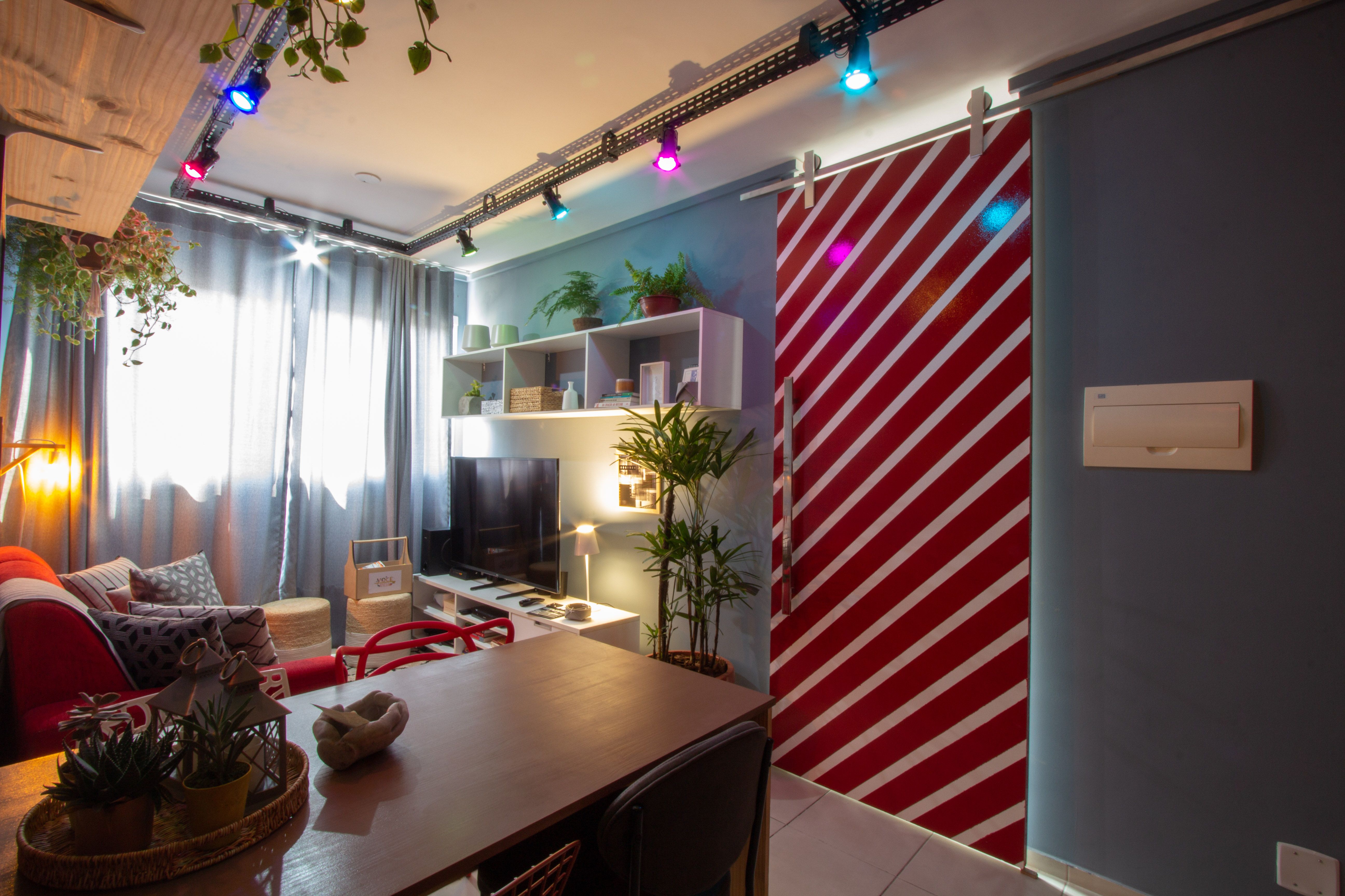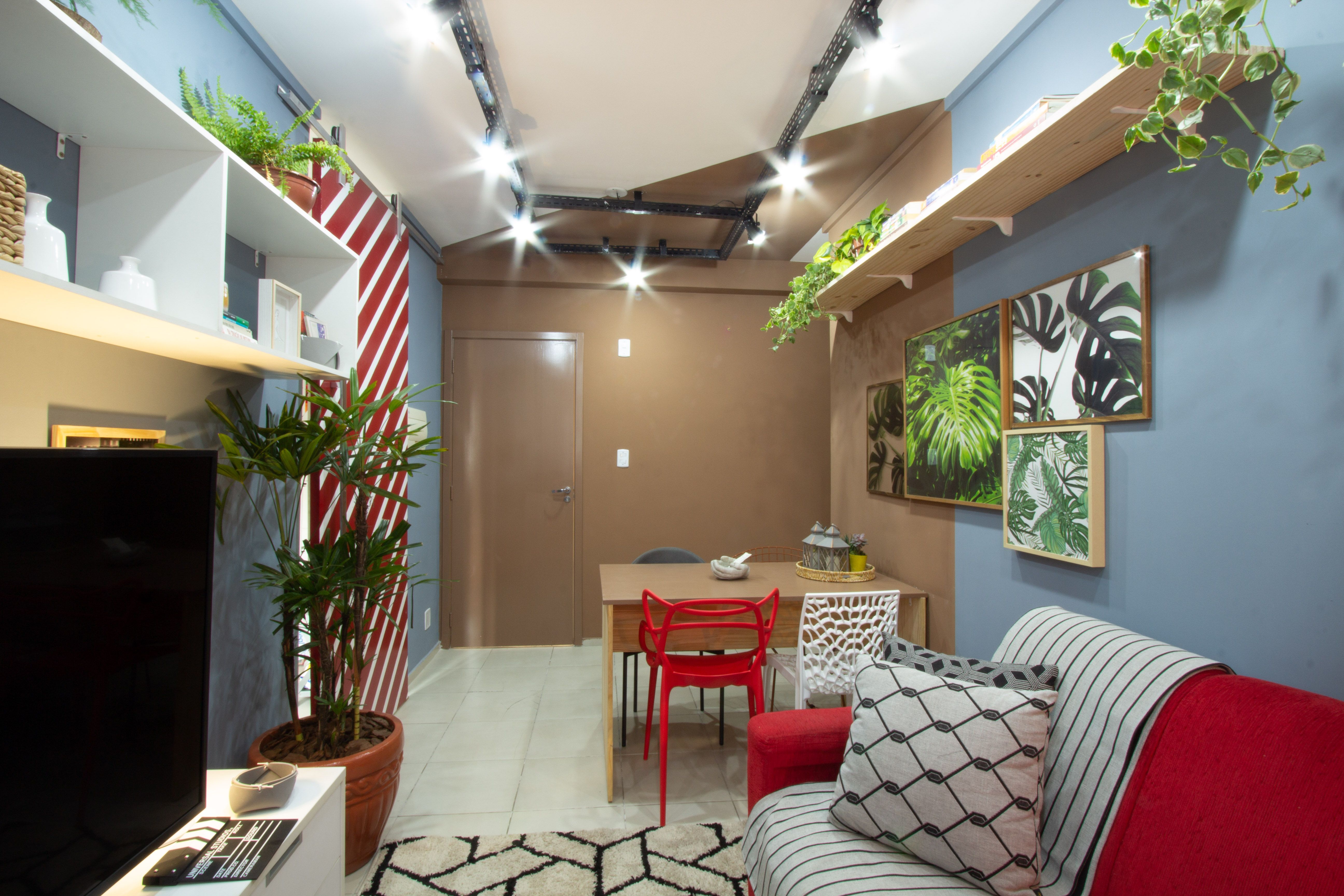 Sala de estar e jantar. Um palco para o shows do trio que mora nela. São Paulo/SP
