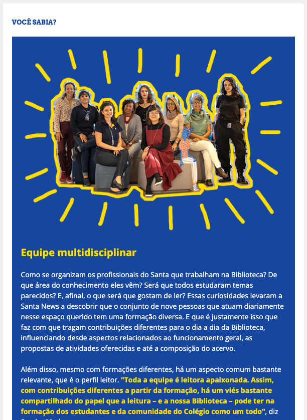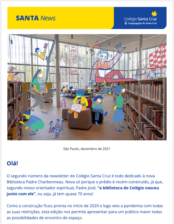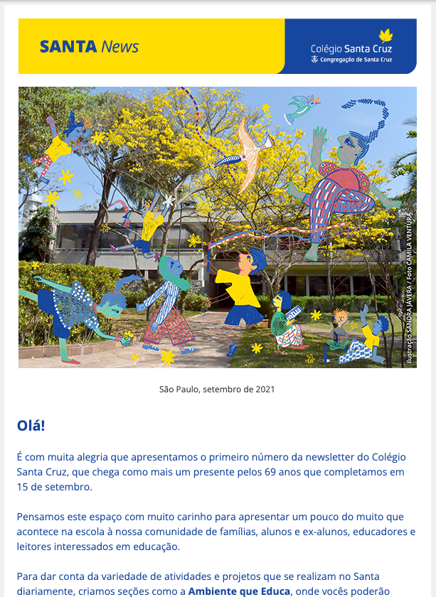 Para dar conta da variedade de atividades e projetos que acontecem no Colégio Santa Cruz, o Estúdio Voador foi convidado a criar uma newsletter voltada a famílias, alunos e ex-alunos, educadores e leitores interessados em educação.