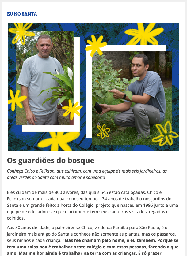 Para a primeira edição, criamos seções como a Ambiente que Educa, onde é possível conhecer o Programa de Ampliação da Diversidade Racial e Ações Antirracistas. Na seção Eu no Santa, o campus é apresentado pela dupla de jardineiros Chico e Felikson.