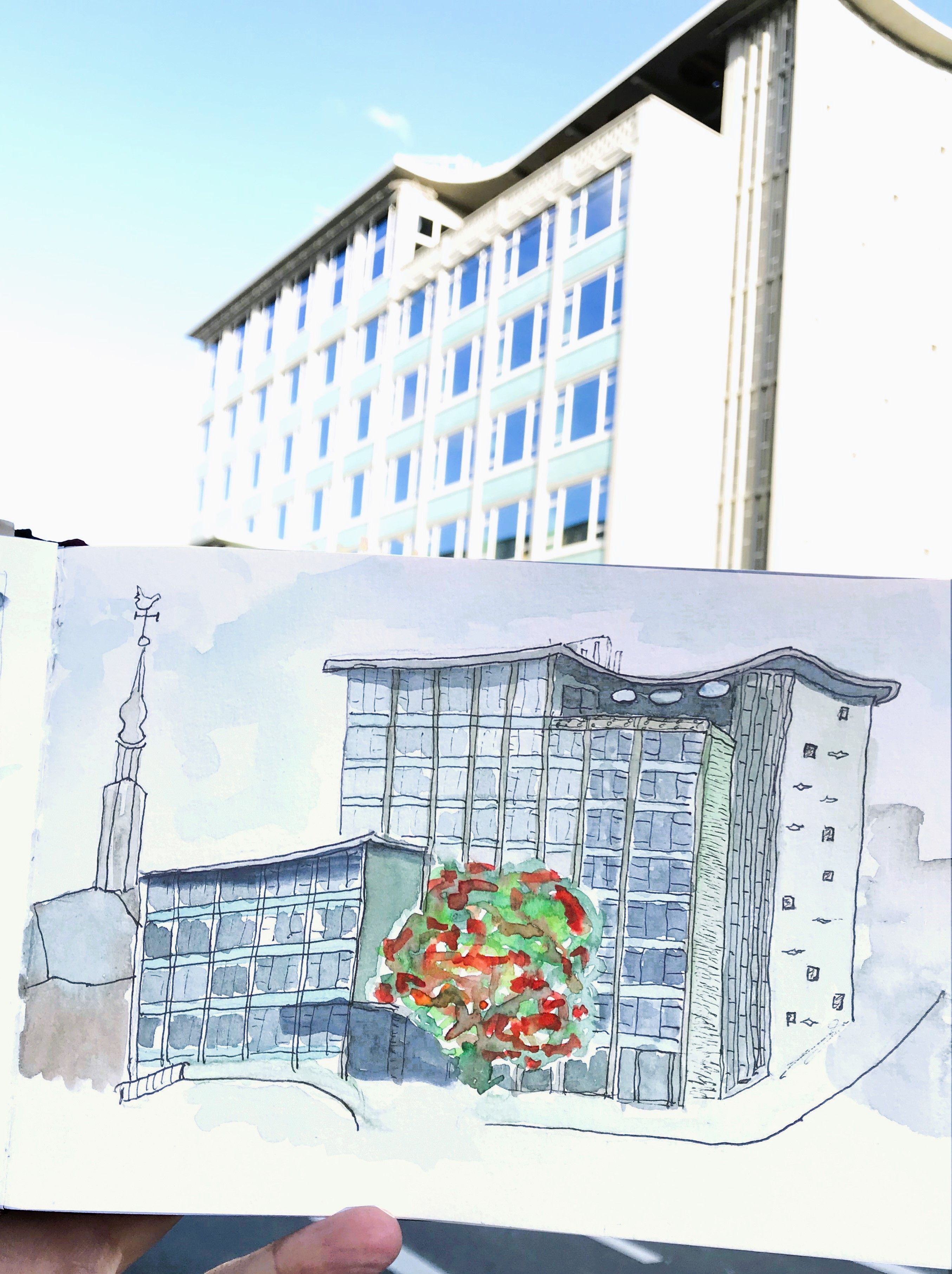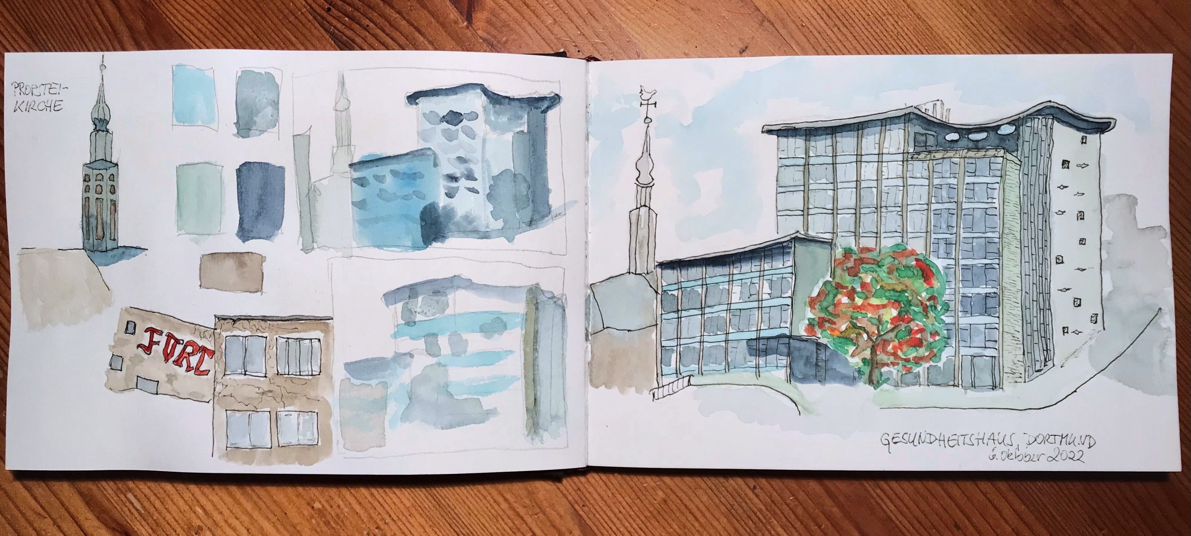 Ich habe das ehemalige Gesundheitshaus in der Dortmunder Innenstadt gemalt. Es ist in meinen Augen ein sehr beeindruckender 50er Jahre Bau. Die Skizzen auf der linken Seite sind teilweise sehr schnell entstanden. Ich hatte nur zwei Stunden Zeit.