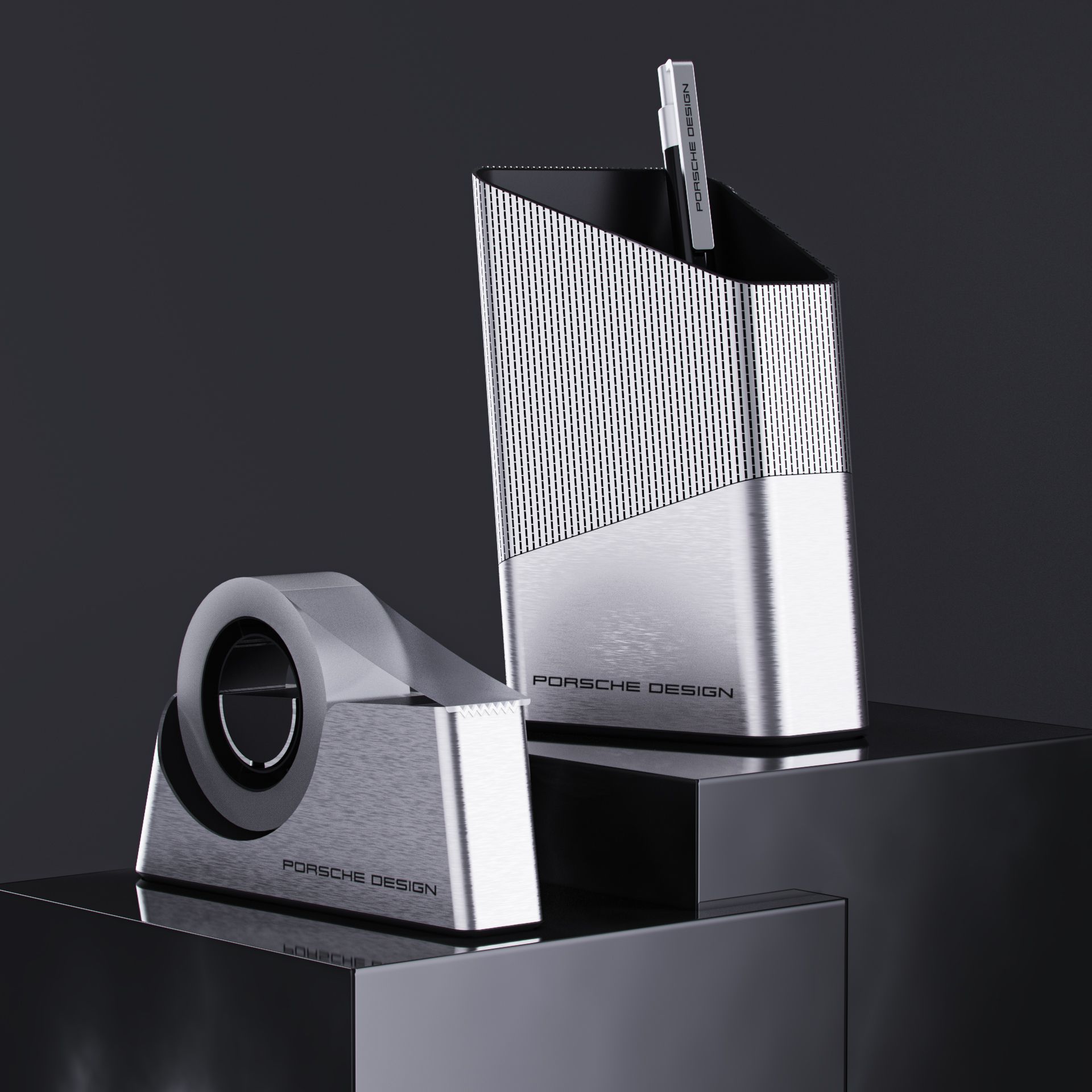 Elementos de oficina (Scotch tape, pencil holder) para la marca Porsche Design.