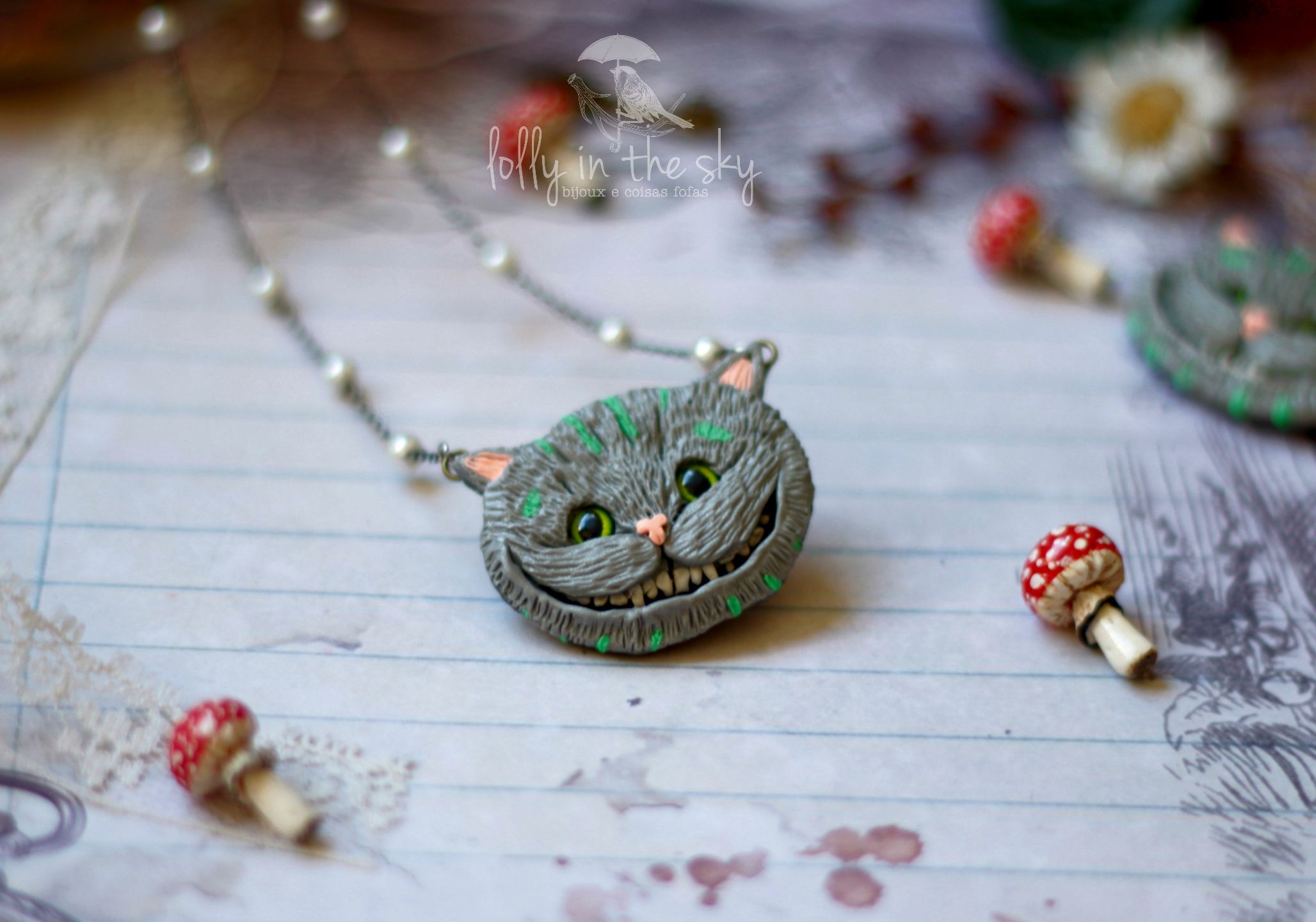 Colar inspirado na versão do gato risonho dos filmes de Tim Burton